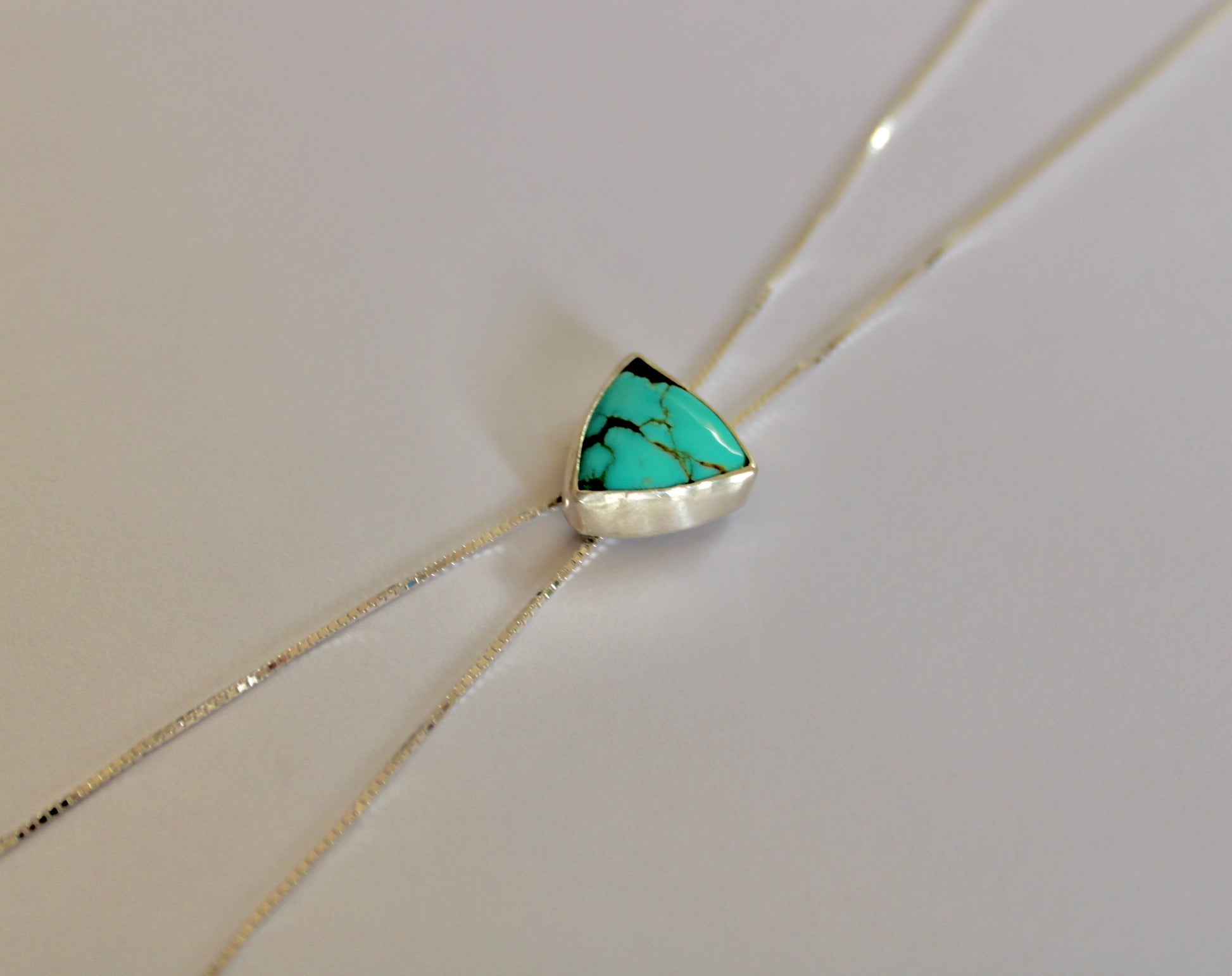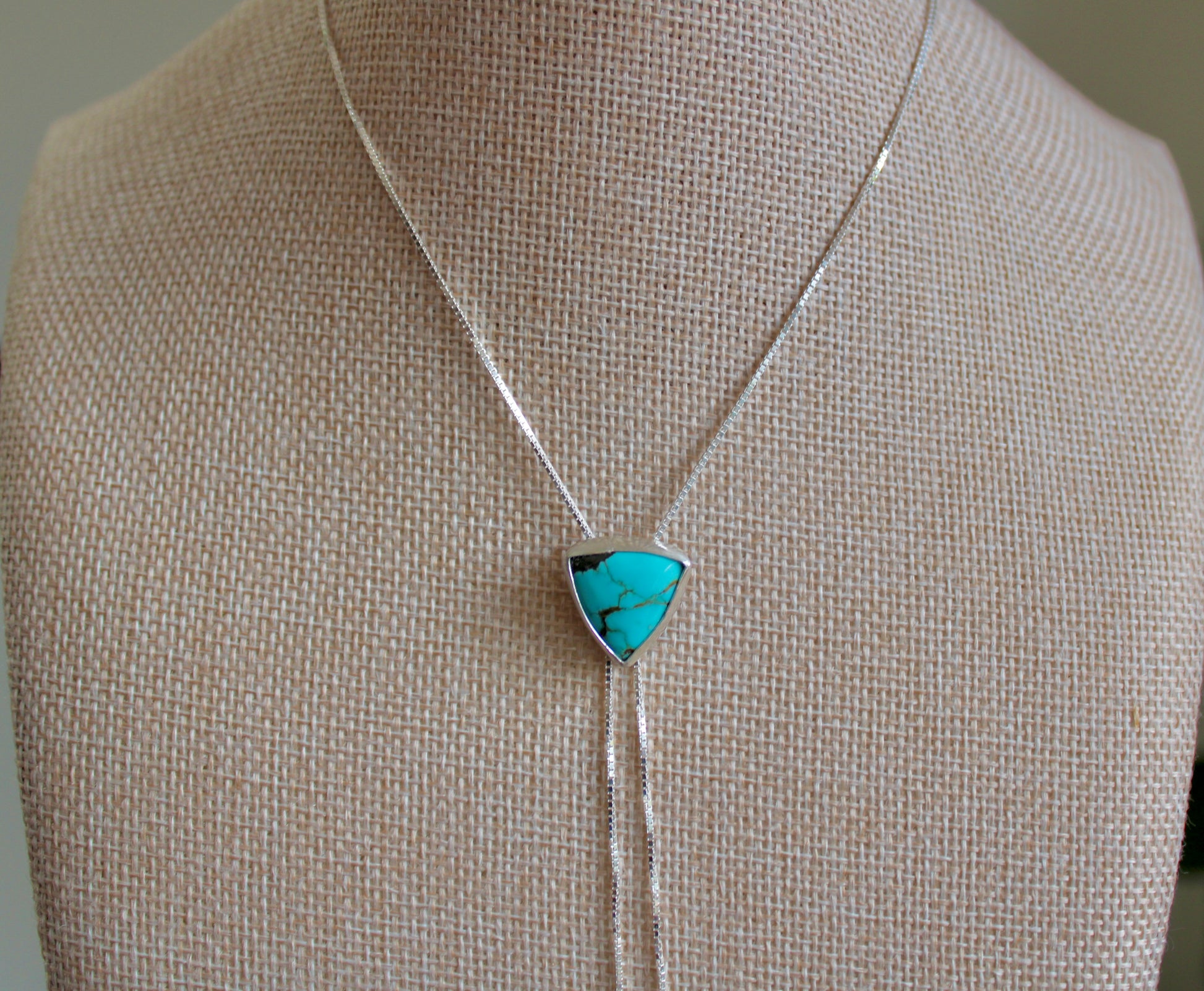 Number 8 Turquoise Bolo Necklace 28 inches, adjustable. Sterling Silver Venetian Box chain 1MM. Sterling Lobster clasp.