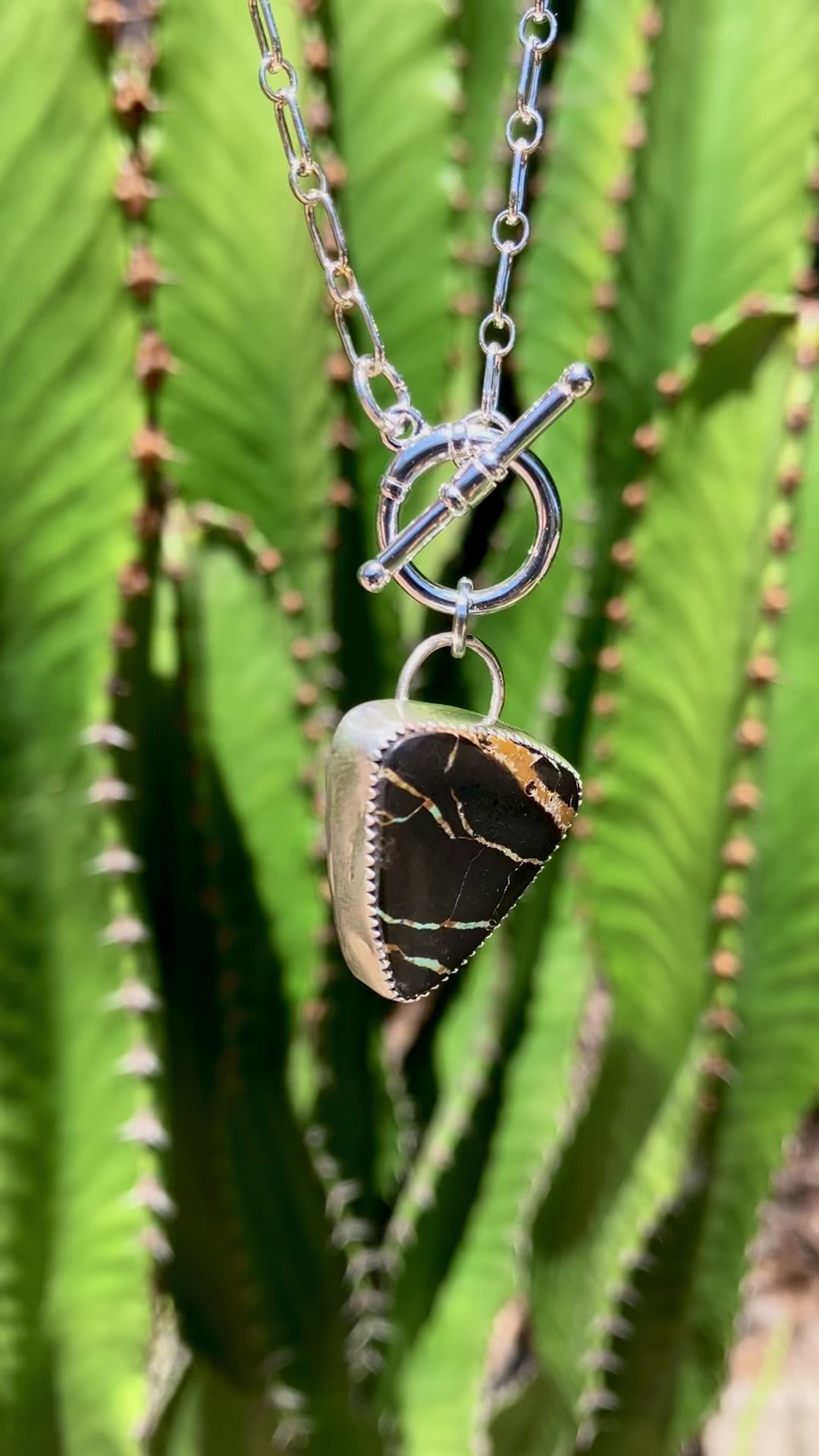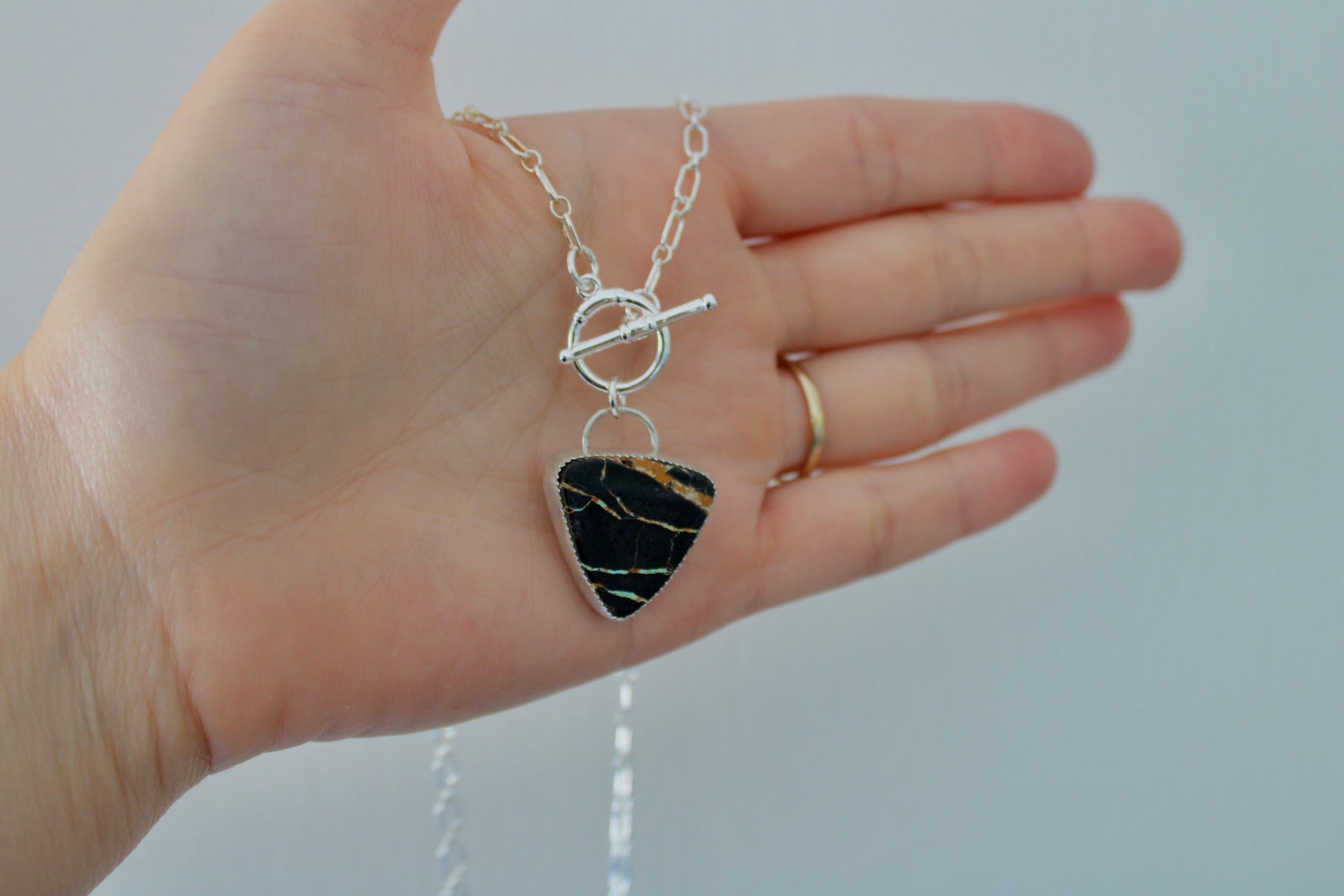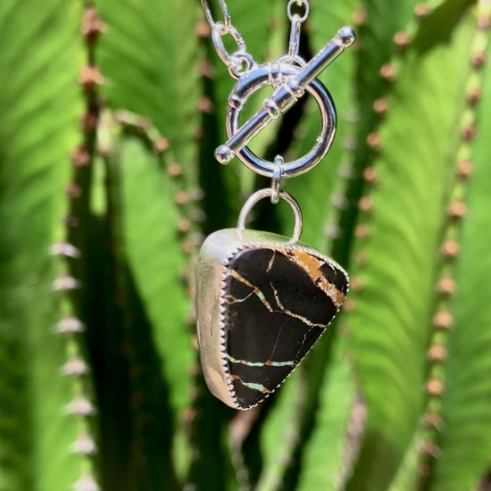 Toggle necklace with Blackjack Turquoise. Lobster clasp, chain is Sterling Silver with patterened cable chain 18 inches.