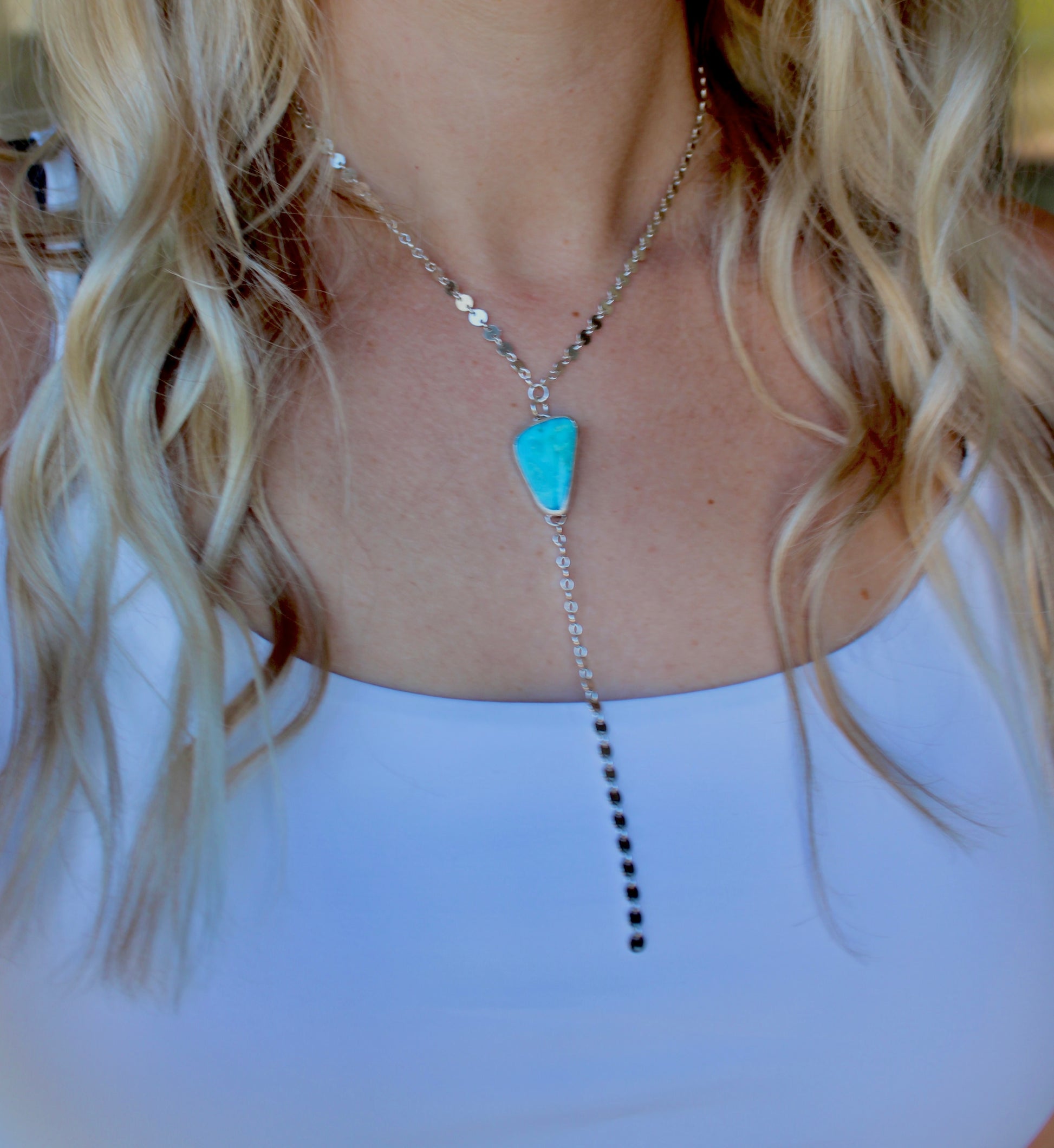 Blue Gem Turquoise Necklace set in Sterling Silver on a 16 inch Sterling chain. 3.5 additional inches of hanging chain from Turquoise.