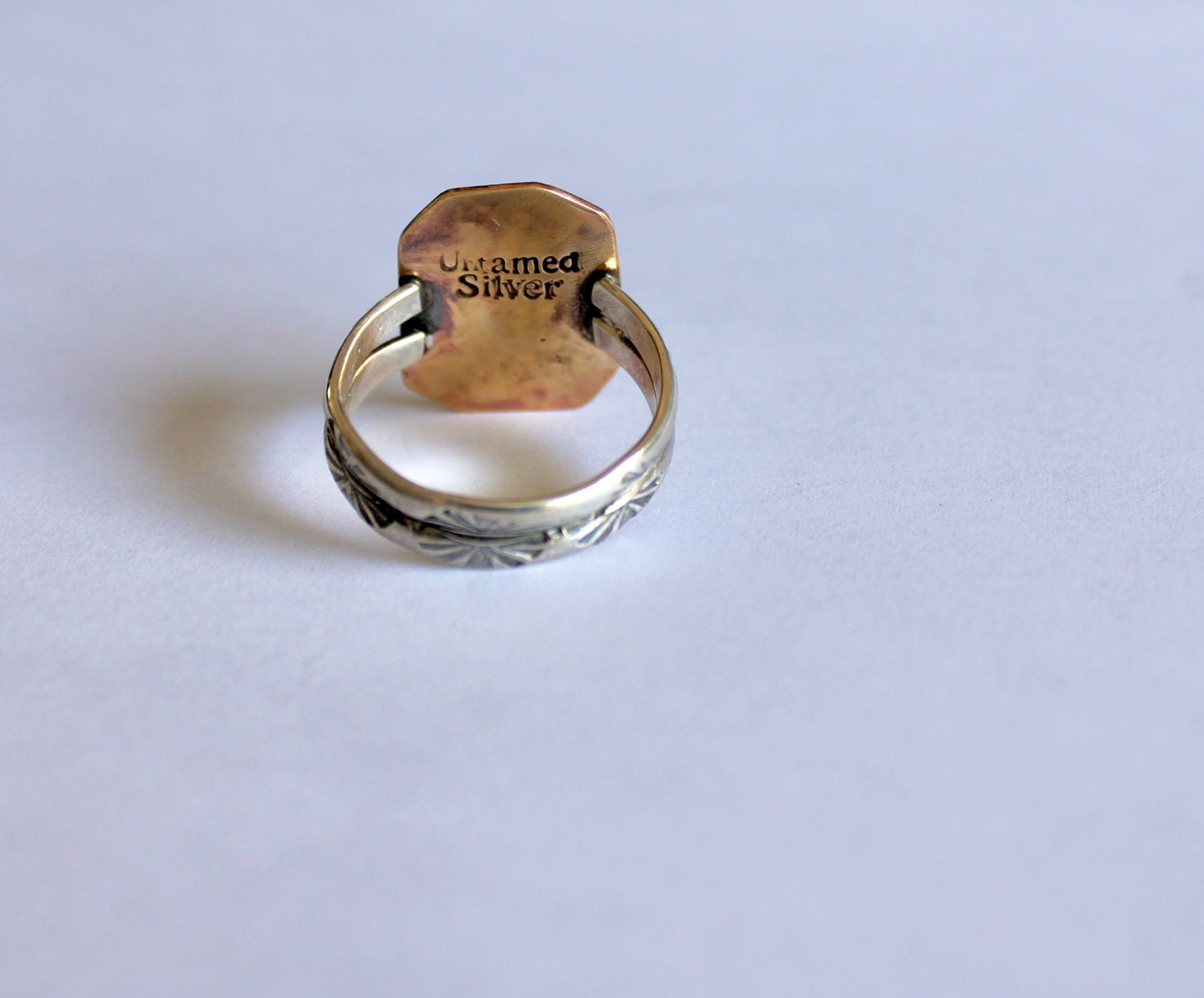 Sterling Silver Ring band hand stamped. Cactus and star are Sterling Silver soldered into a jeweled brass base. Size 9, not adjustable.