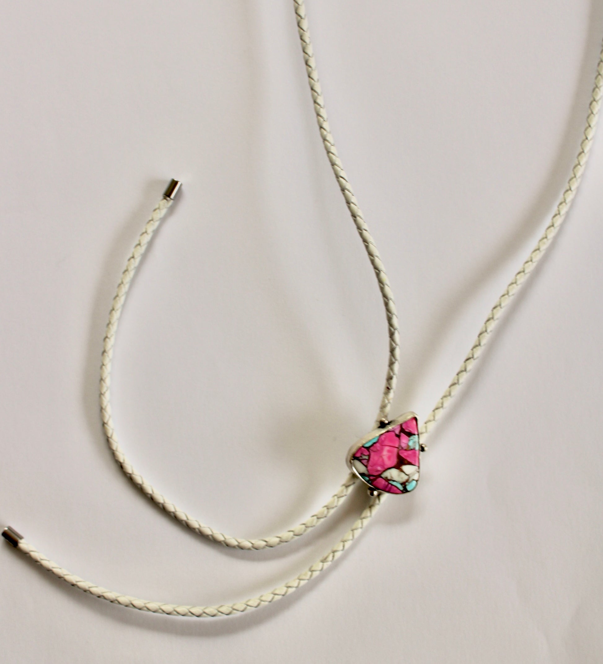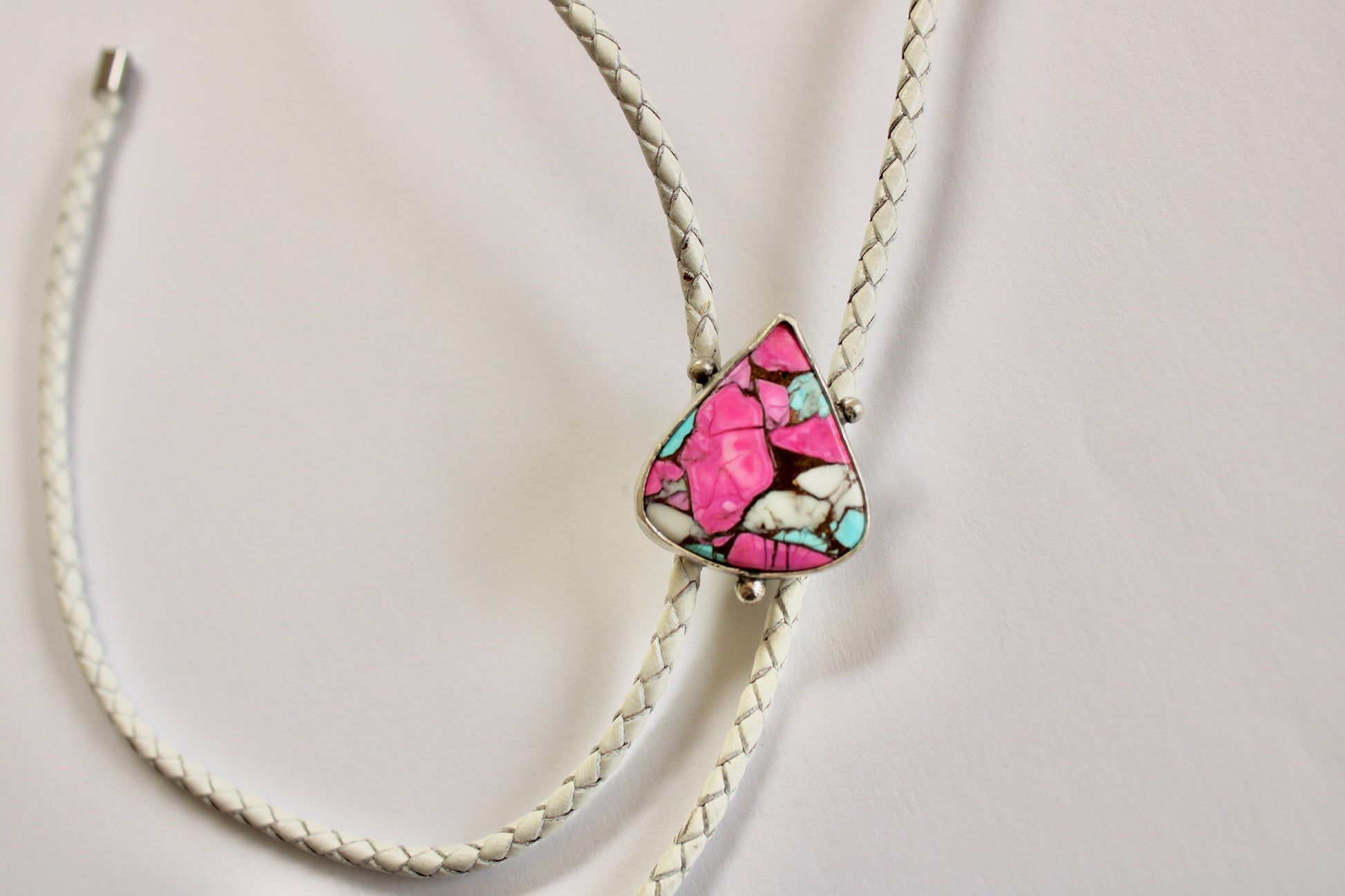 Cotton Candy Pink Dahlia Bolo Tie. Adjustable by bolo, made from Sterling Silver. Bolo cord is 3MM and 42inches, white bolo cord. Bolo slider made from steel.