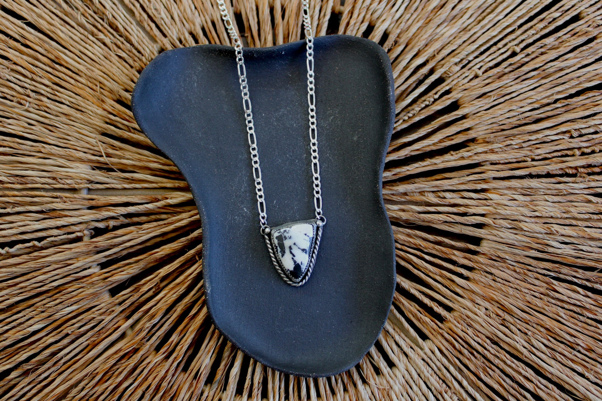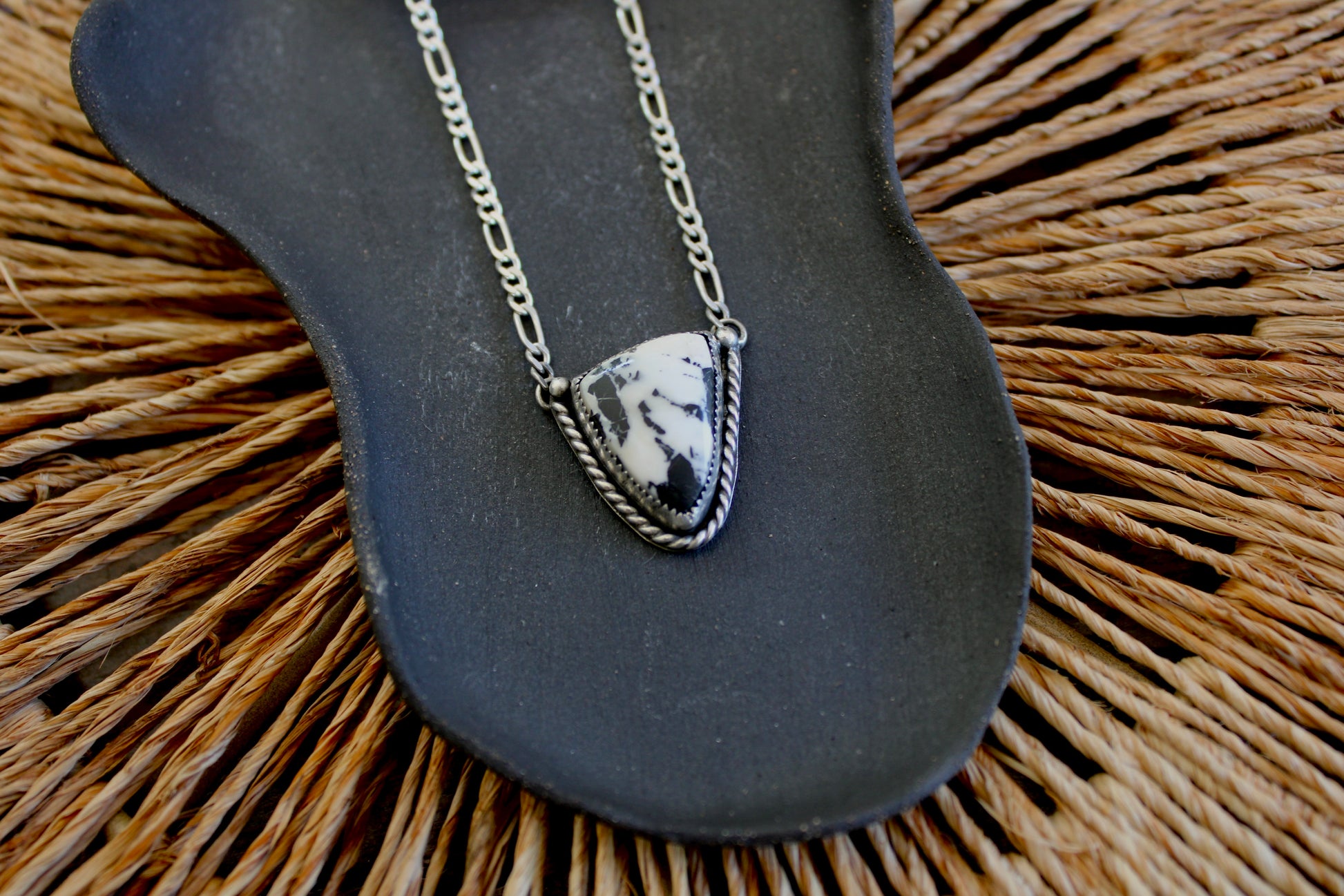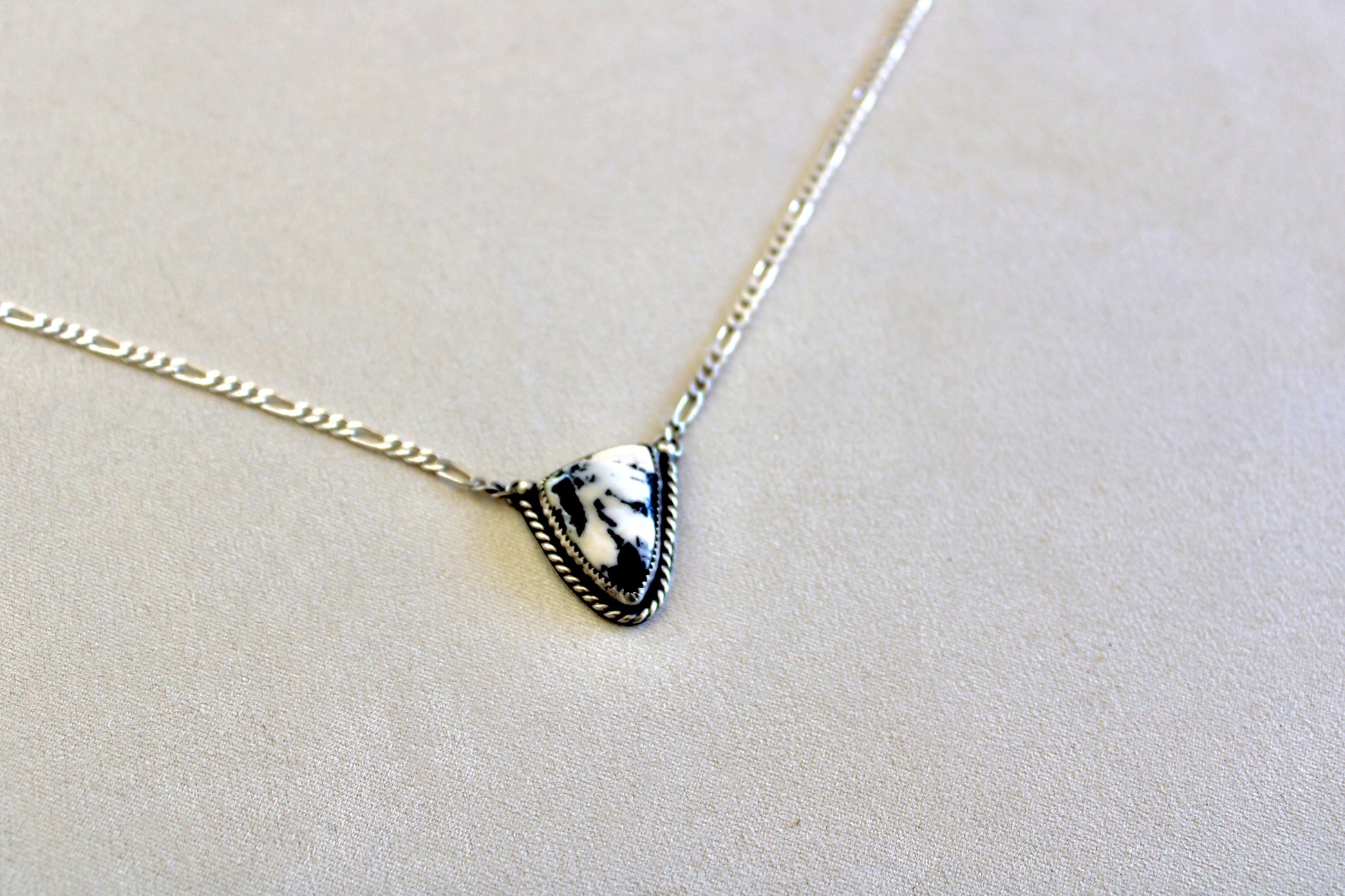 Sterling Silver Necklace with White Buffalo Turquoise on a 16 inch Sterling Silver Figaro Chain 3.2MM. Sterling Lobster Clasp.