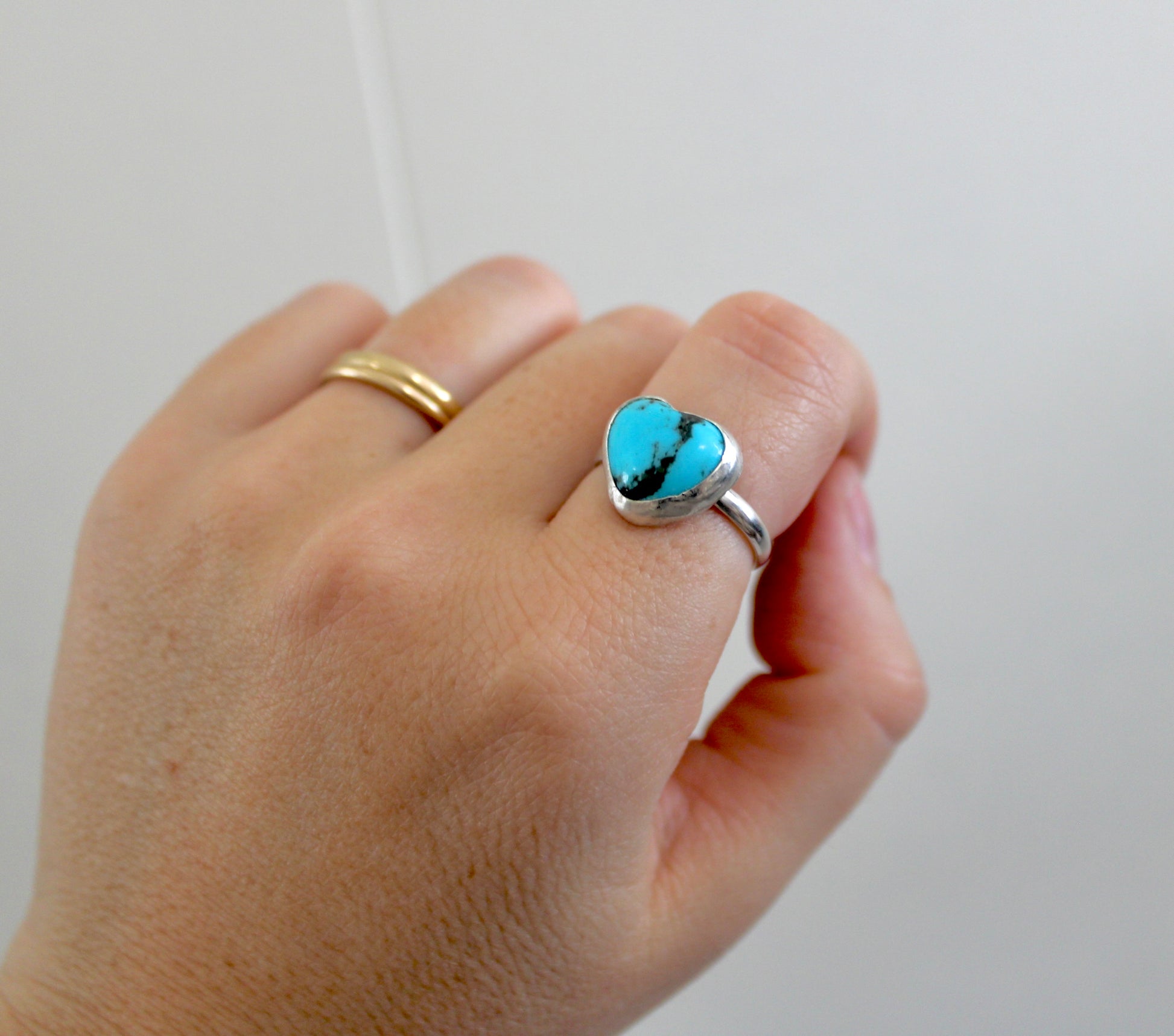 Kingman Turquoise heart set in Sterling Silver. Size 7.5