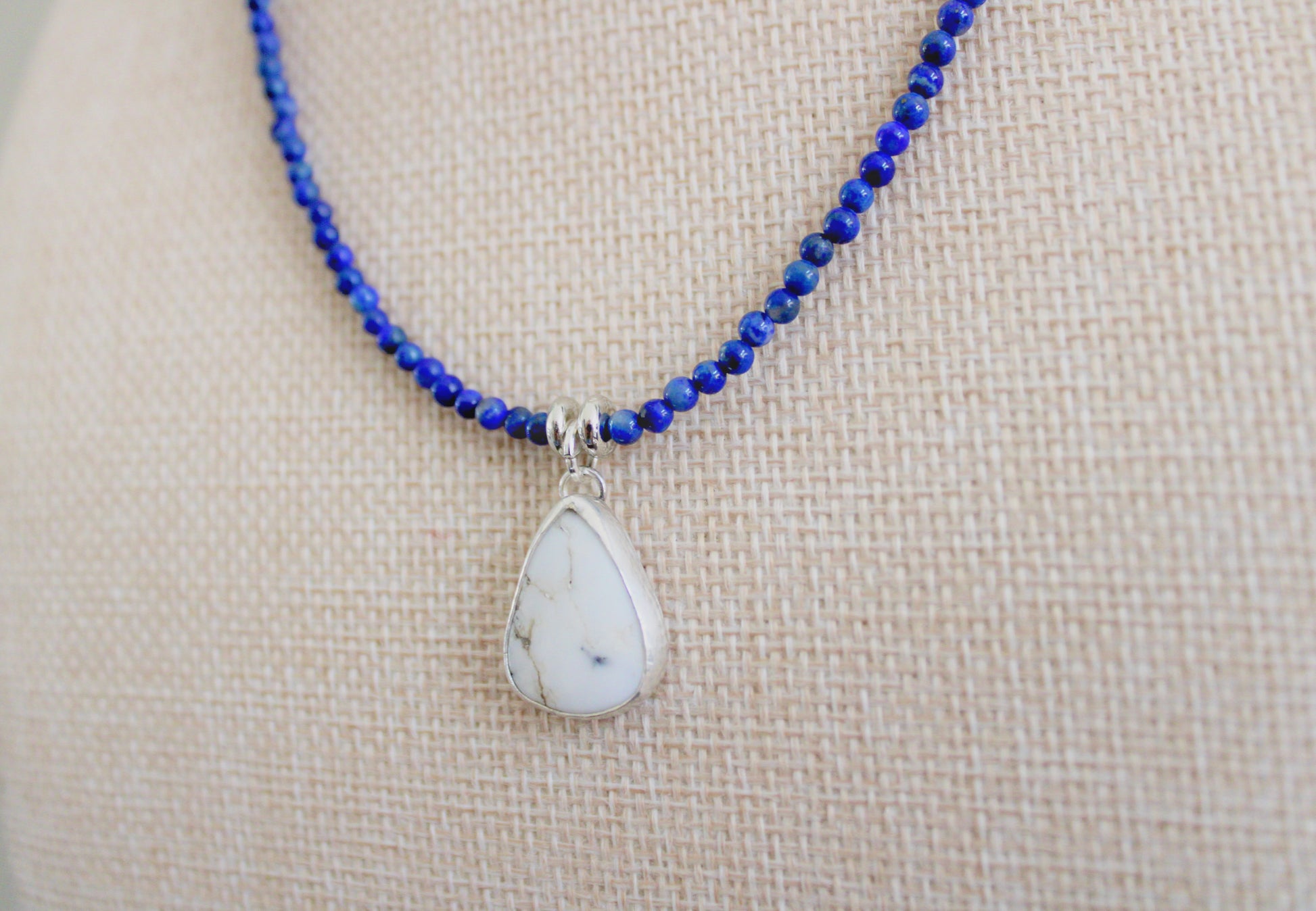 Lapis Lazuli beaded necklace 16 inches, lobster clasp. Pendant made from Sterling Silver with White Buffalo Turquoise.