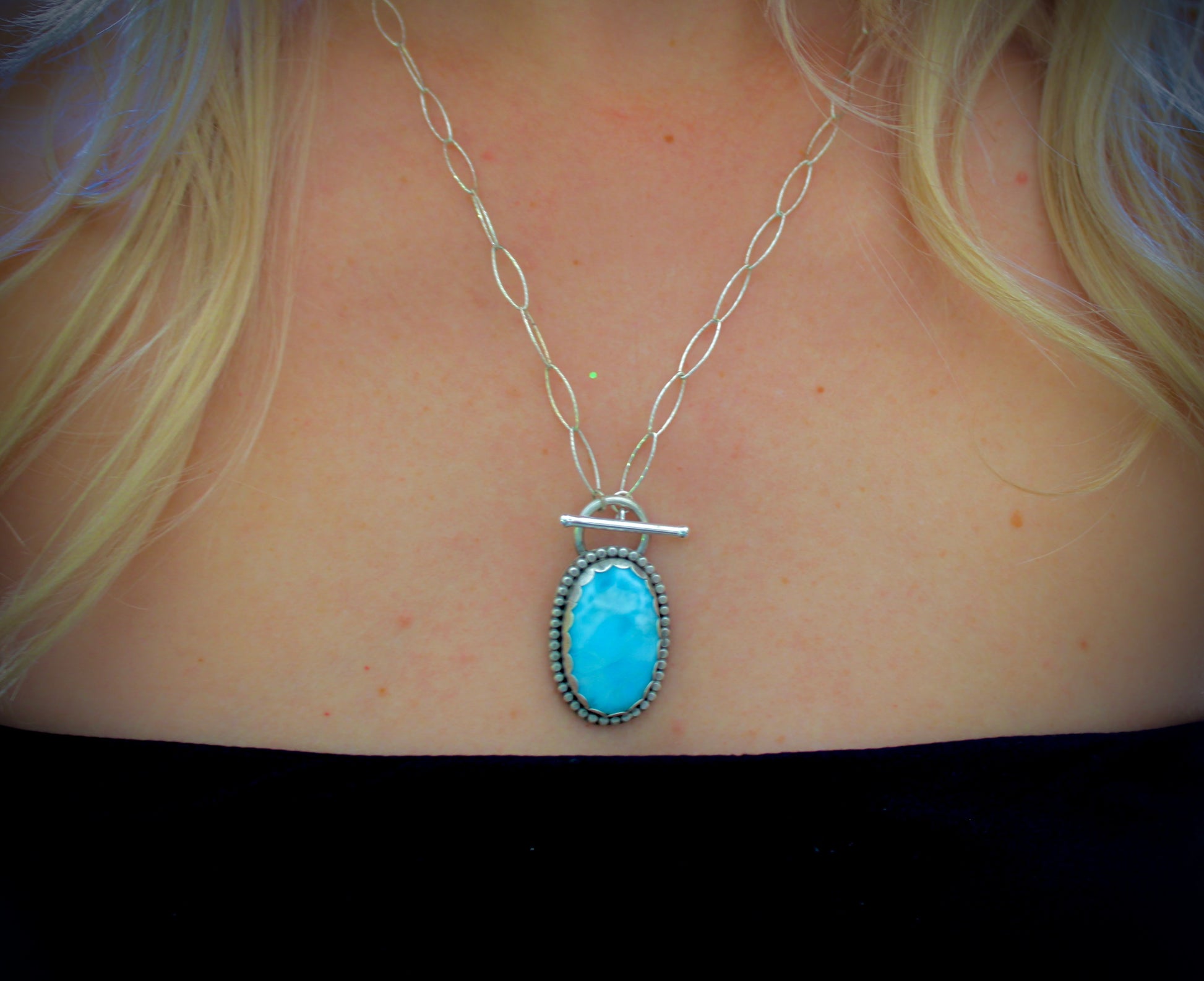 Toggle necklace with Larimar. Lobster clasp, chain is Sterling Silver with patterened cable Marquis chain 18 inches.
