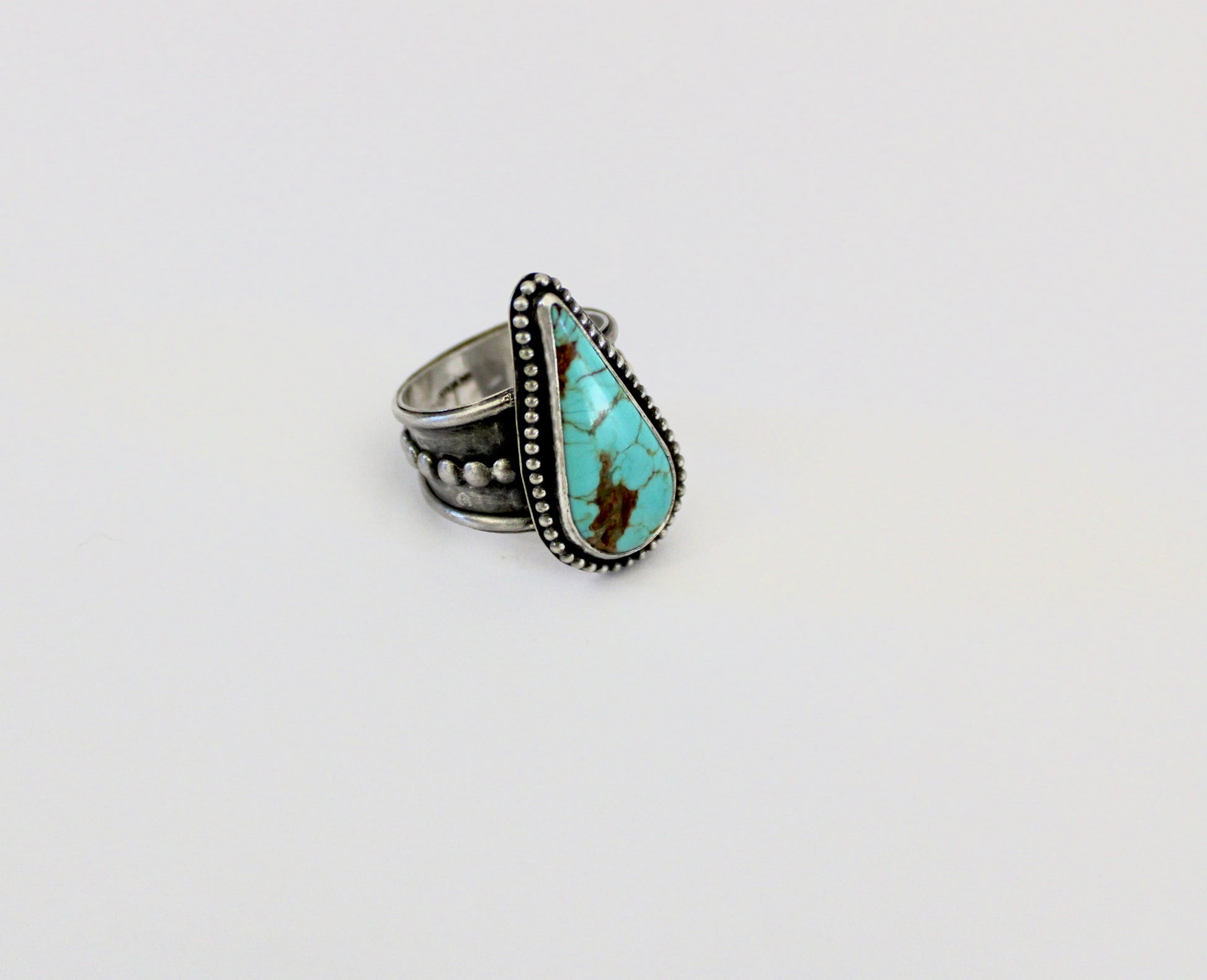 Number 8 turquoise ring set in sterling silver. On a handmade ring shank with beaded embellishment. Size 10 1/2 not adjustable.