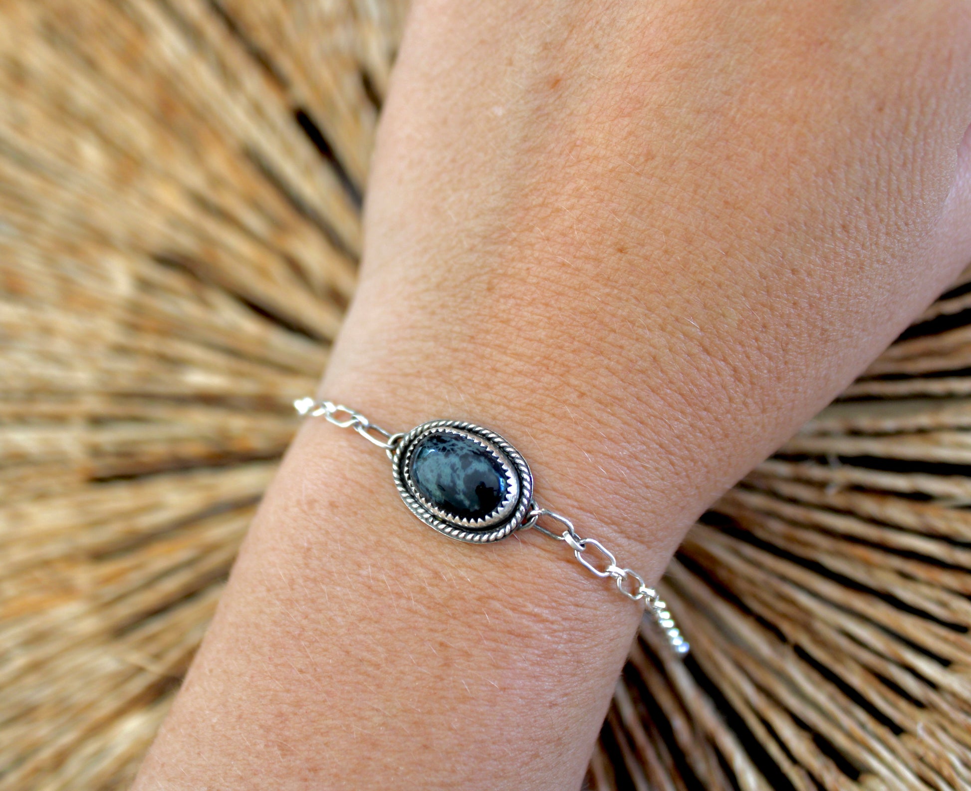 Silver Obsidian bracelet. Bracelet is approximately 8 inches, adjustable by clasp. Sterling Silver paperclip chain 3.3MM. Sterling Lobster Clasp.