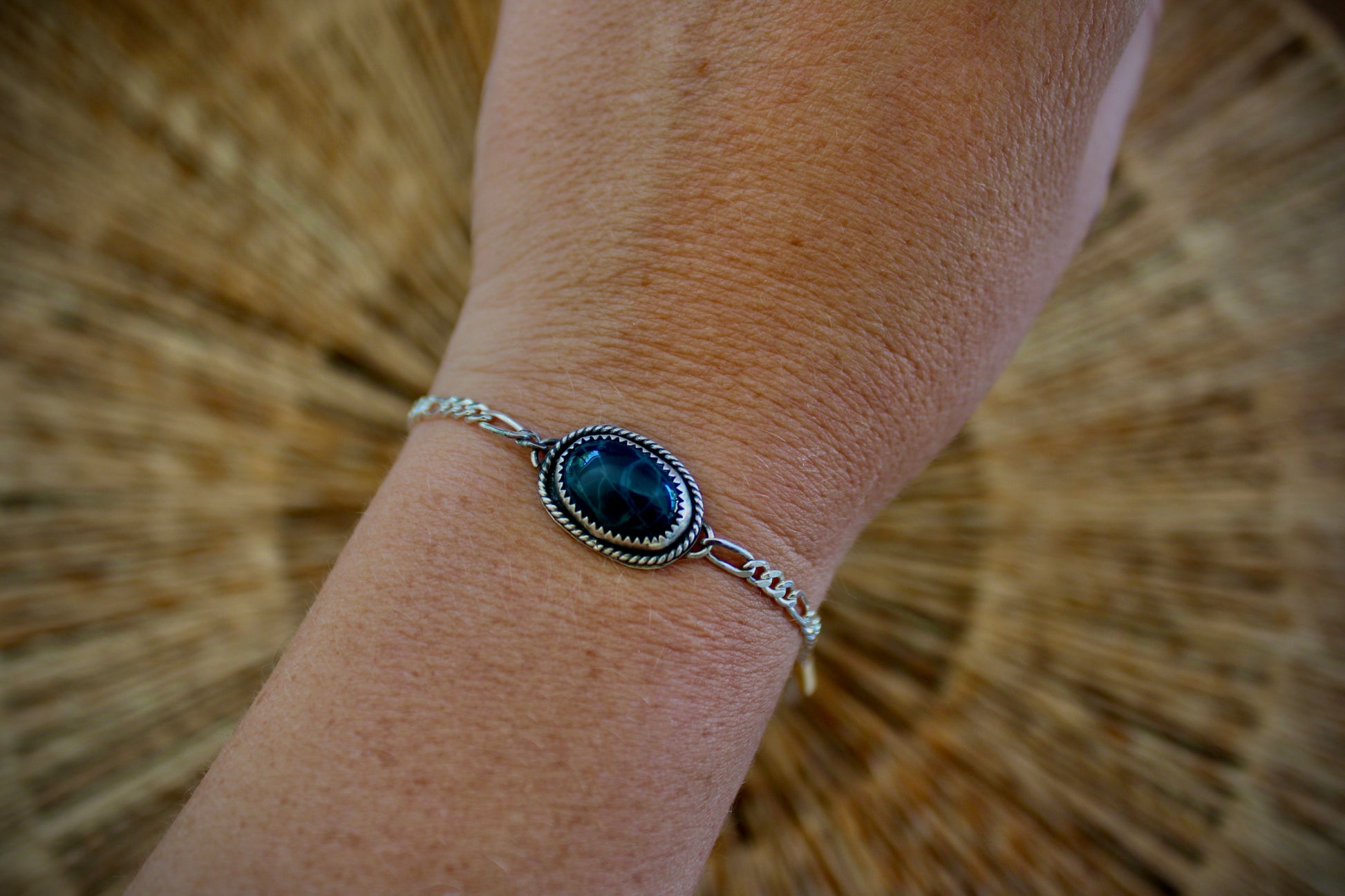 Silver Obsidian bracelet. Bracelet is approximately 8 inches, adjustable by clasp. Sterling Silver Figaro chain with Sterling lobster clasp.