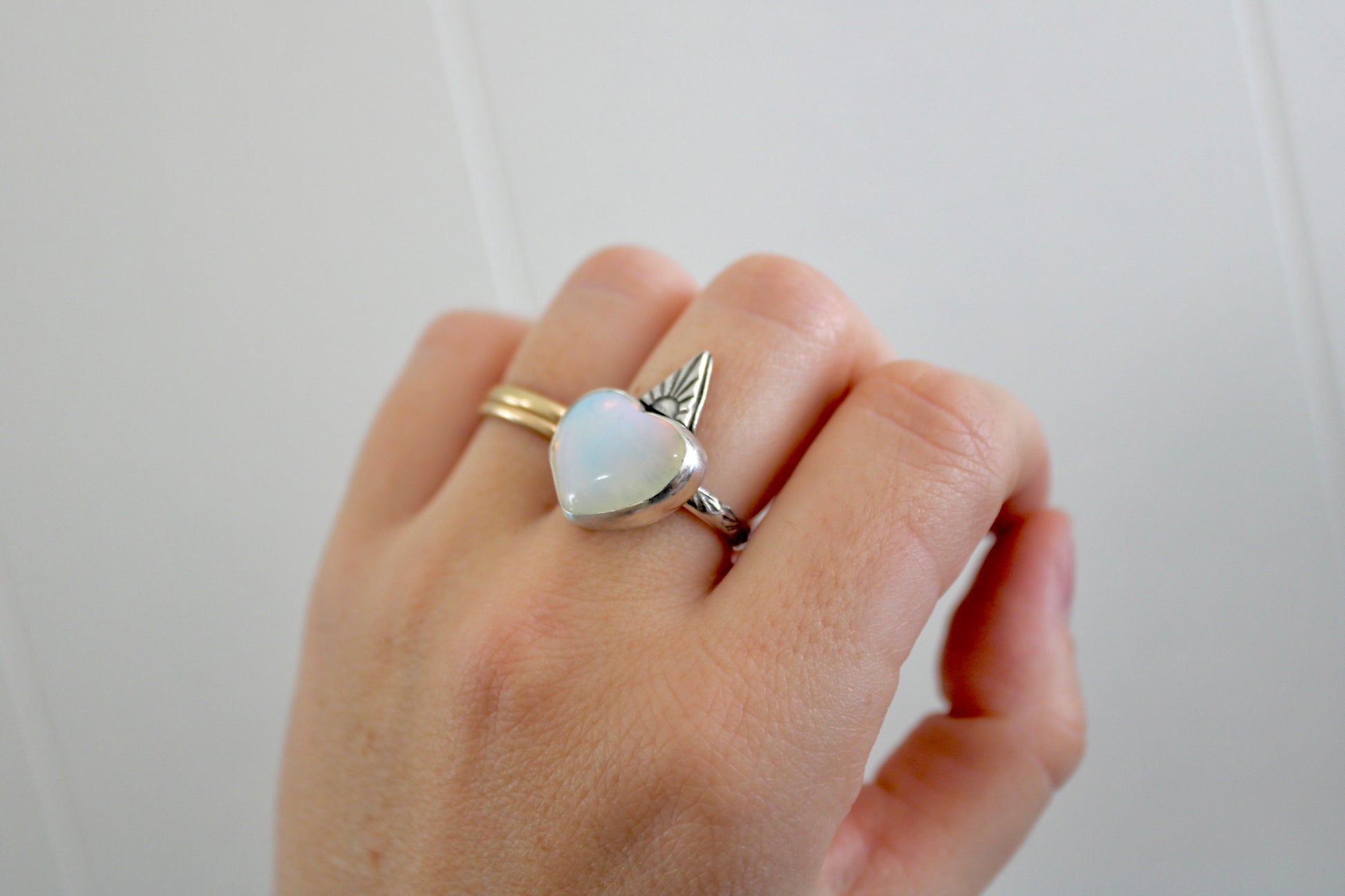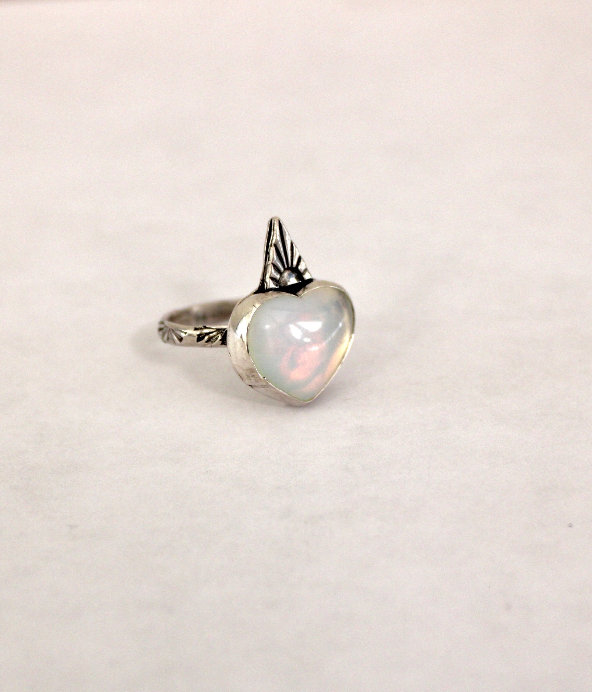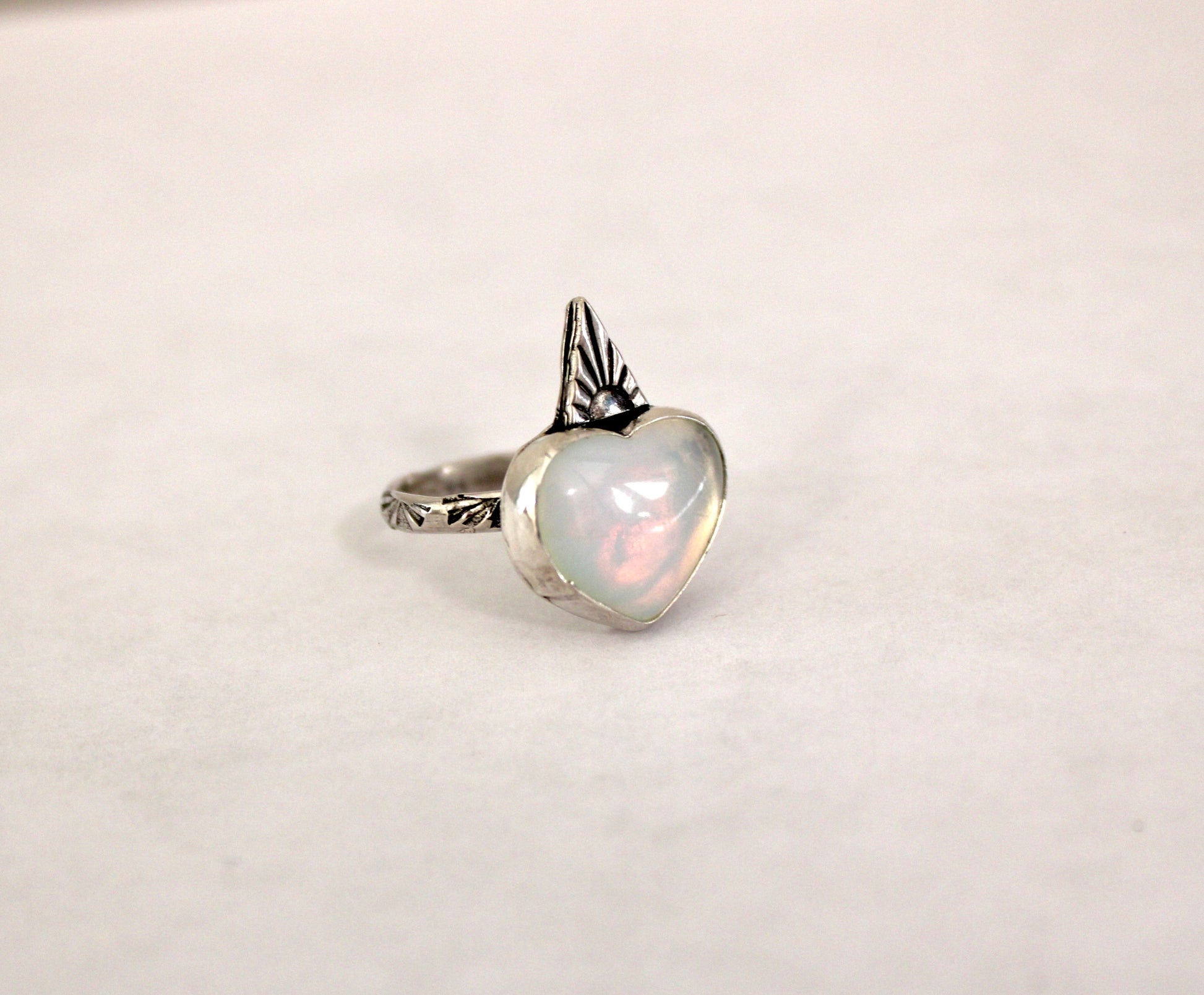 Size 8 -Opalite heart gemstone ring set in sterling silver. On a hand stamped ring band and Sterling accent.