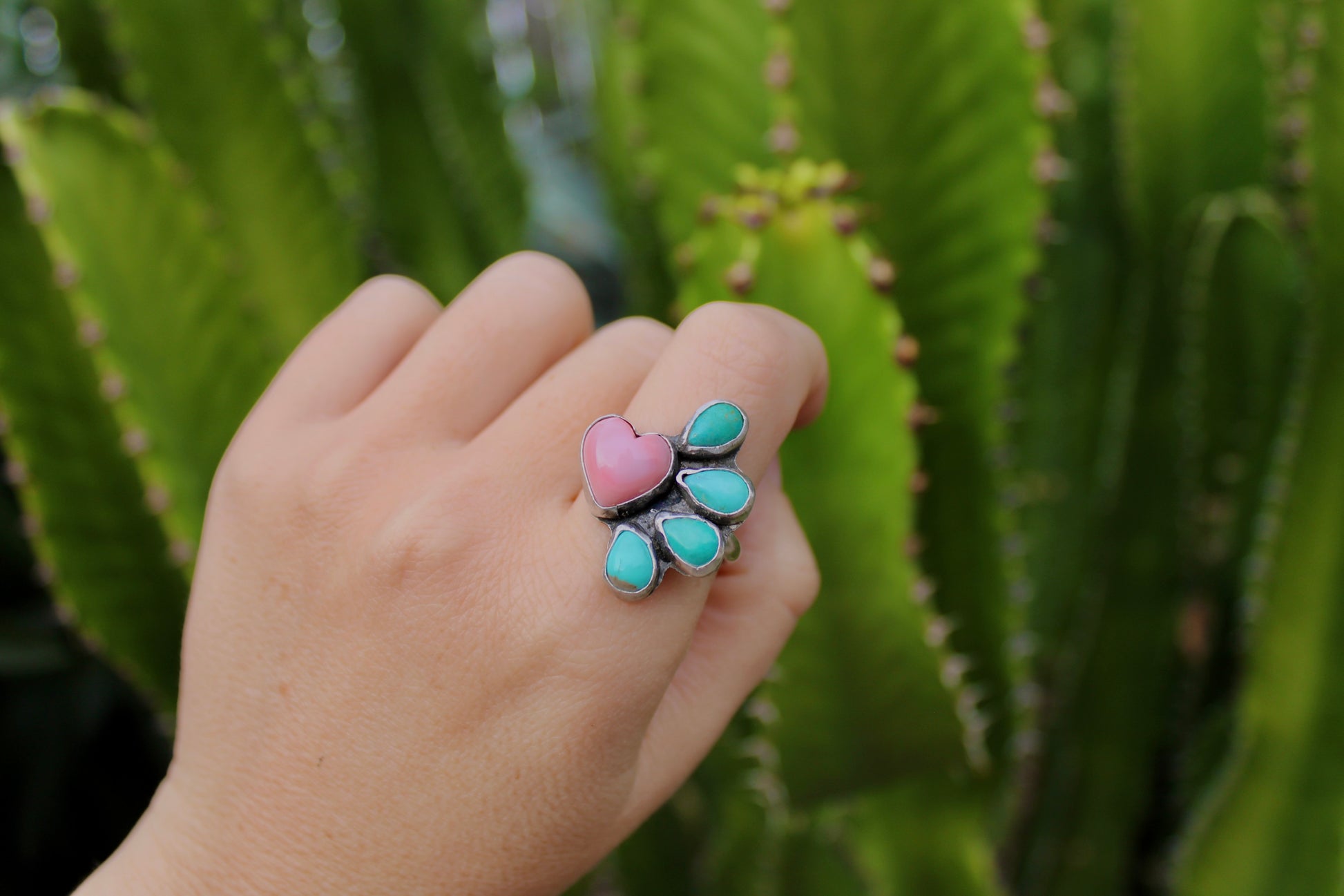 Pink Conch Shell and Sonoran Turquoise Ring- size 9.5