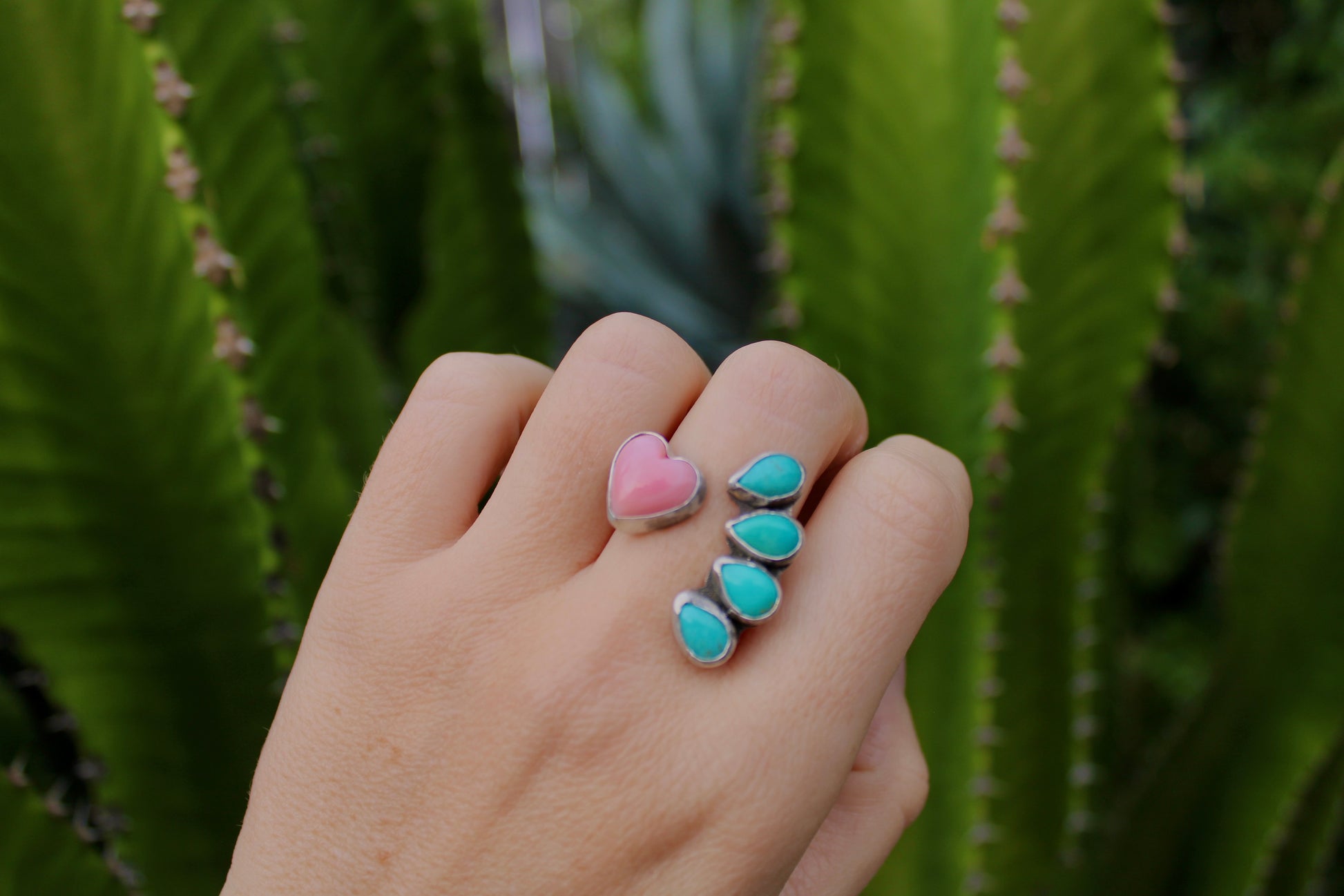 Size 7. Open ring with Pink Conch Shell and Sonoran Turquoise set in Sterling Silver.