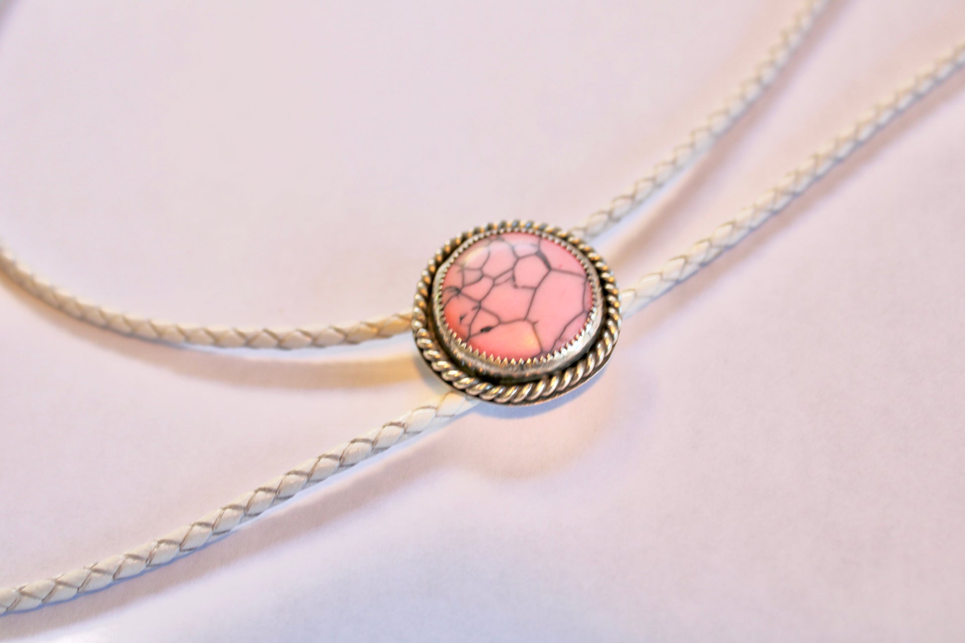 Pink Mojave Composite Bolo Tie. Adjustable by bolo, made from Sterling Silver. Bolo cord is 3MM and 42inches, white bolo cord. Bolo slider made from steel.