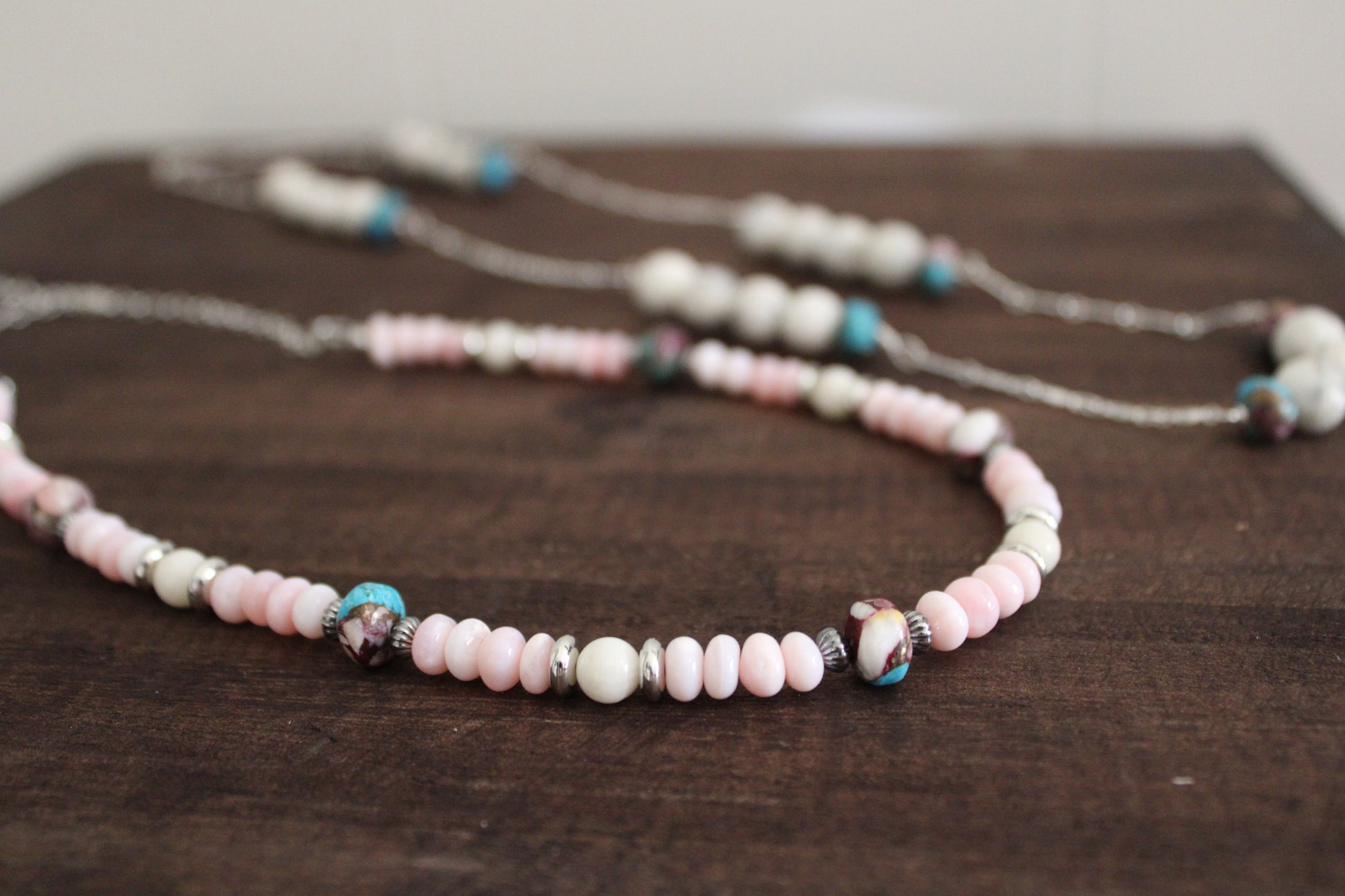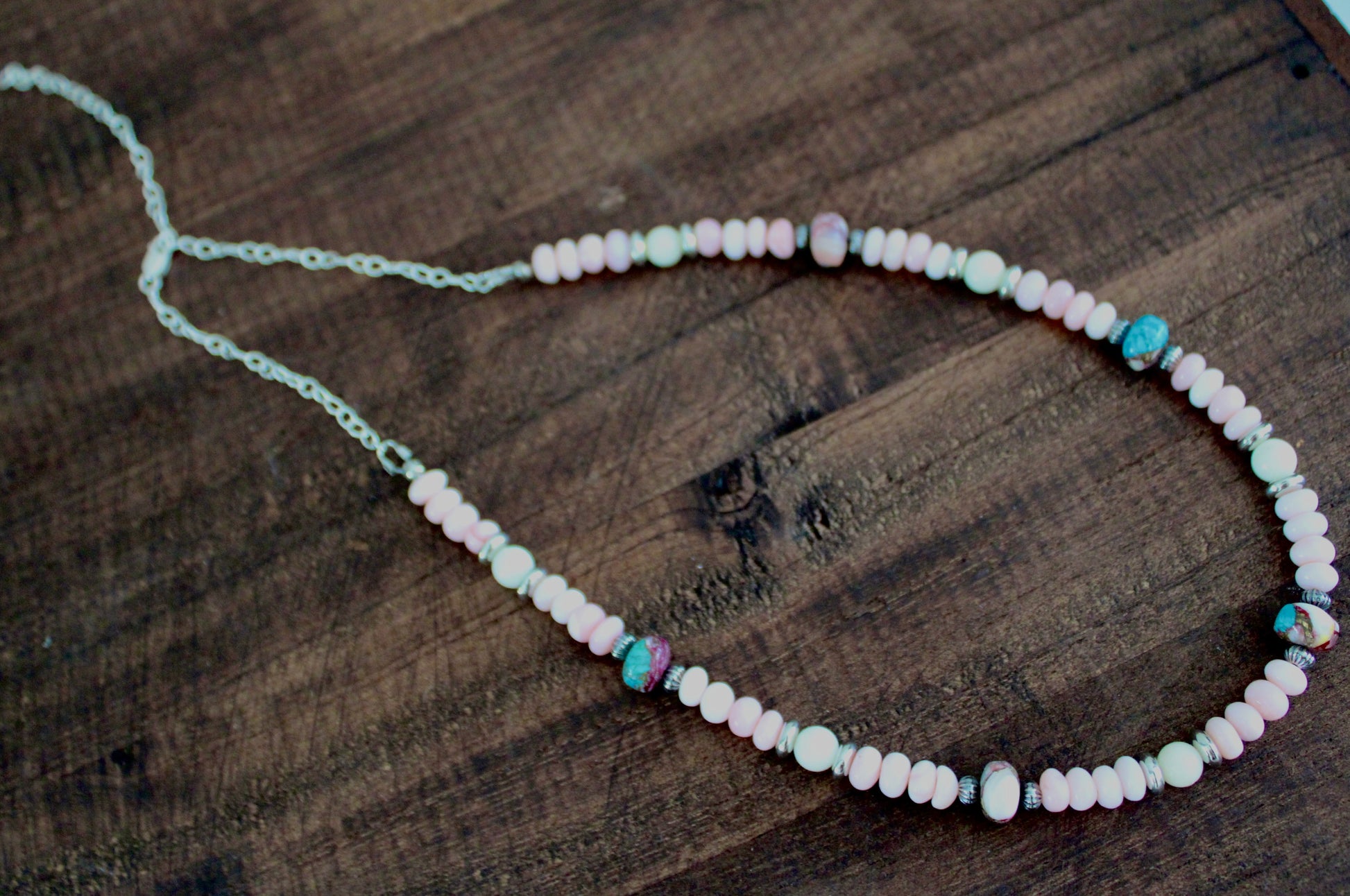 Pink opal beaded 16 inch necklace with dahlia Kingman beads, and white coral. Sterling Silver beaded accents.
