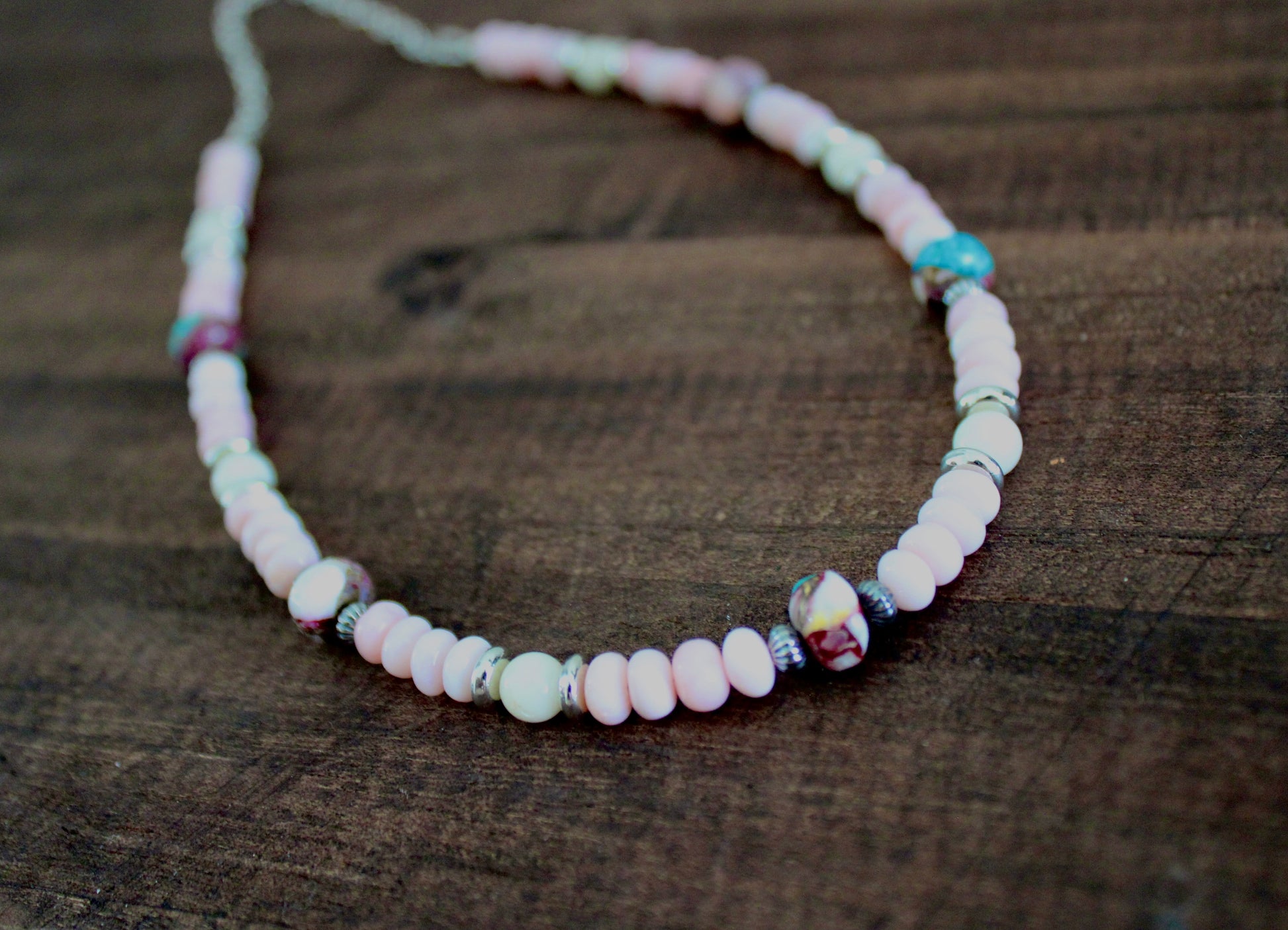 Pink Opal beaded necklace with Pink Dahlia Kingman