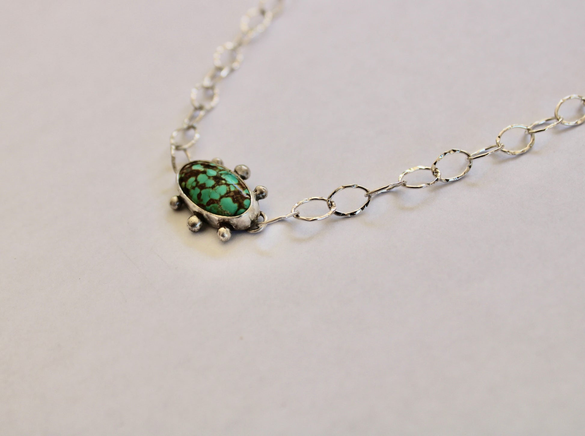 Sterling Silver choker necklace.Polychrome Qingu Turquoise on a 14 inch Sterling Silver patterned ovalcable chain 5.4MM. Sterling Silver lobster clasp.