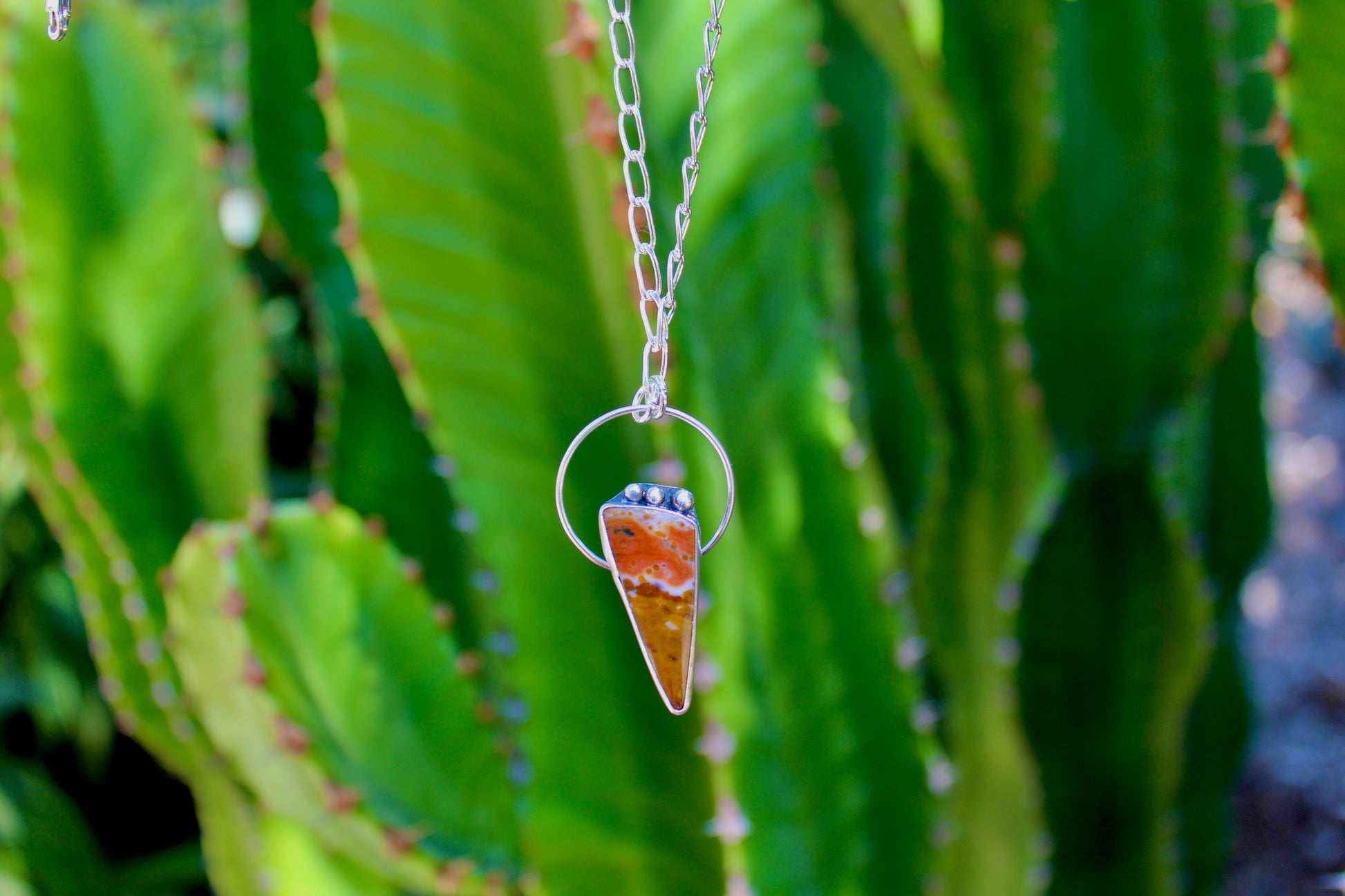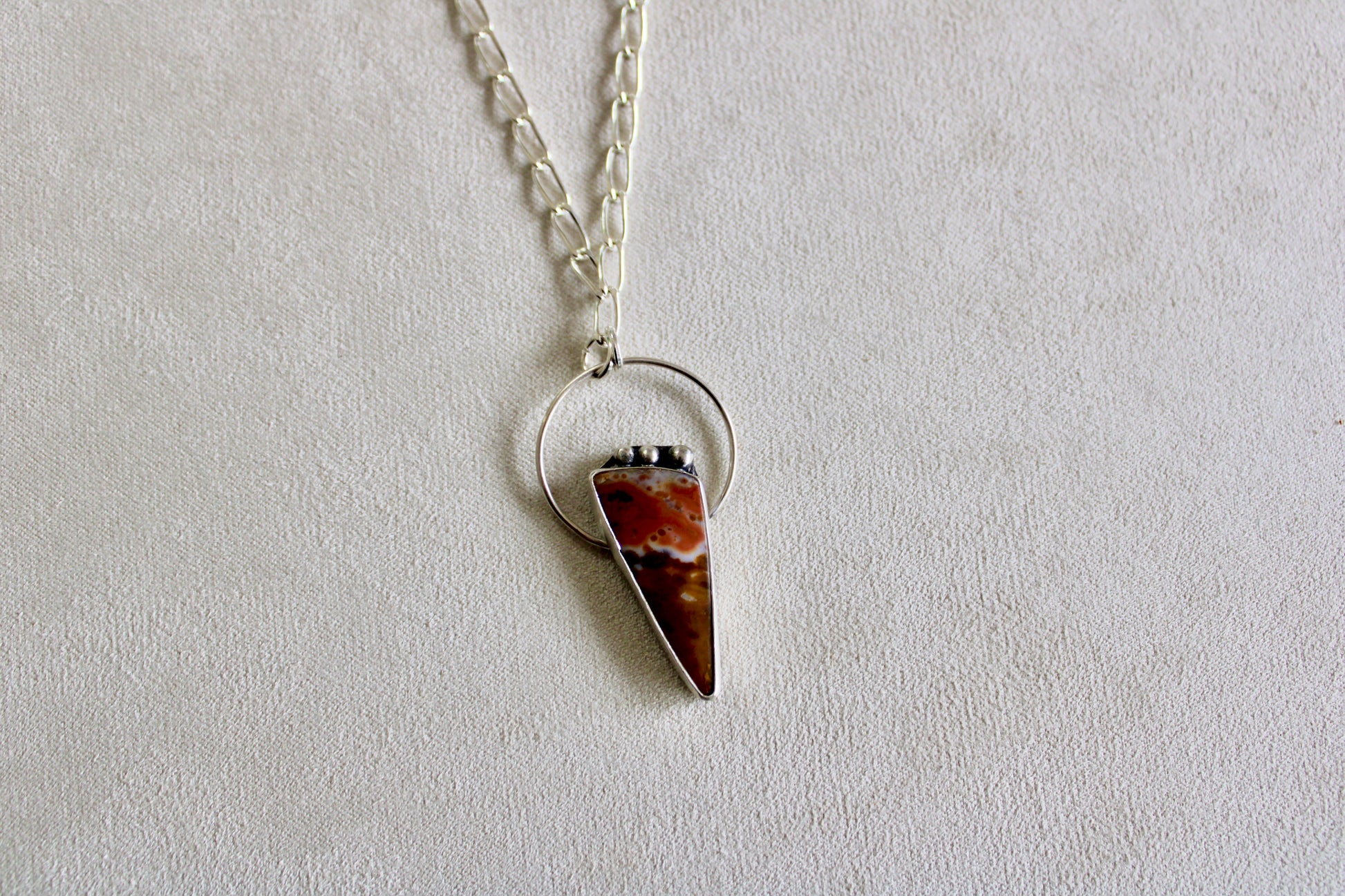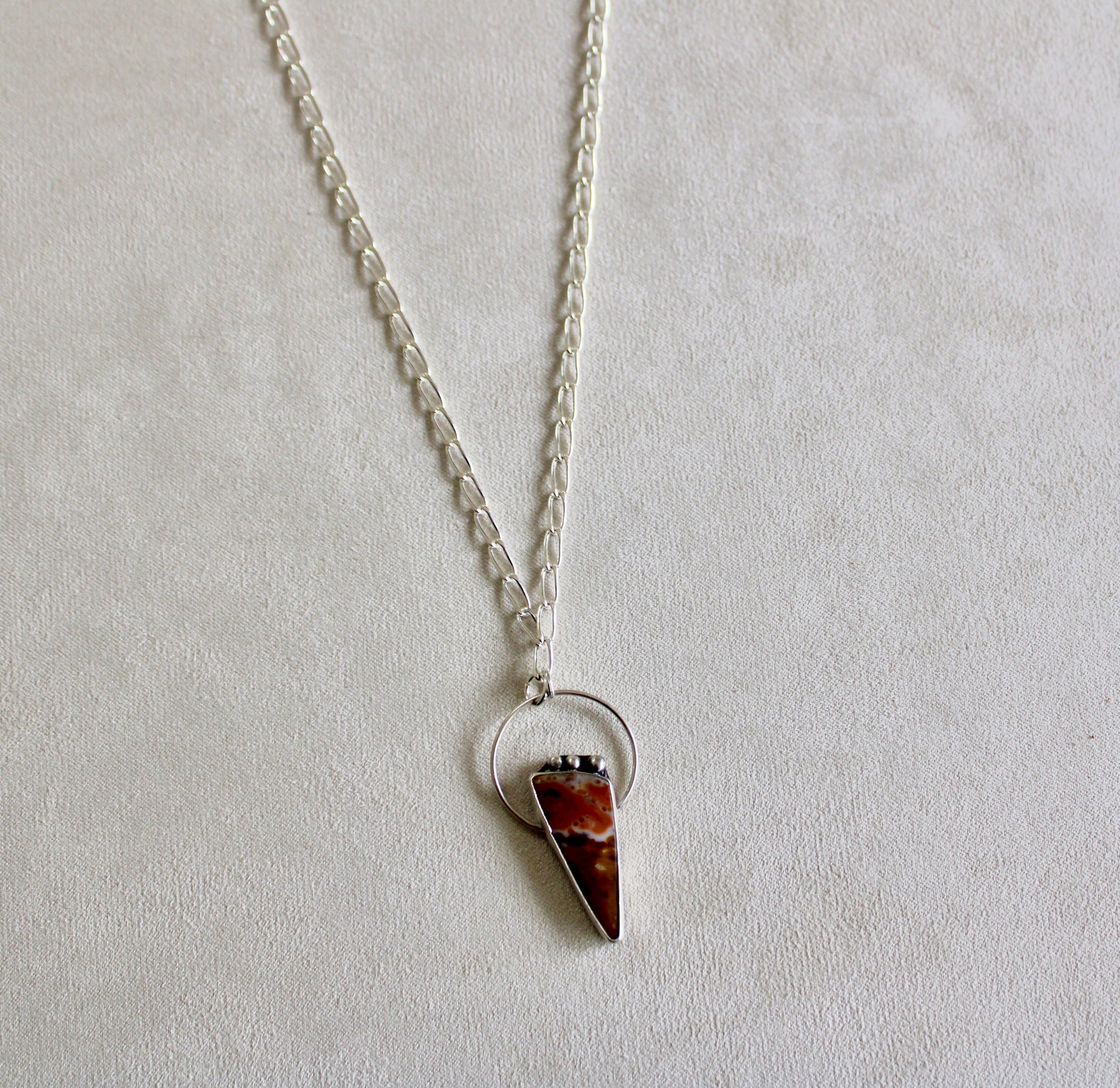 River Jasper Necklace set in Sterling Silver with Silver ball embellishments. Hung on a 22 inch oval hammered curb chain. Sterling Lobster Clasp.