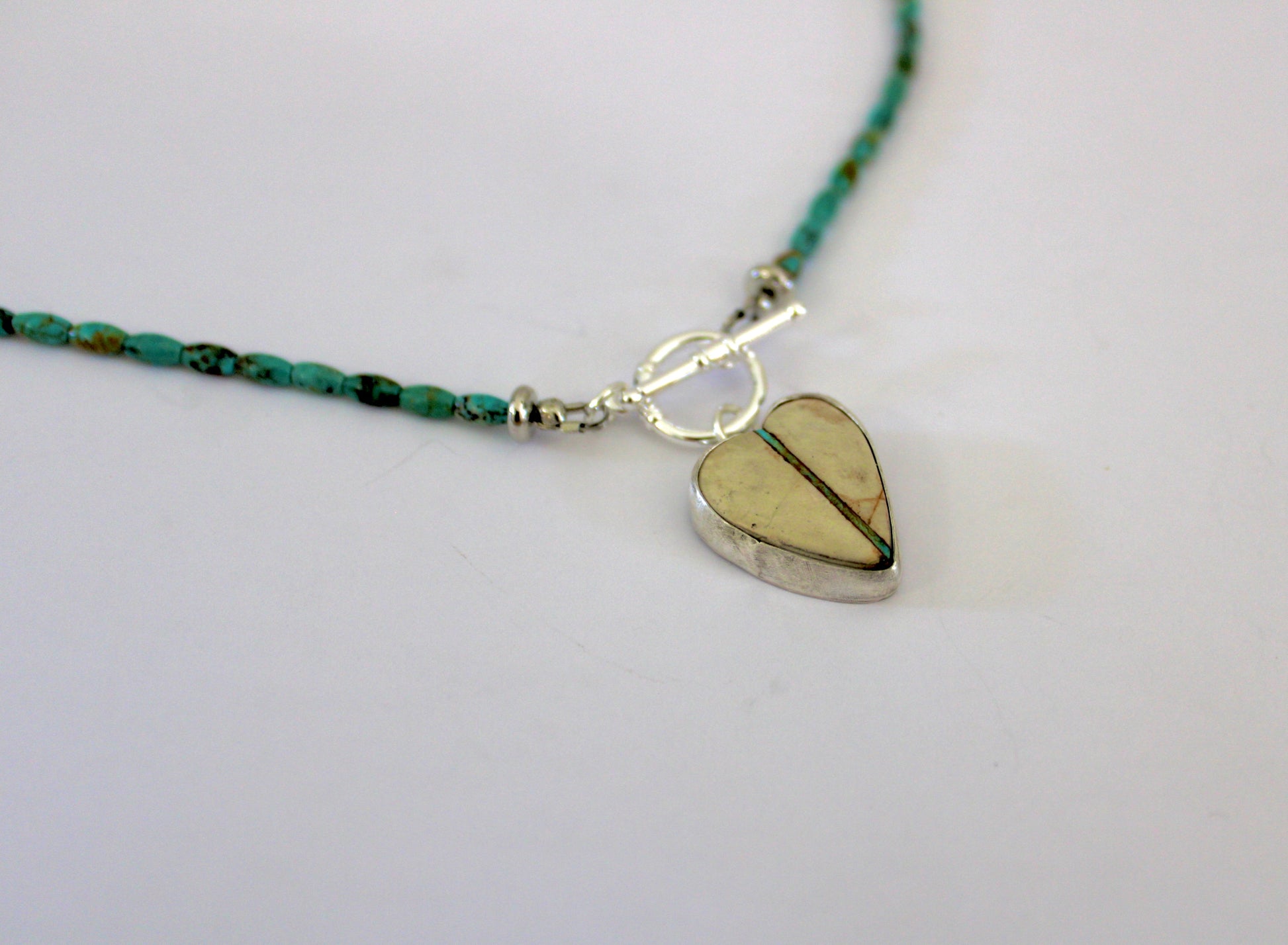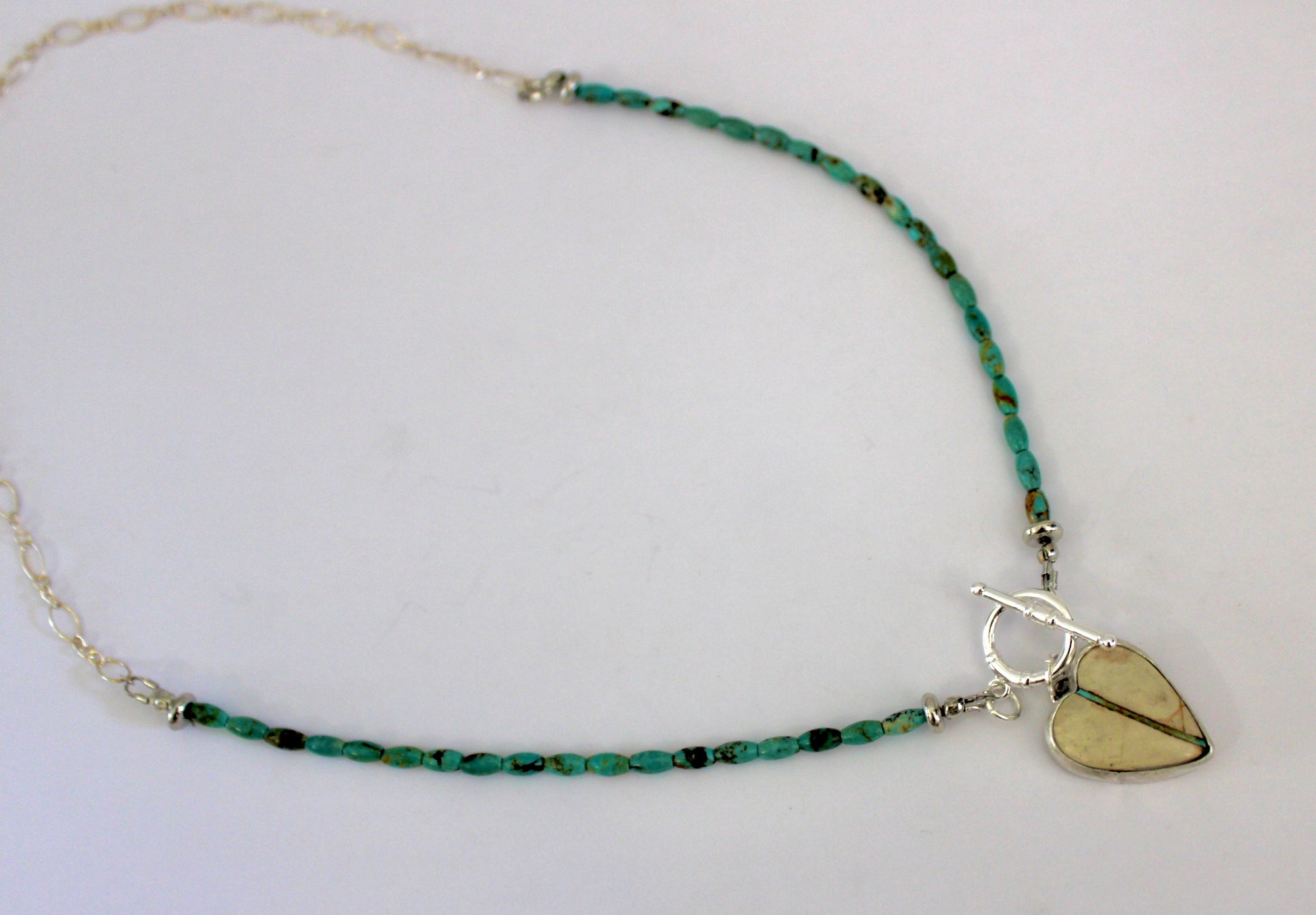 Royston Turquoise heart set in Sterling Silver on a toggle chain with Tyrone Turquoise beads and Sterling Silver chain.
