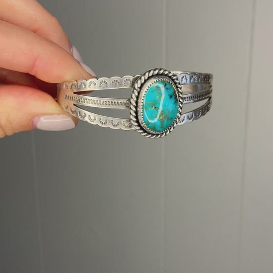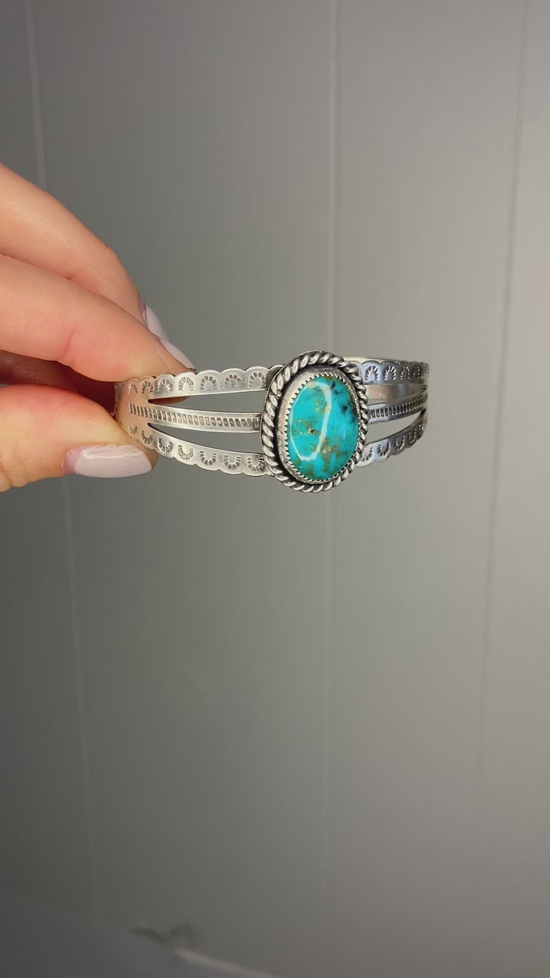 Sterling Silver Royston Turquoise Cuff. Cuff is approximately 5 1/2 inches and stamped. Adjustable as silver is soft and flexible
