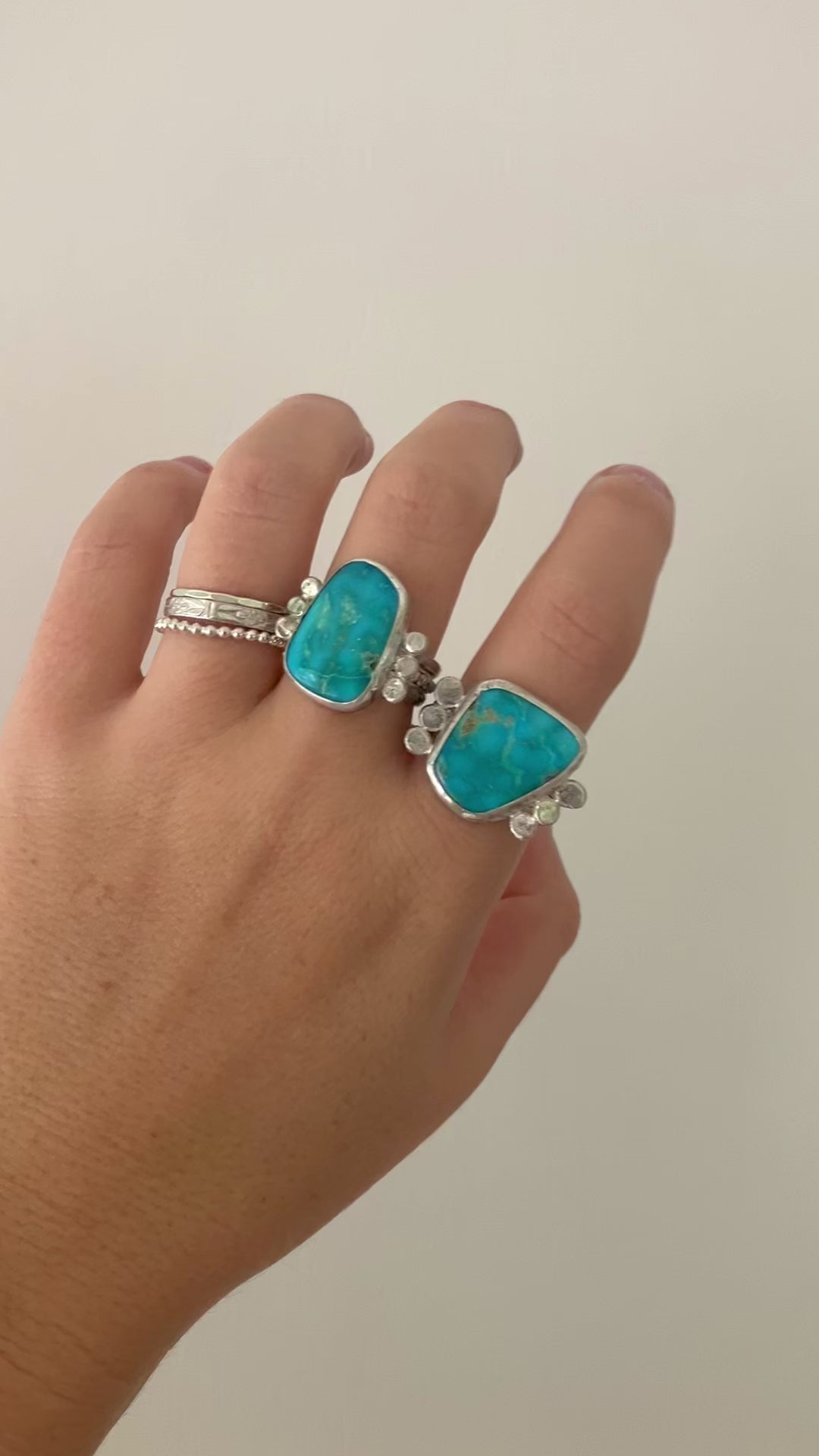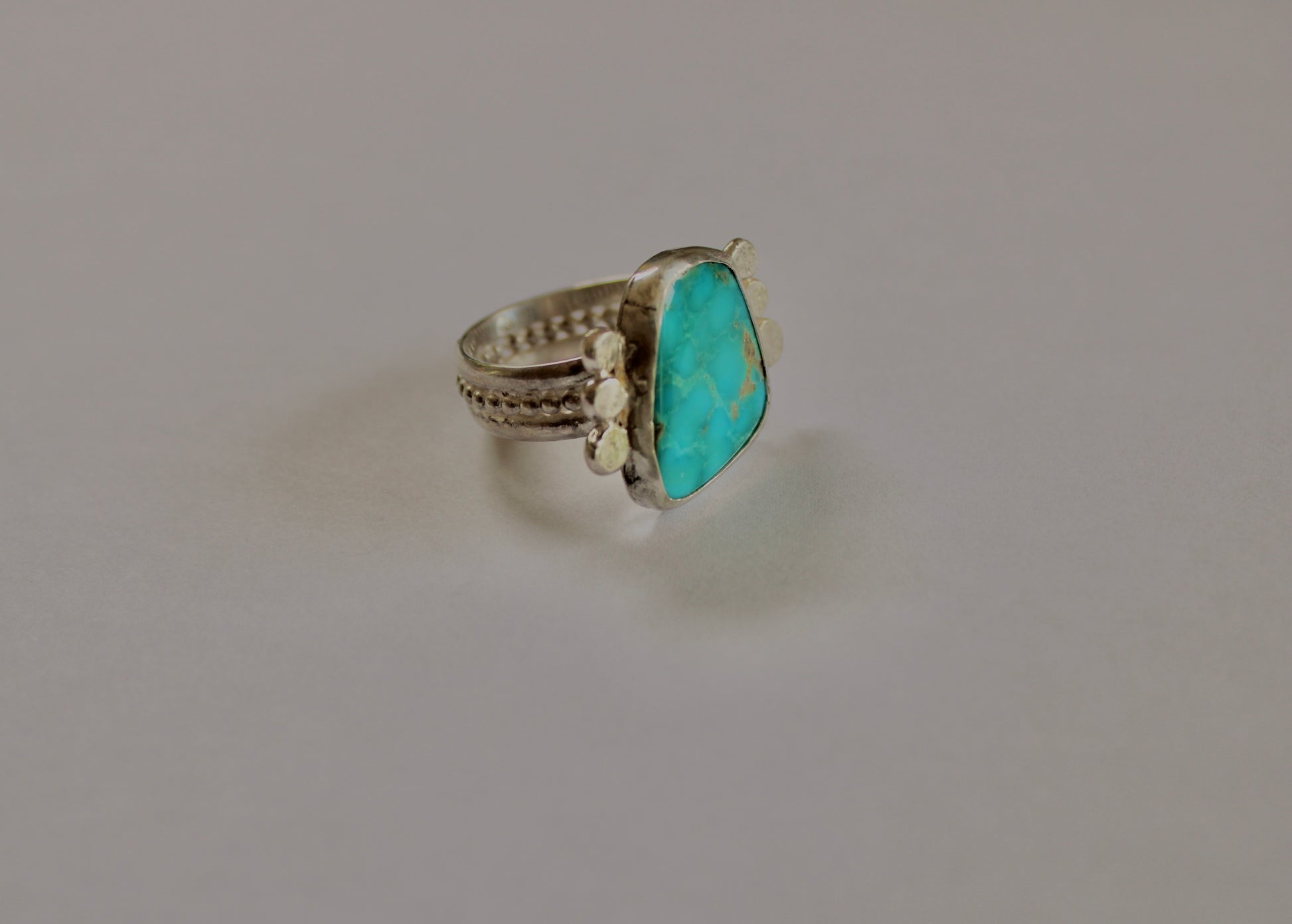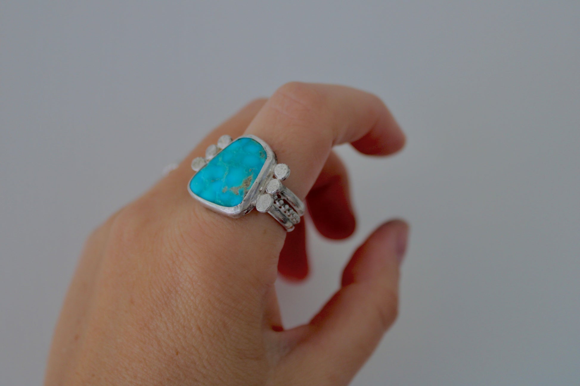Size 10 1/2 - Blue Gem Turquoise Ring set in Sterling Silver on a handmade Sterling ring shank with beaded accent.