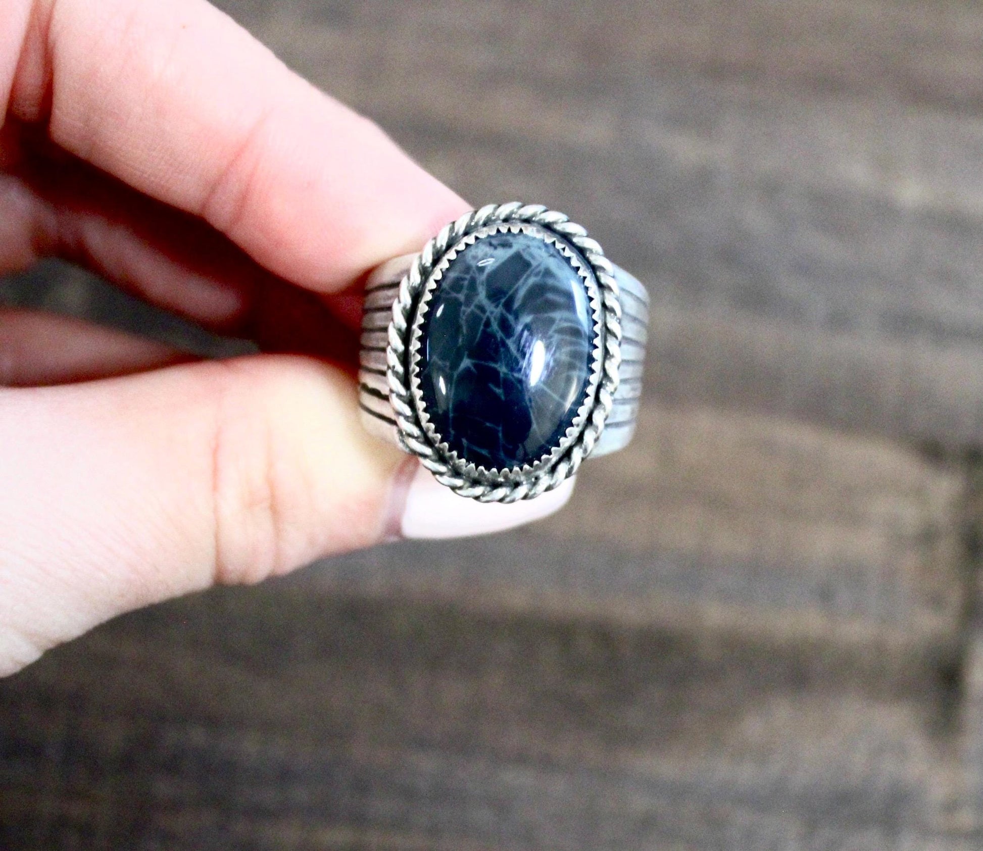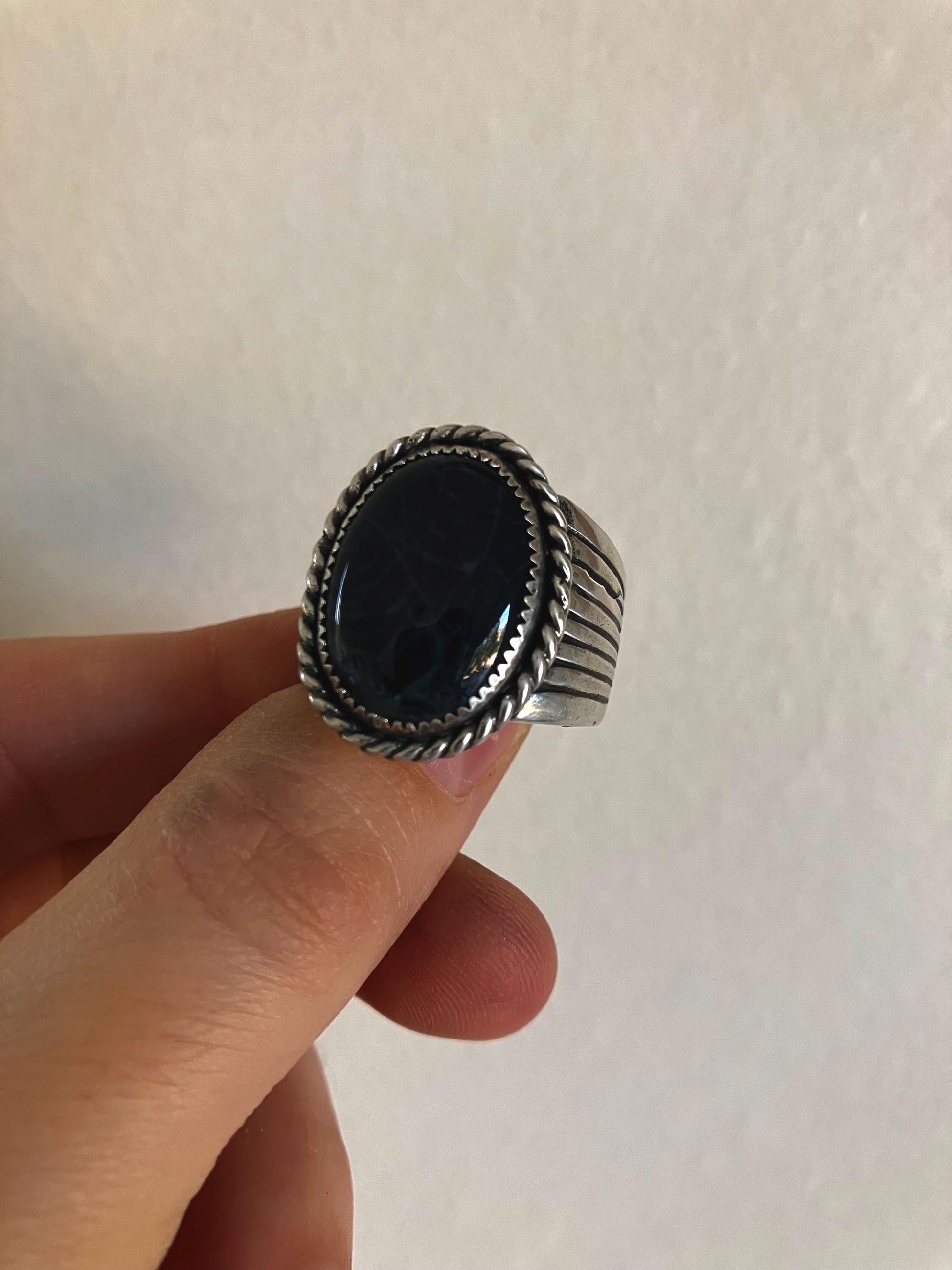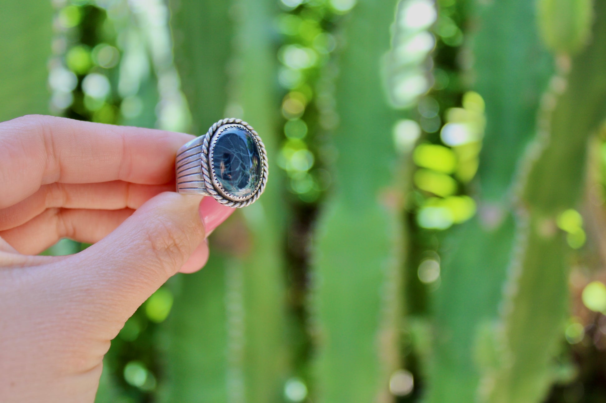 Size 10 statement ring on a stamped Sterling Silver ring shank. Spiderweb black Obsidian. Non adjustable.