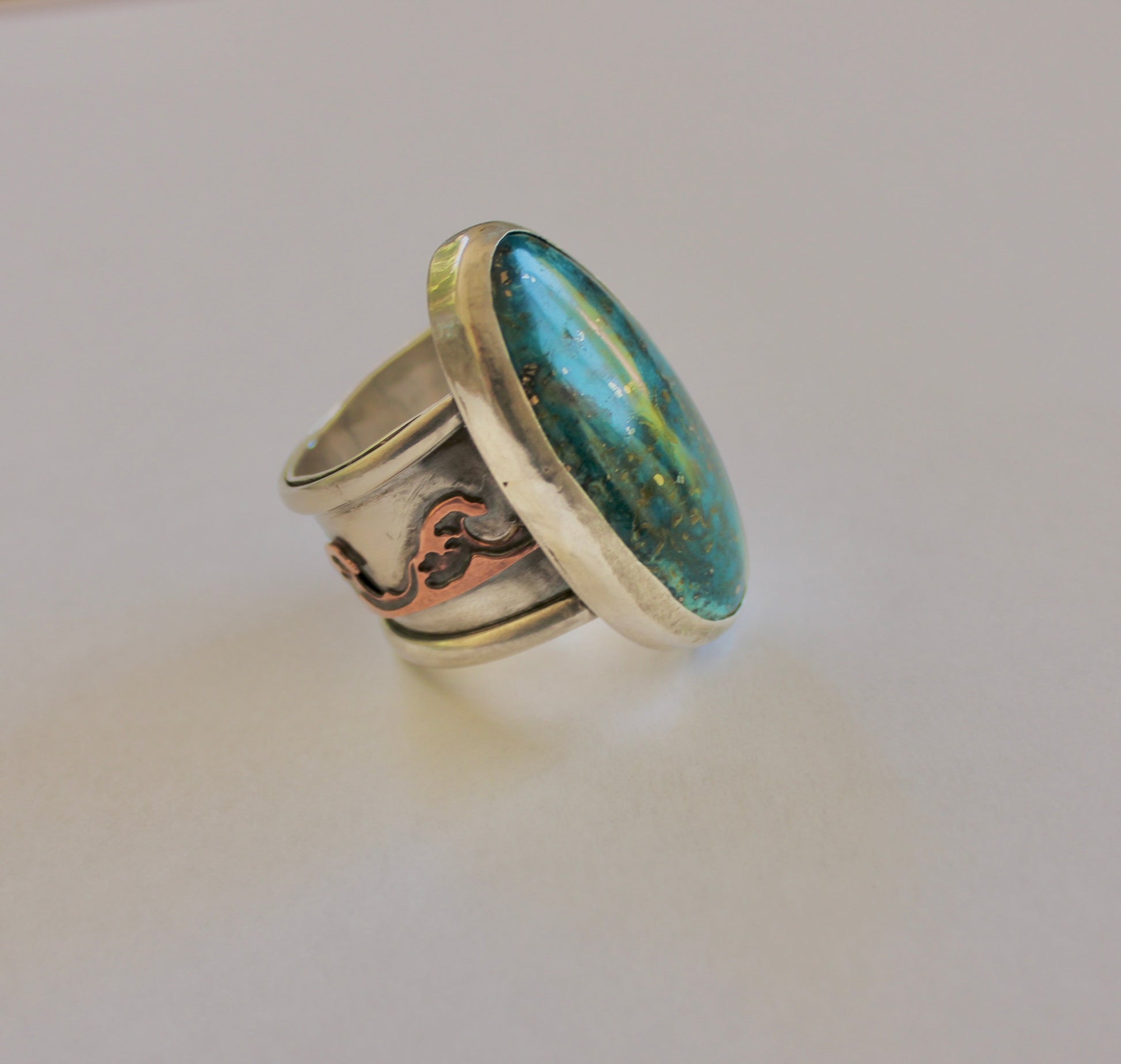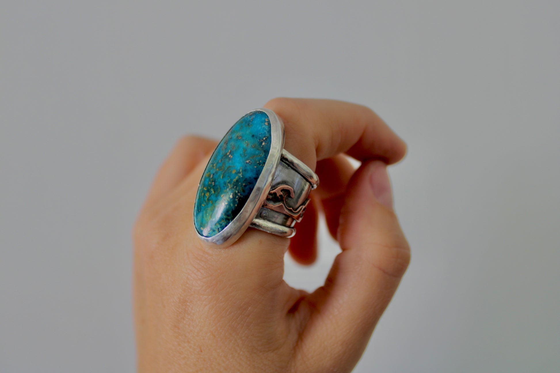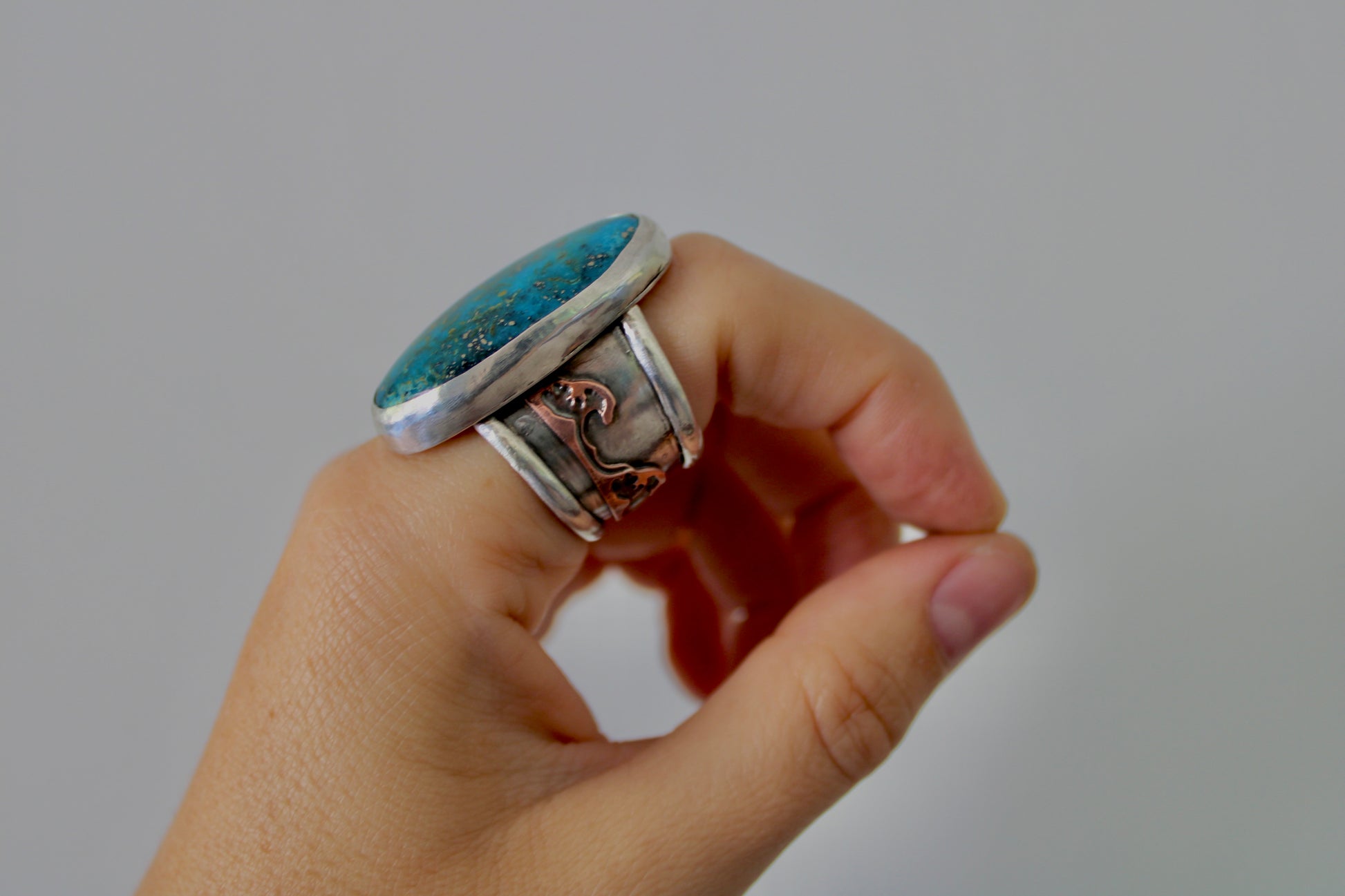 Size 10 -Handmade Sterling Silver statement ring with True Blue Kingman Turquoise Cabochon set in a handmade Sterling Silver ring shank with Copper Wave embellishment.
