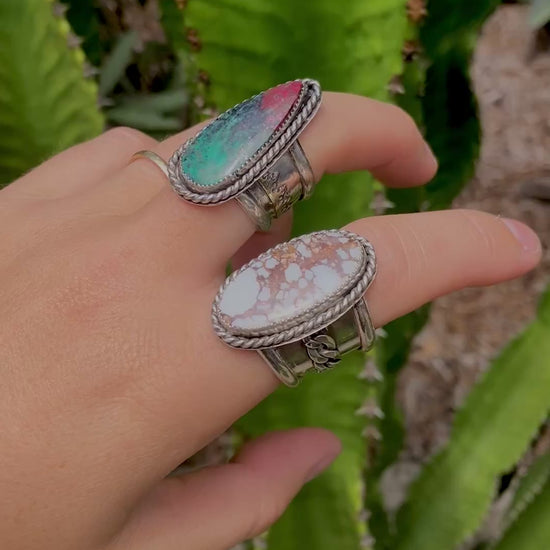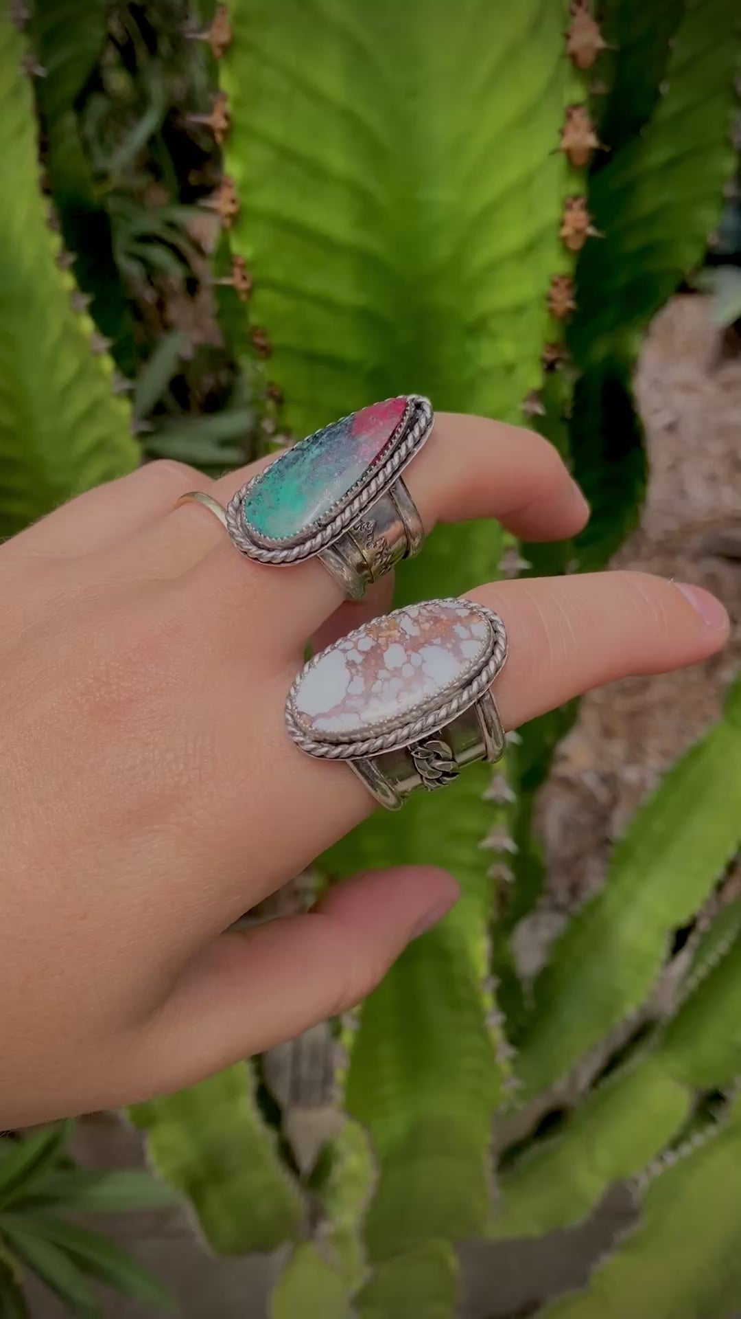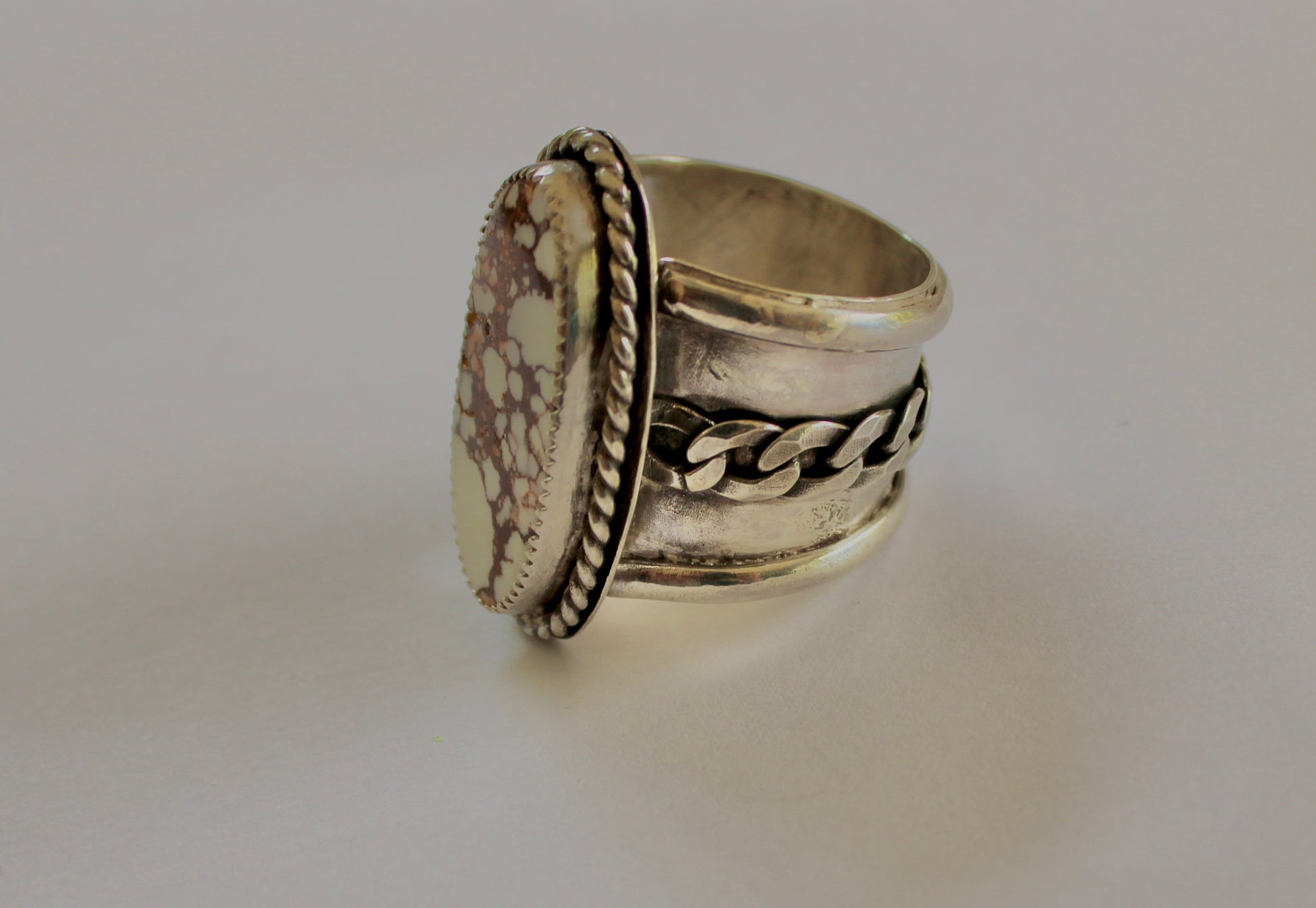 Size 11. Handmade Sterling Silver statement ring with Wild Horse Turquoise set in a handmade Sterling Silver ring shank with curb chain embellishment.