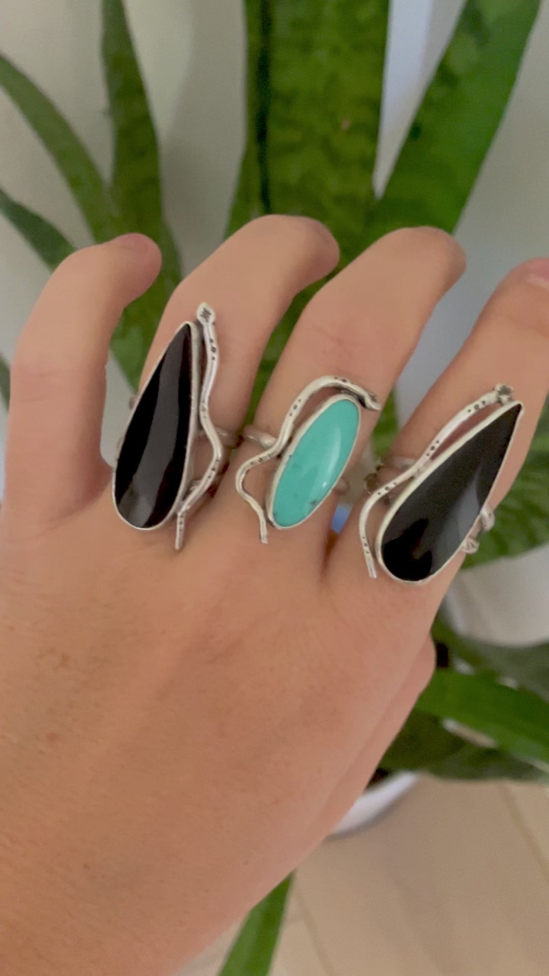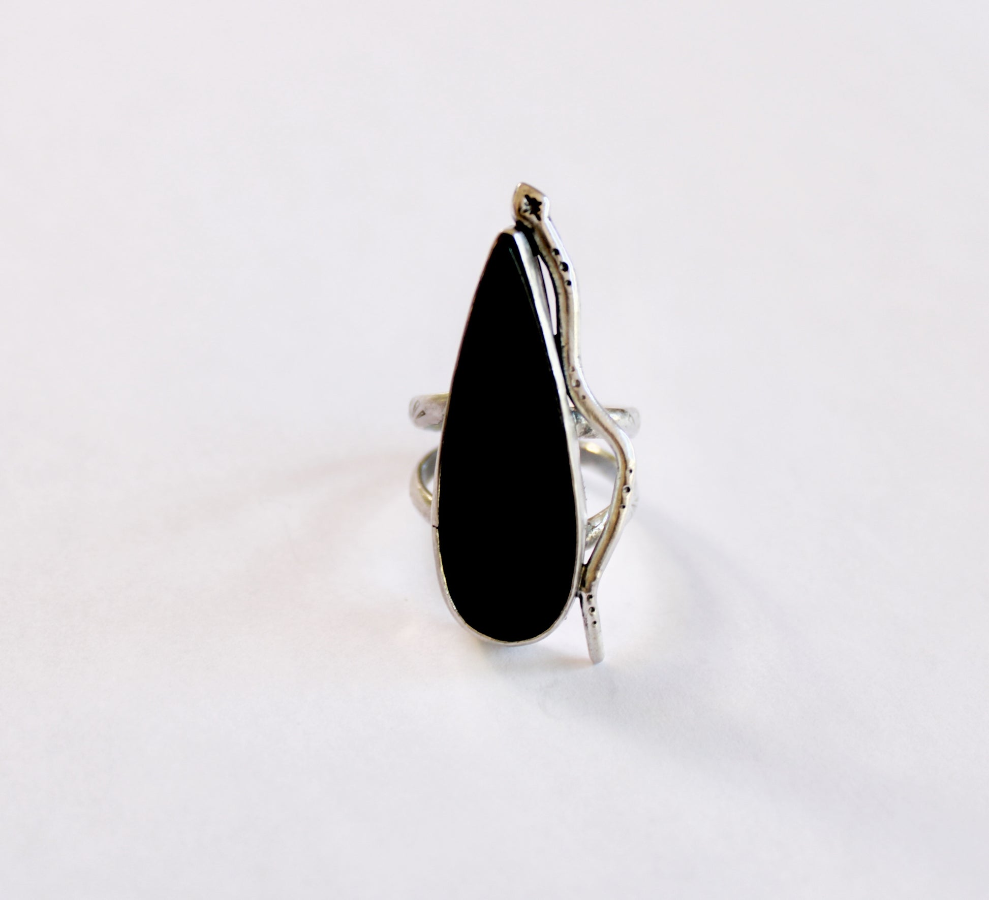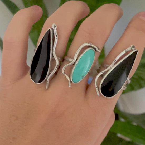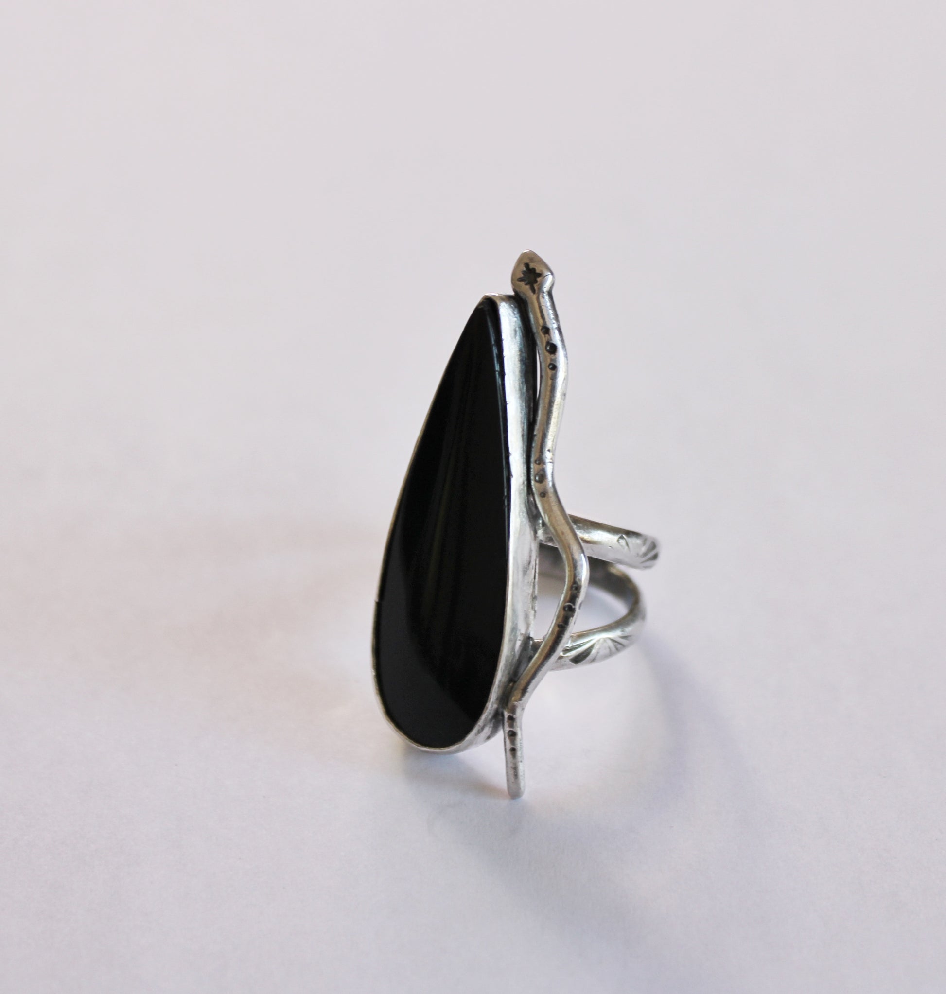 Size 6.5. Handmade Sterling Silver statement ring with Black Onyx gemstone and a handstamped ring shank. Snake embellishment is Sterling.