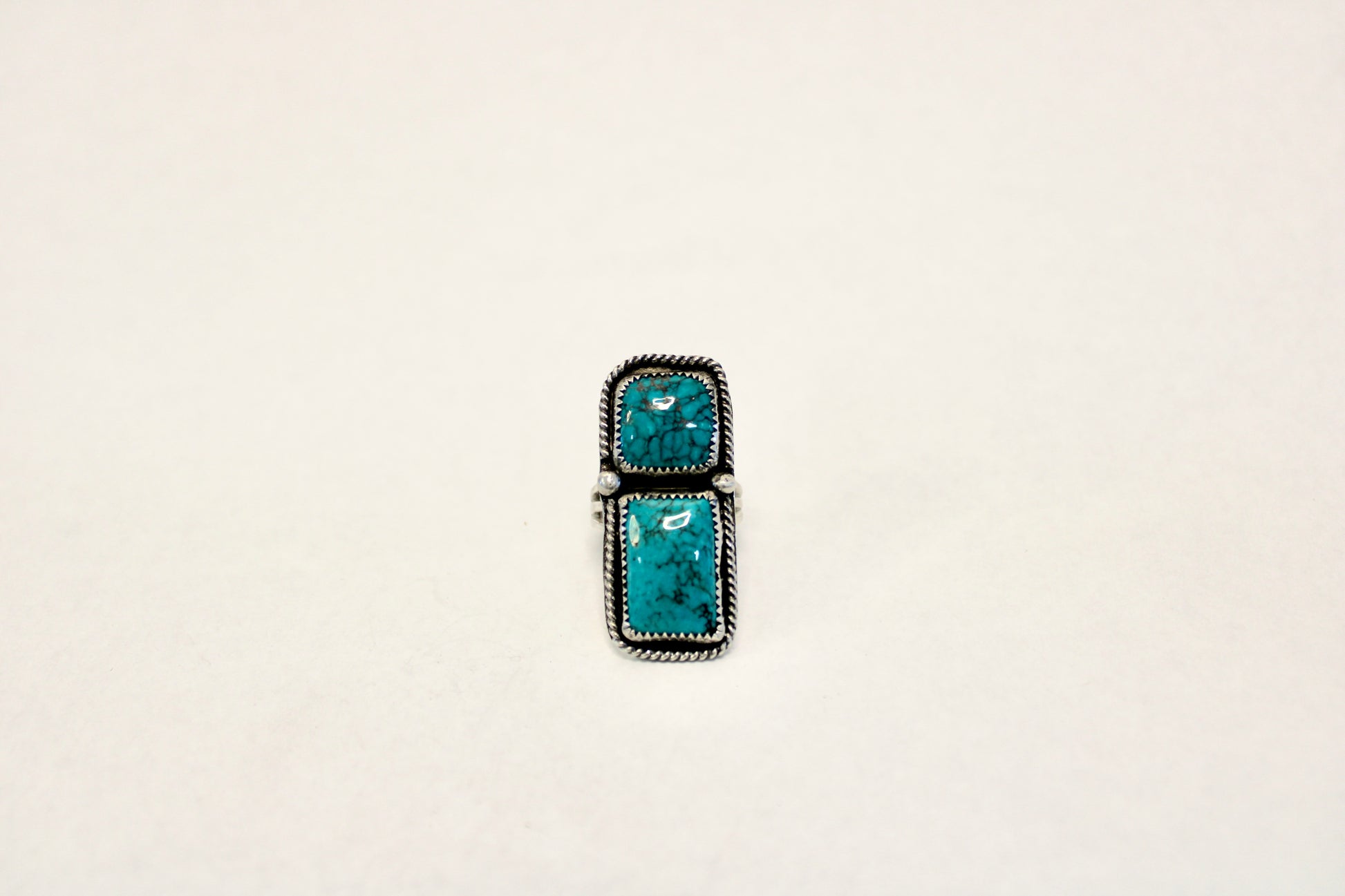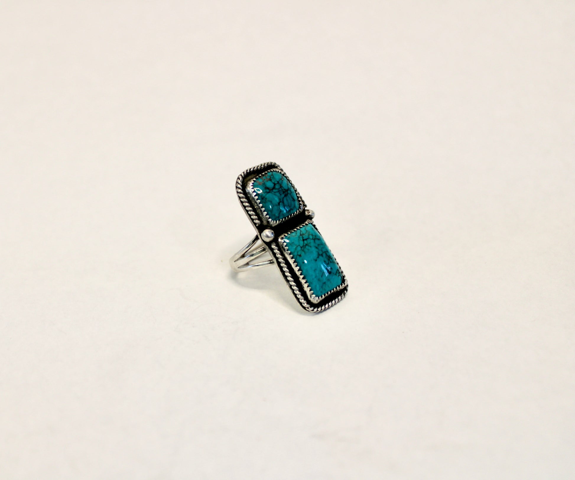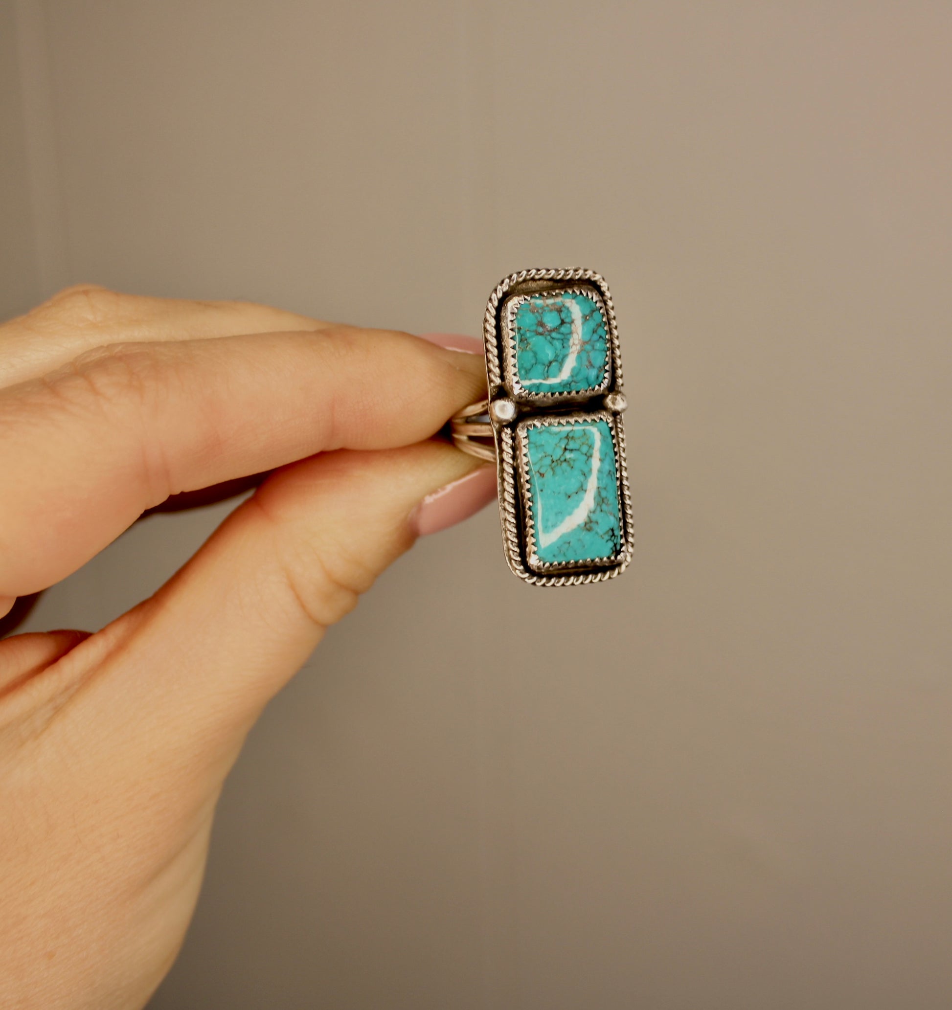 Size 6.5. Handmade Sterling Silver statement ring with Hubei Turquoise and a triple ring shank.