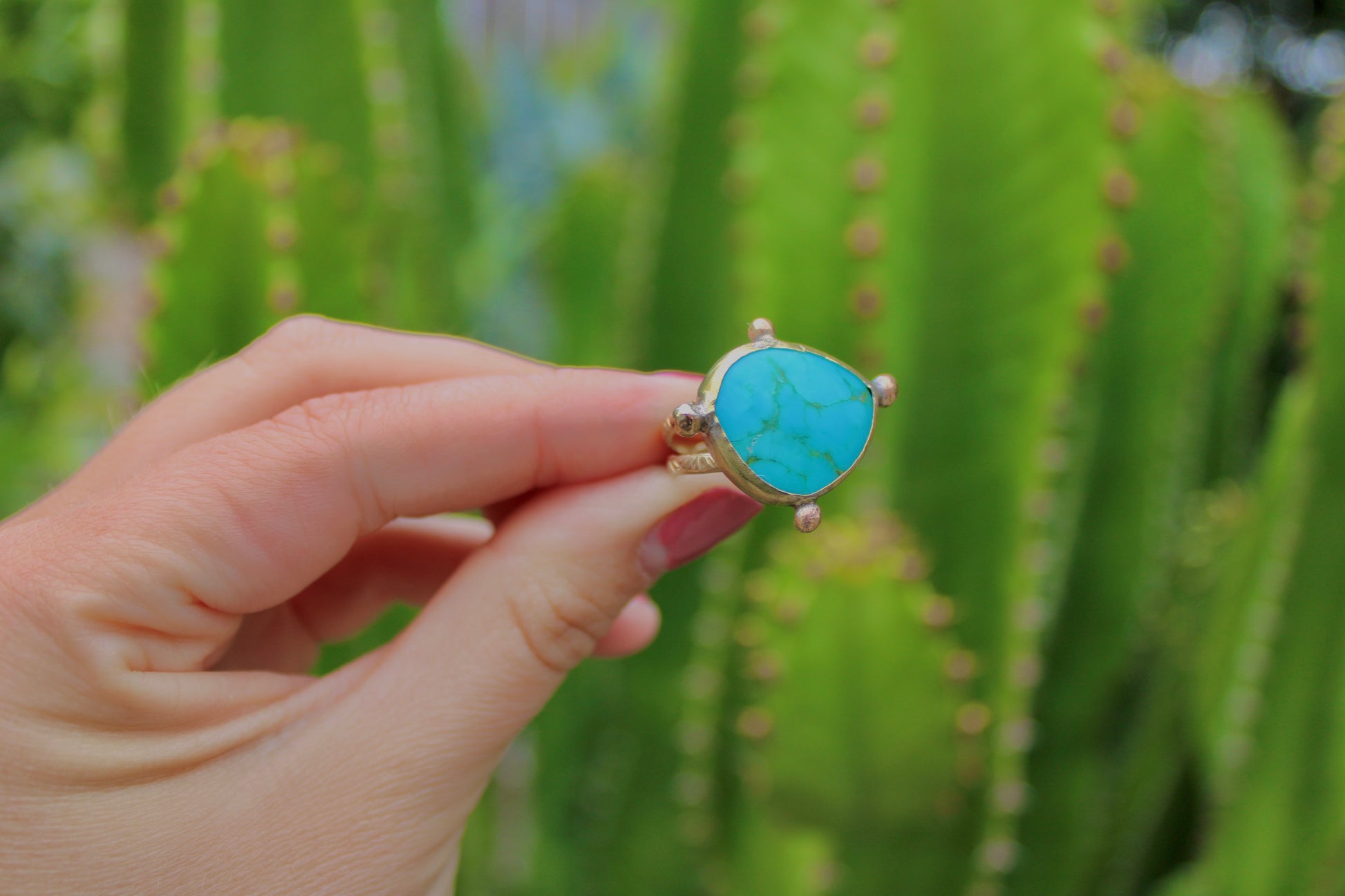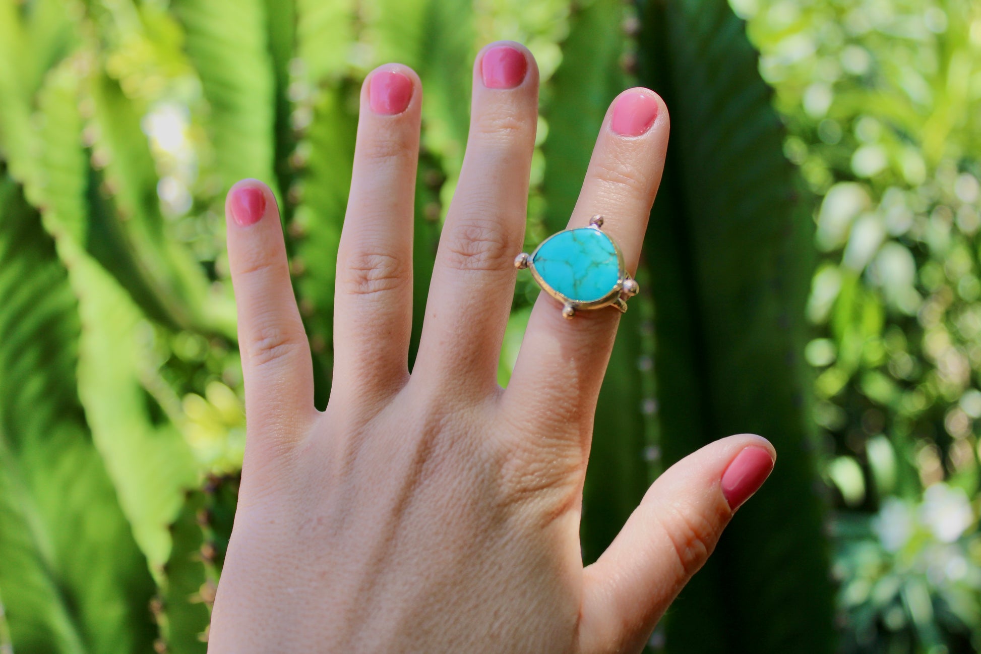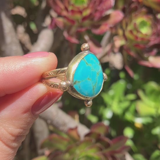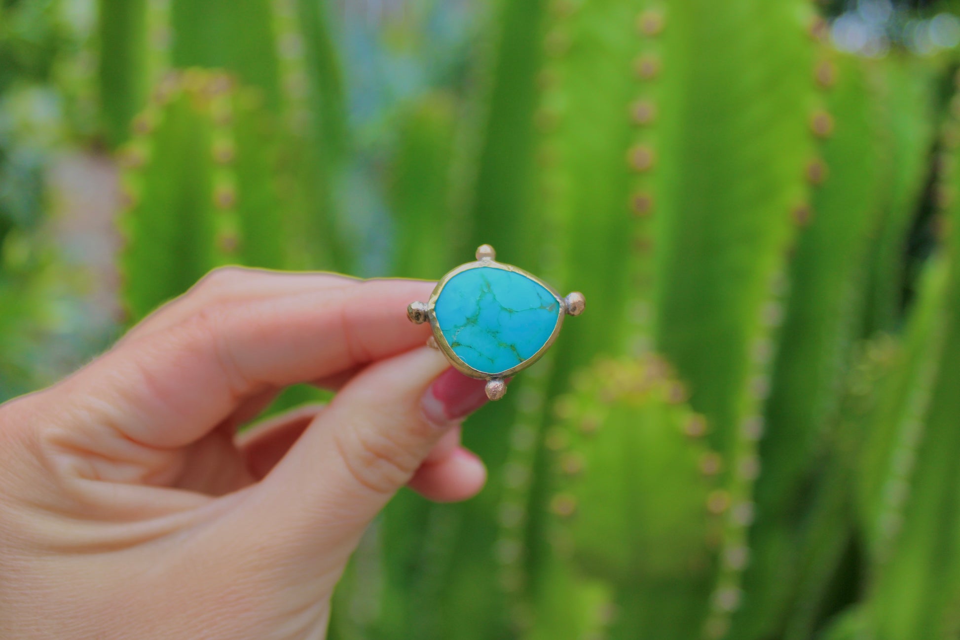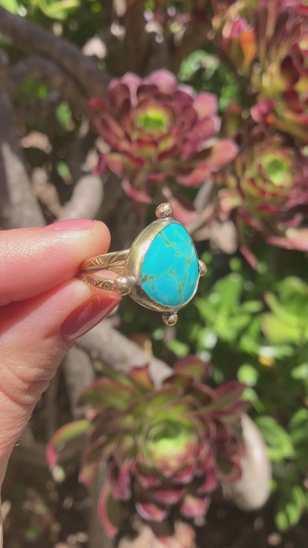 Size 7.5 . This ring is entirely handmade with Jewelers Brass with Sonoran Turquoise on a hand stamped double ring shank.