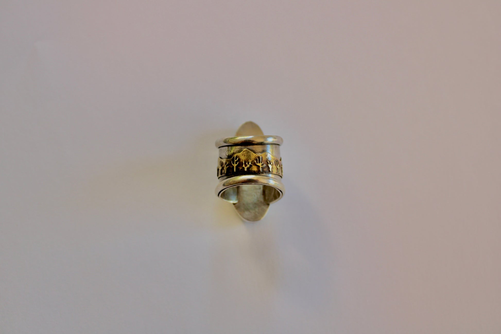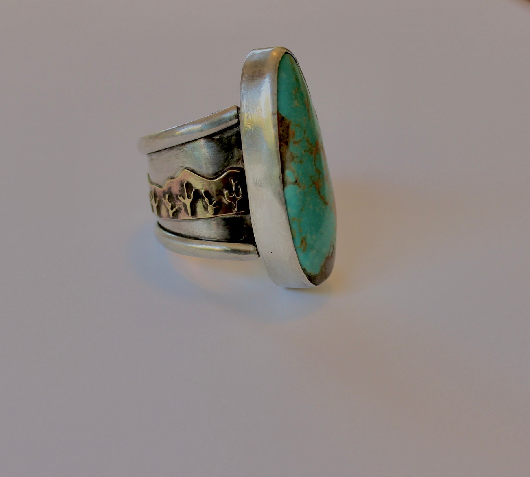 Size 7.5 -Handmade Sterling Silver statement ring with Turquoise Cabochon set in a handmade Sterling Silver ring shank with brass cactus desert scenery embellishment.