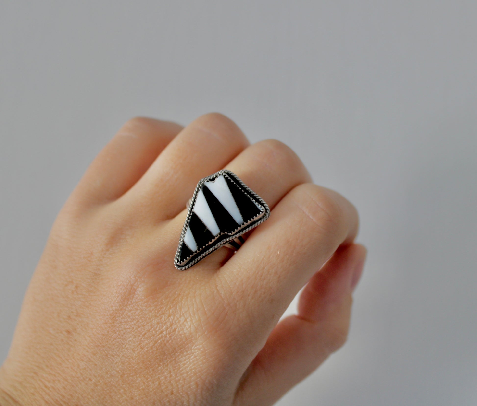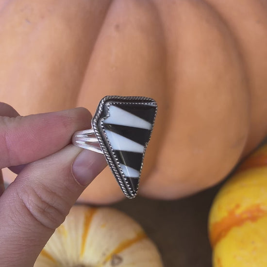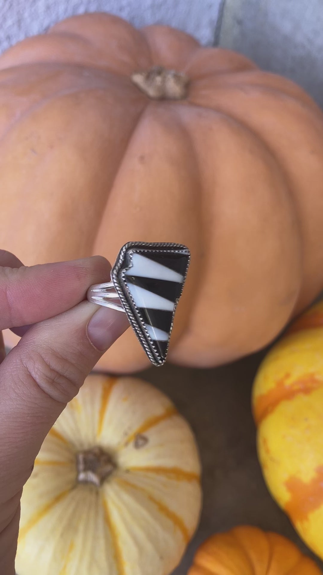 Size 7.5 lightening bolt ring set in Sterling Silver on a triple Sterling ring shank with roped border design.