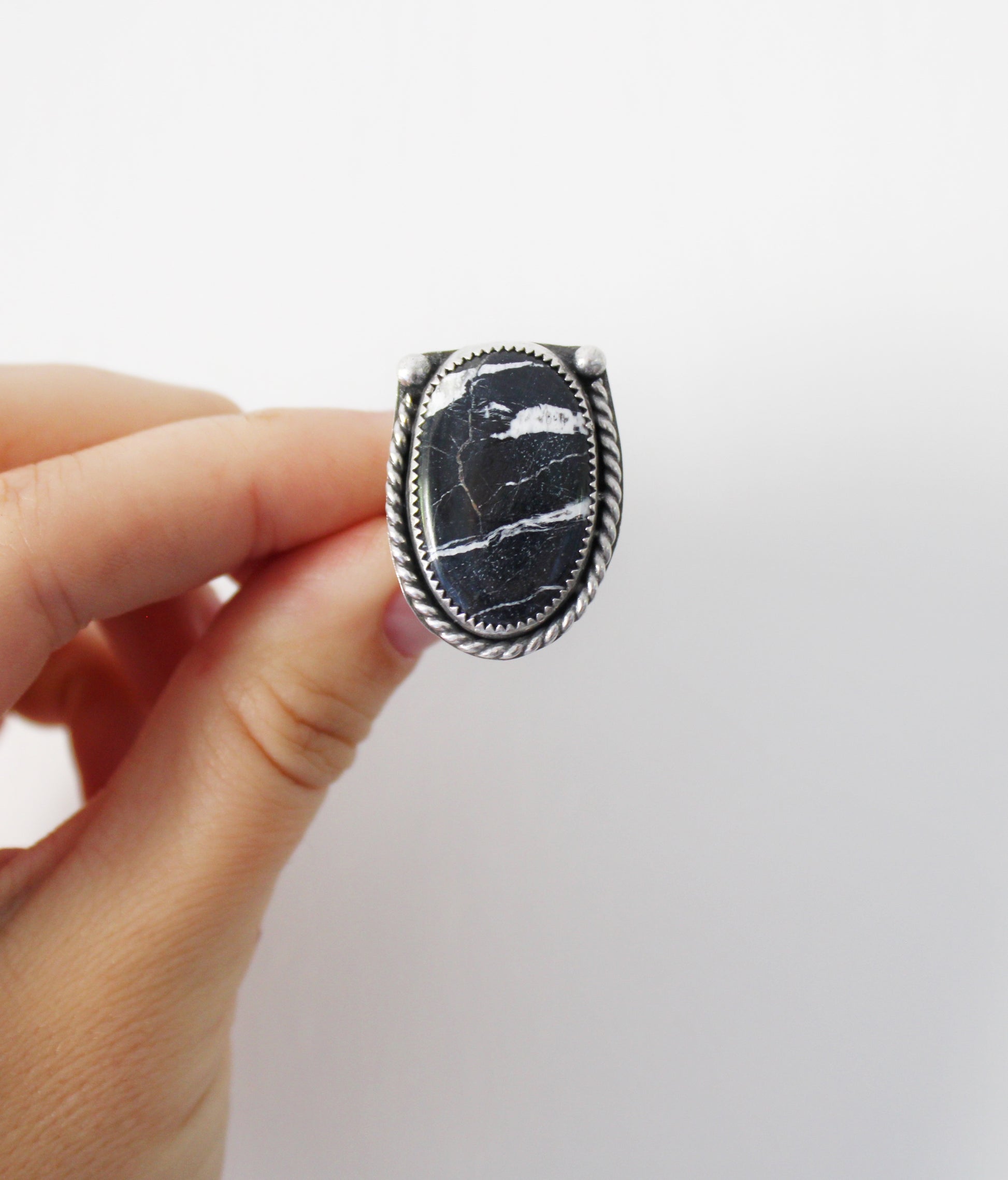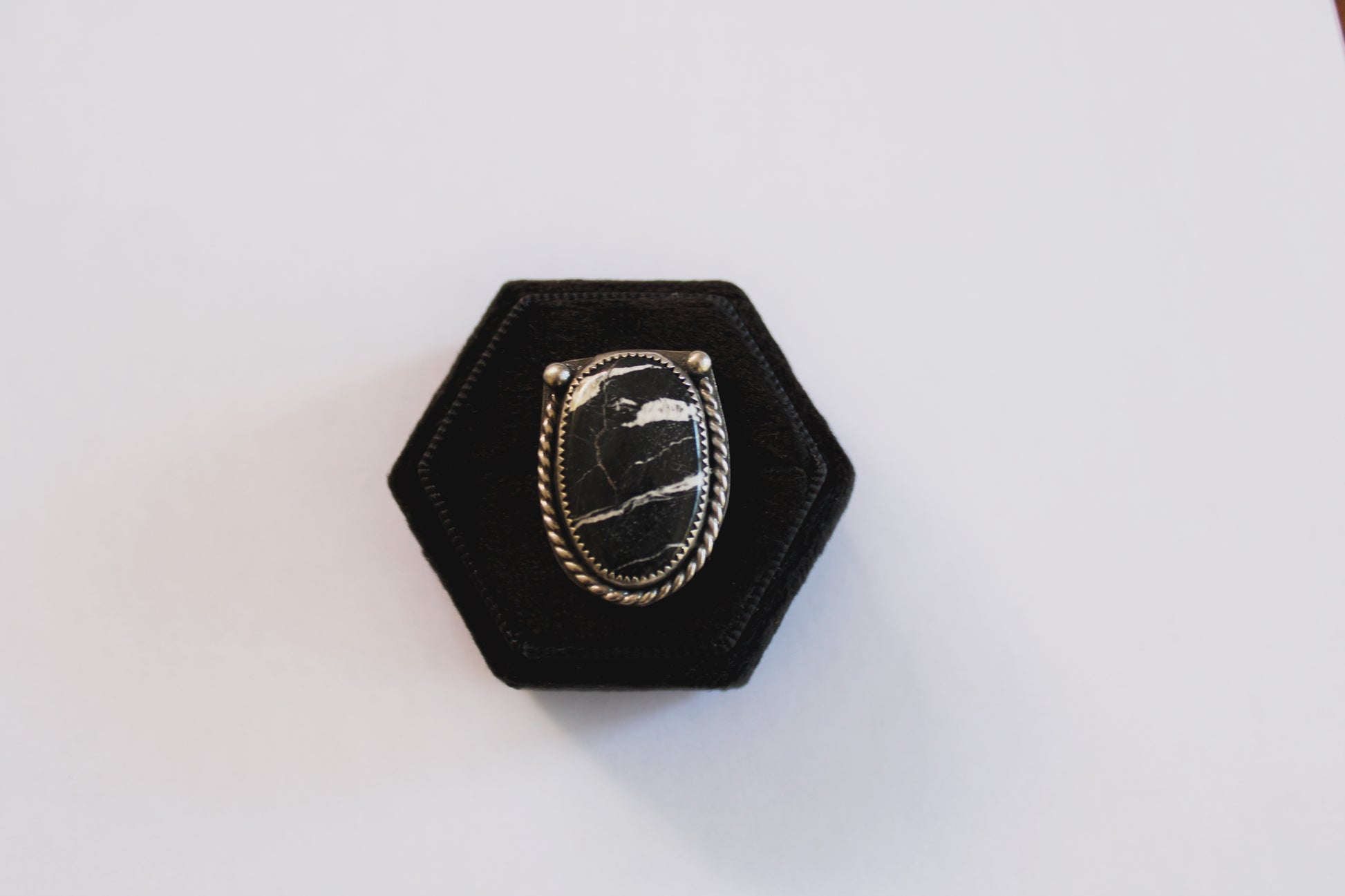 Size 7. Handmade Sterling Silver statement ring with White Buffalo Turquoise with a triple Sterling Silver ring shank.