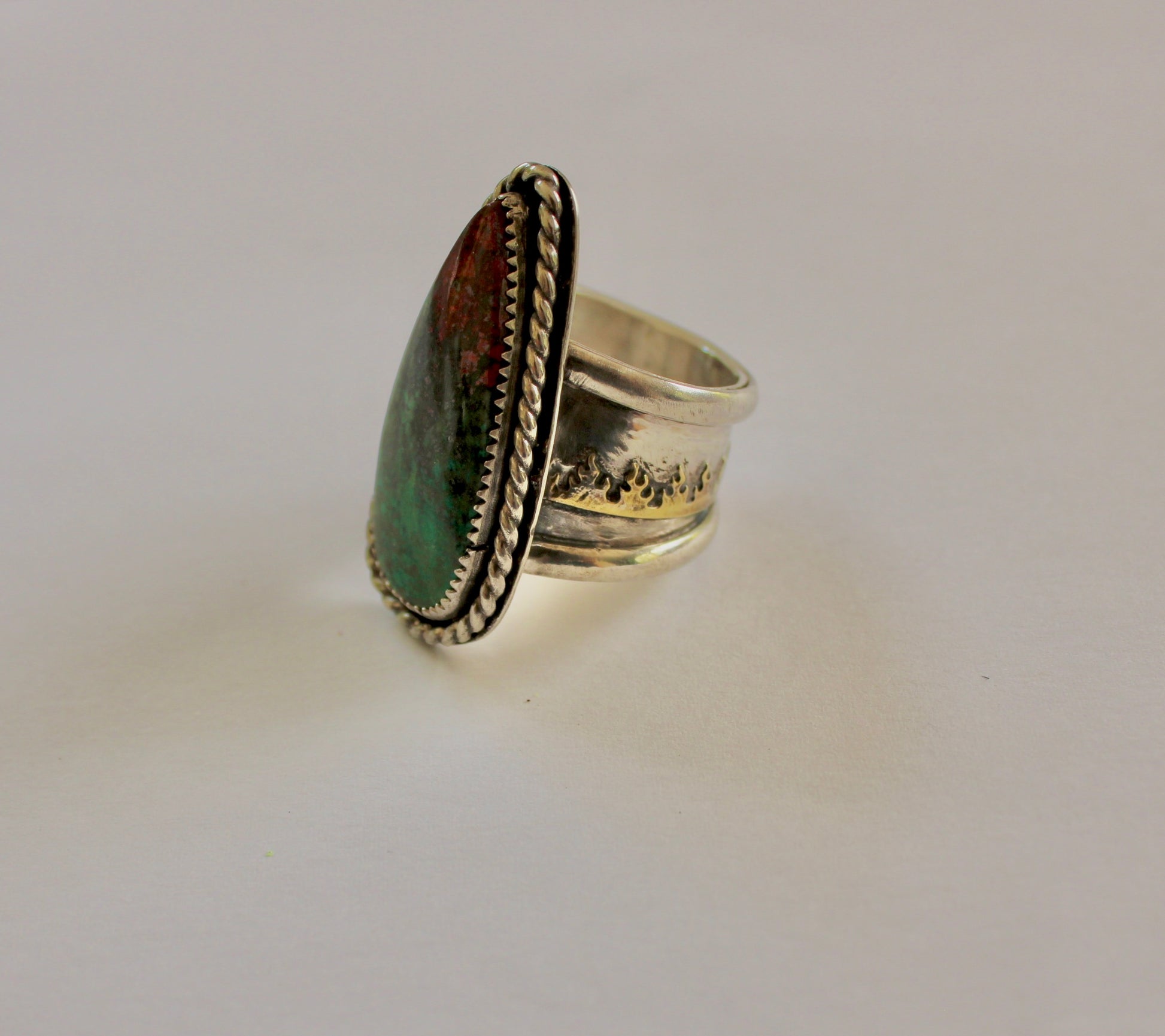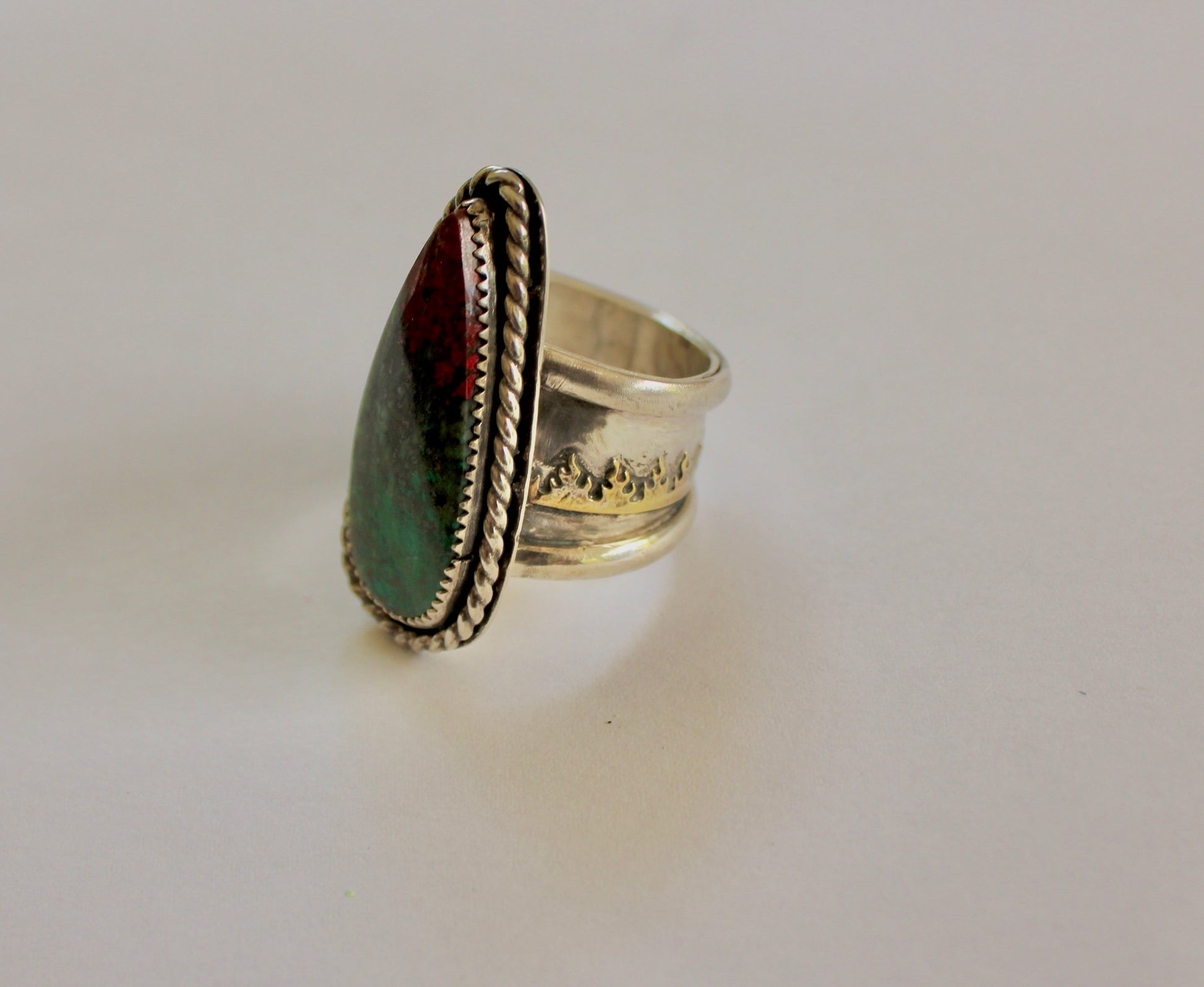 Size 8.5 -Handmade Sterling Silver statement ring with Sonoran Sunrise Cabochon set in a handmade Sterling Silver ring shank with brass flame embellishment.