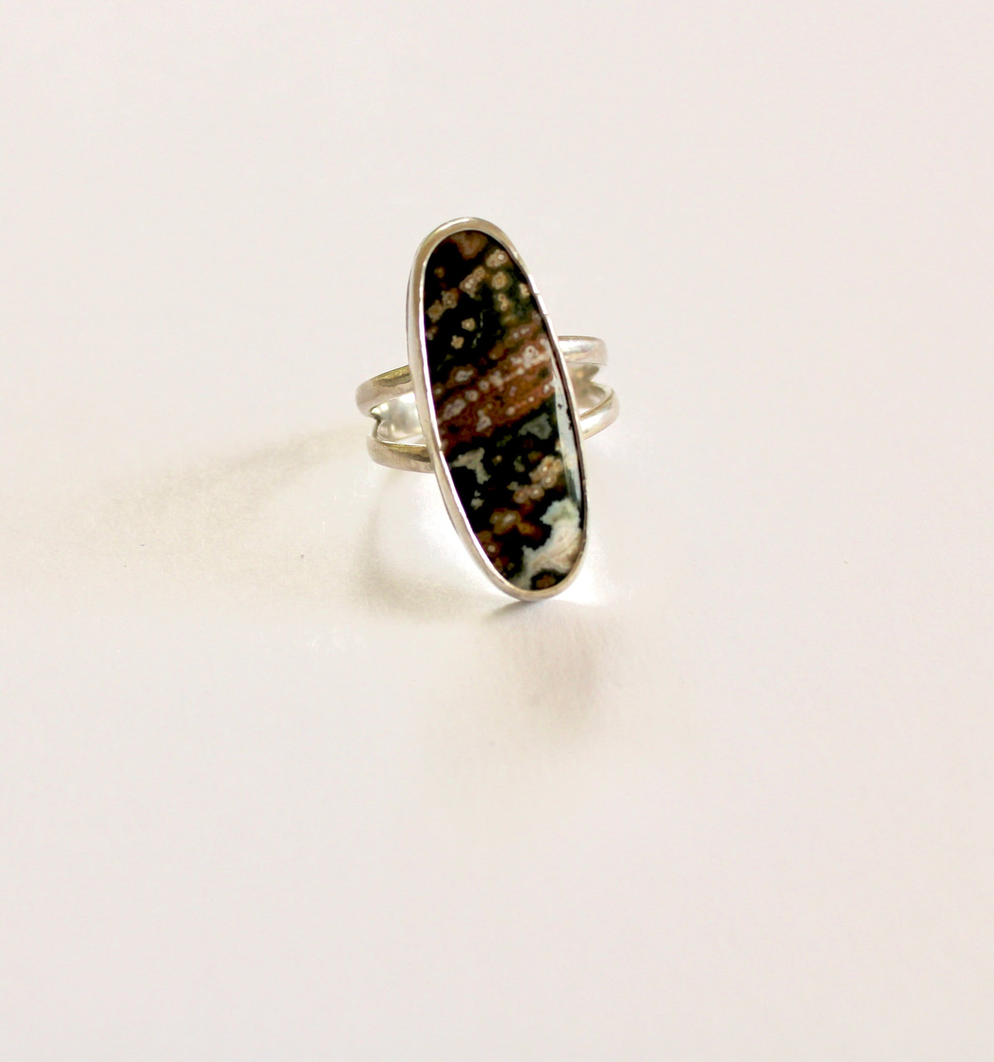 Size 9 3/4 - Ocean Jasper Ring, Sterling Silver. On a handmade double ring shank, hand stamped.