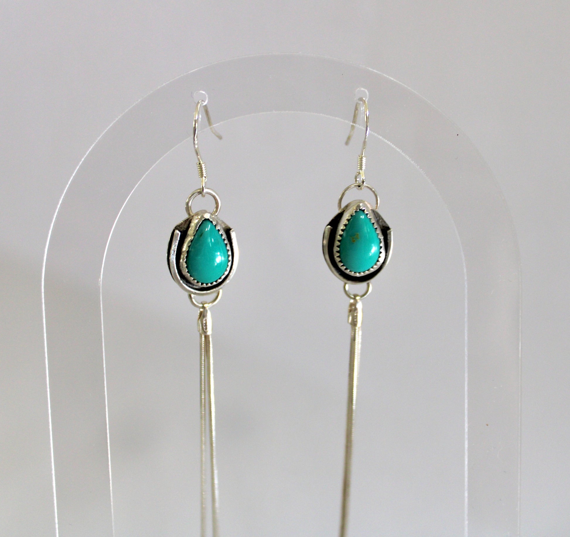 Sonoran Turquoise Earrings set in Sterling Silver with a Sterling snake chain tassel. Ear wire is also made from Sterling. Hangs just about 5 inches long, very light