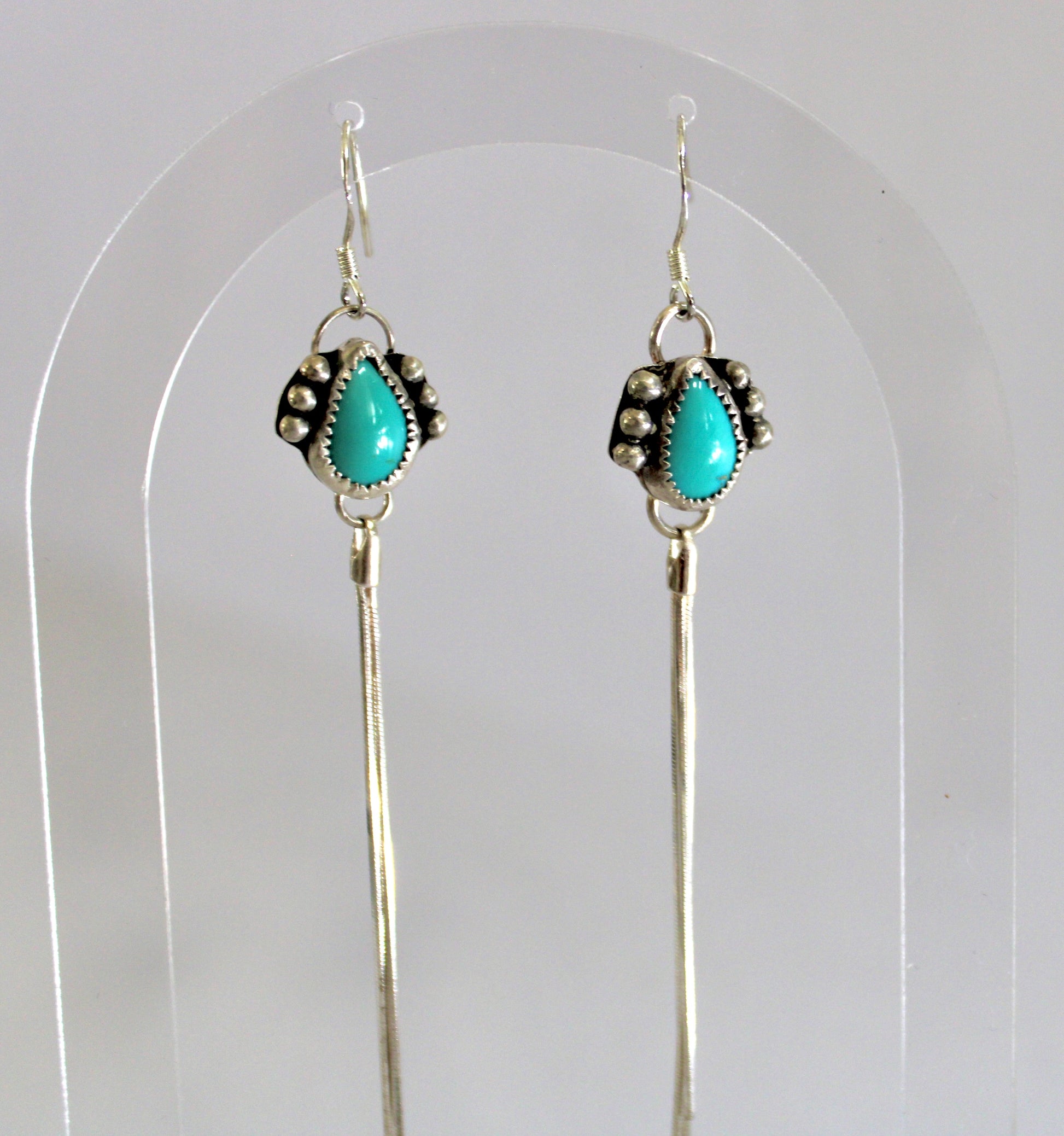 Sonoran Turquoise Earrings set in Sterling Silver with a Sterling snake chain tassel. Ear wire is also made from Sterling. Hangs just about 5 inches long, very light