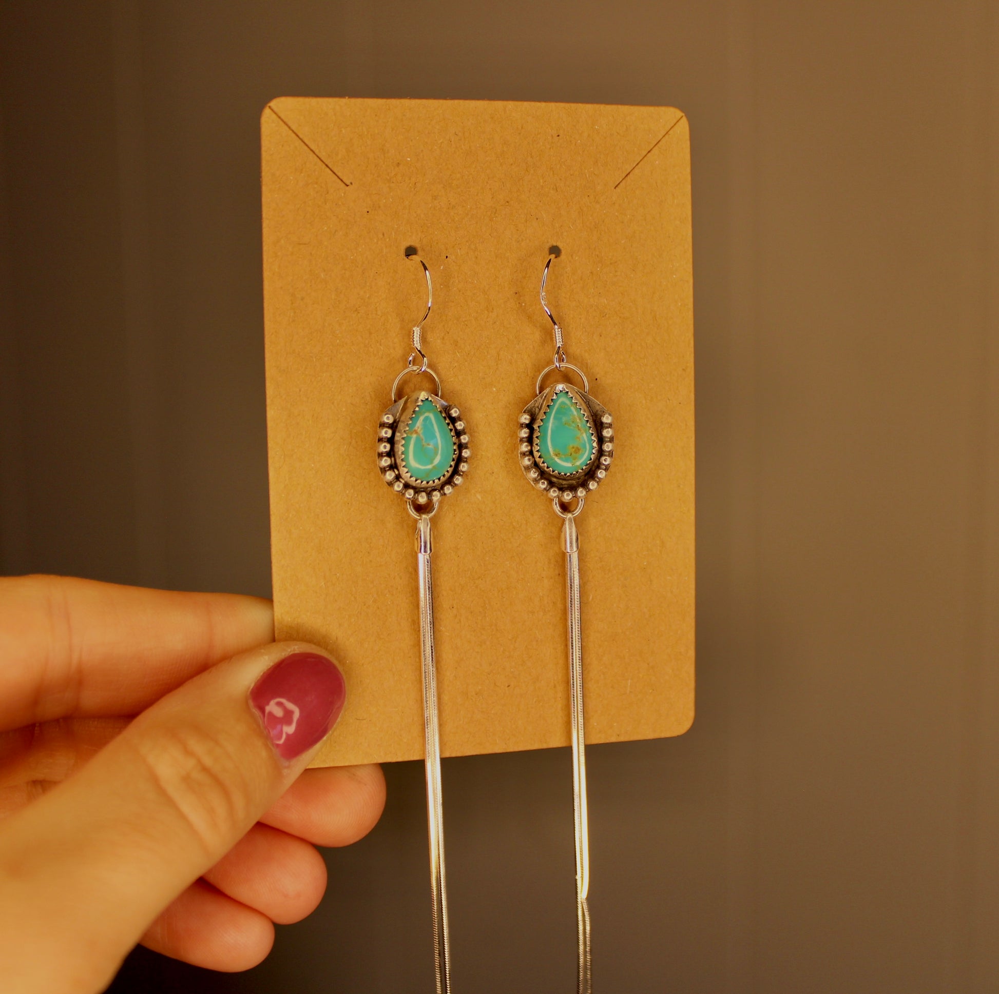 Sonoran Turquoise Earrings set in Sterling Silver with a Sterling snake chain tassel. Ear wire is also made from Sterling. Hangs just about 5 inches long, very light