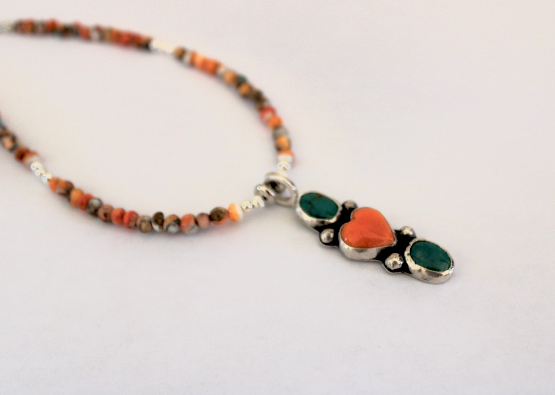 Spiny Oyster heart and Kingman trio set in Sterling Silver on a Spiny Oyster beaded necklace 16 inches with Sterling Silver beads. Sterling Silver lobster clasp.