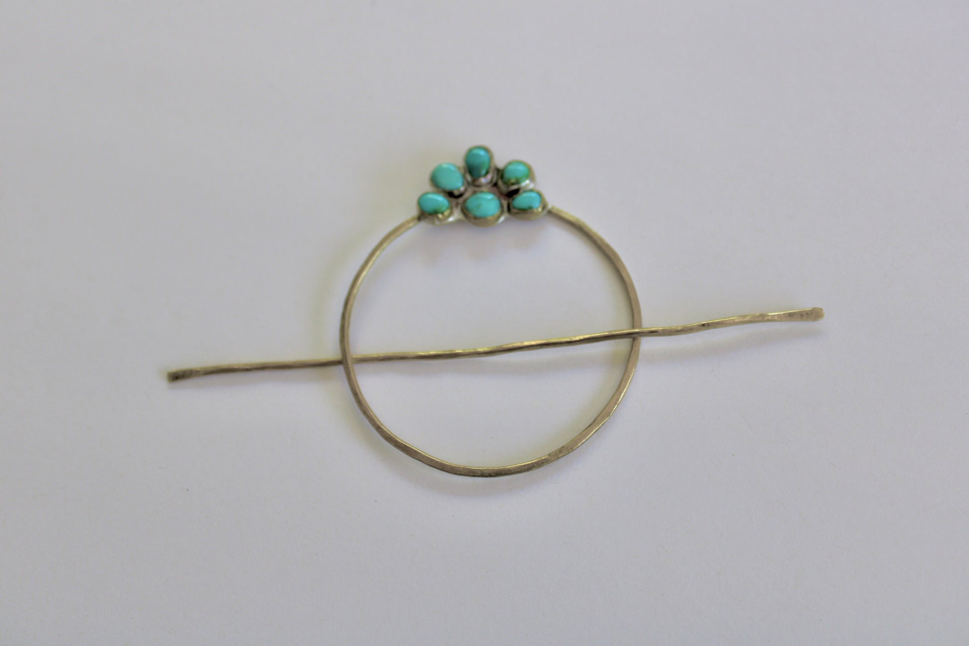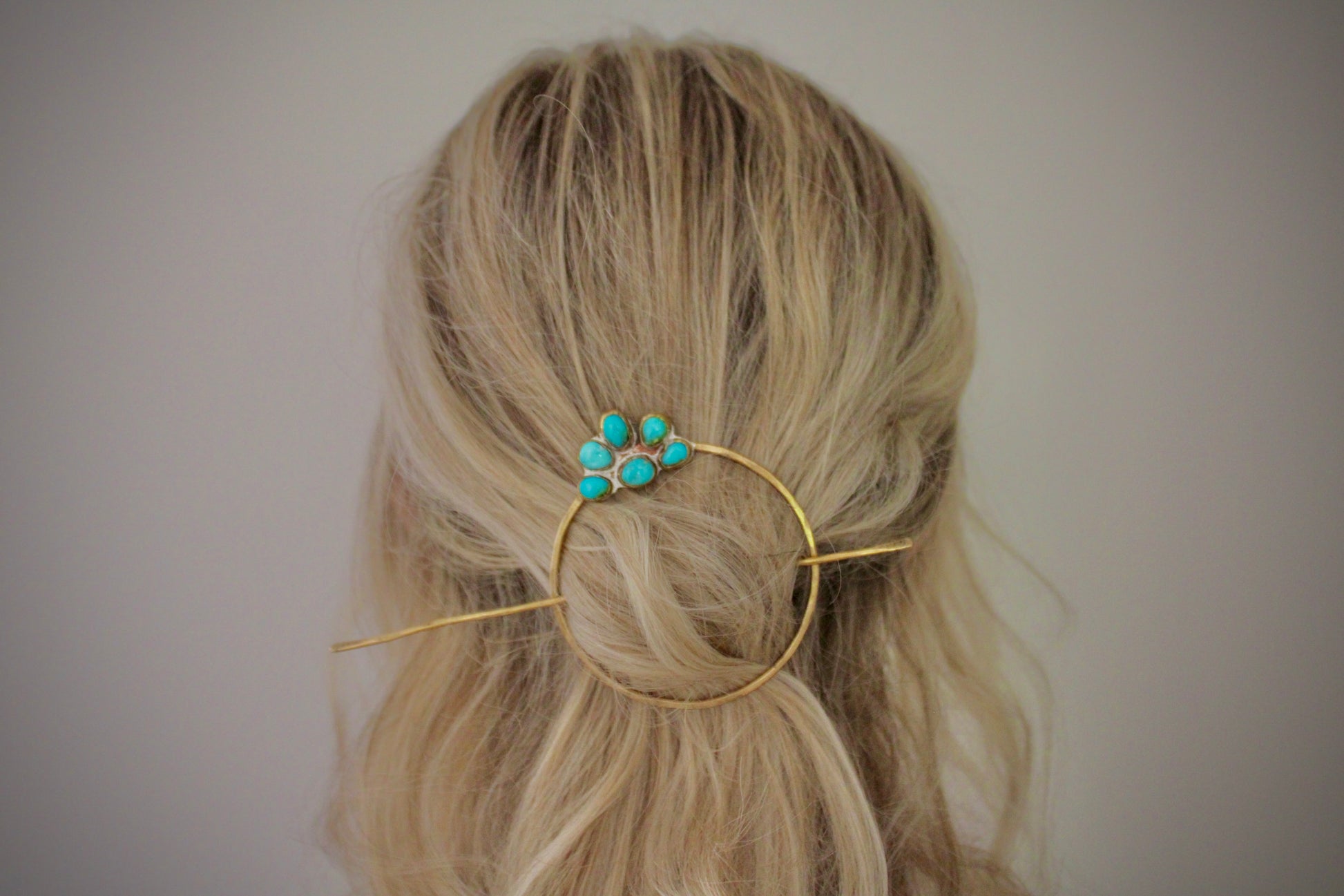 Sonoran Gold Turquoise hair pin made from jewelry brass. This piece is entirely handmade and the brass has a hammered style. Comes with a 6 inch pin for hair piece.