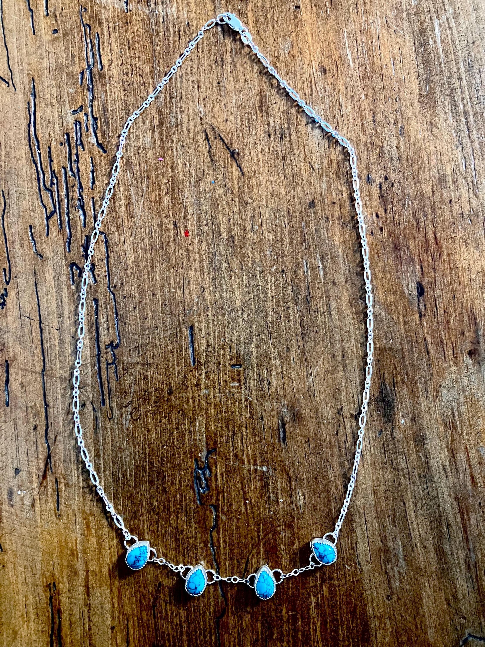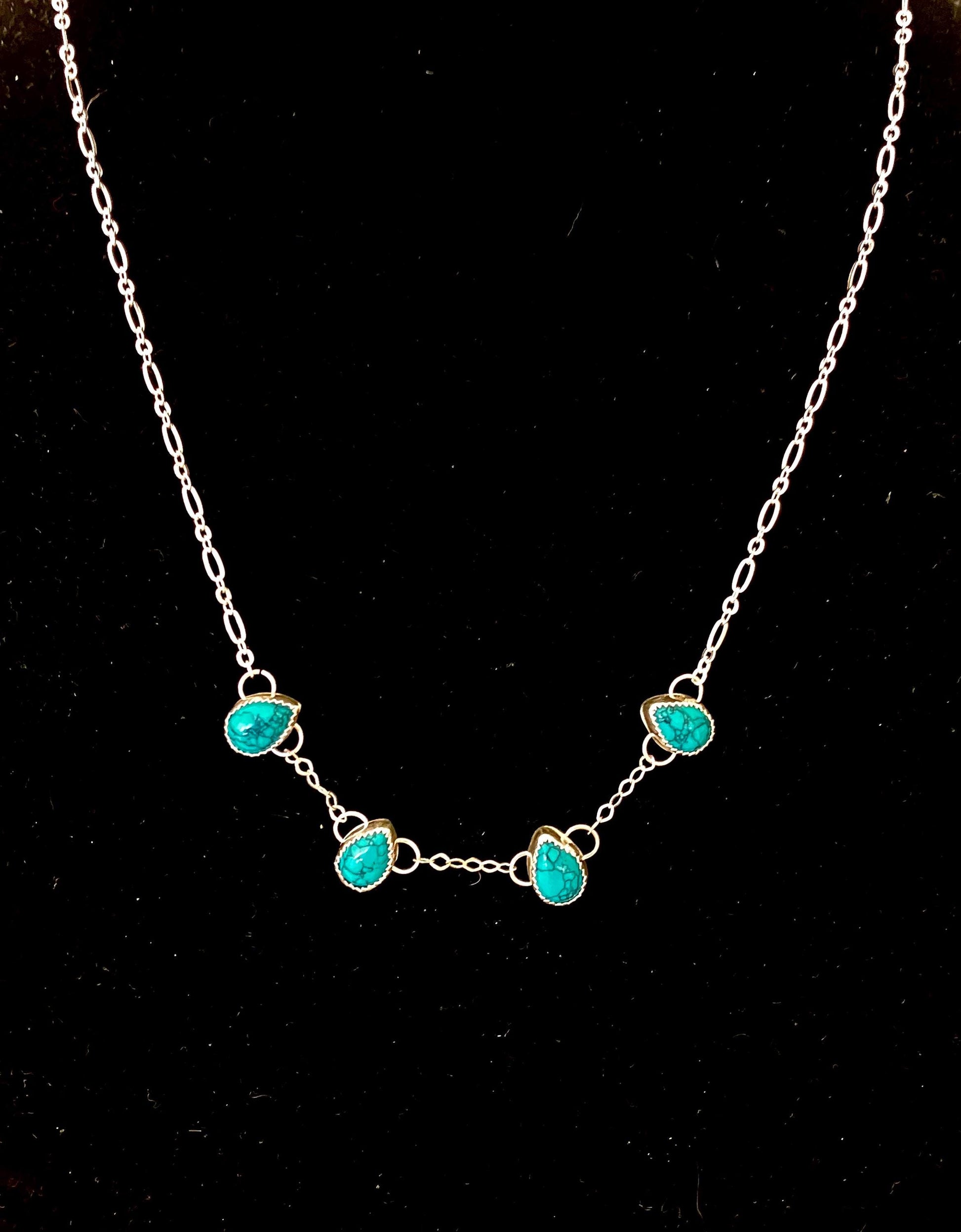 Cluster necklace with Turquoise teardrops. Lobster clasp, chain is Sterling Silver. Back plates made from Sterling silver. 18 inch necklace.