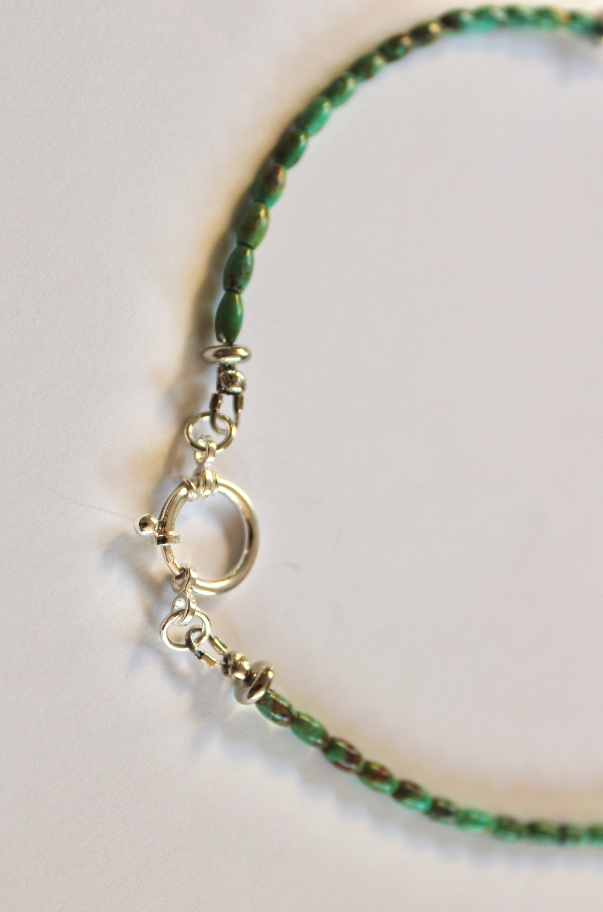 Tyrone Turquoise barrel bead charm necklace. 18 inches long with a Sterling Silver chain on top half with a lobster clasp. Charm clasp is Sterling silver, charms not included.