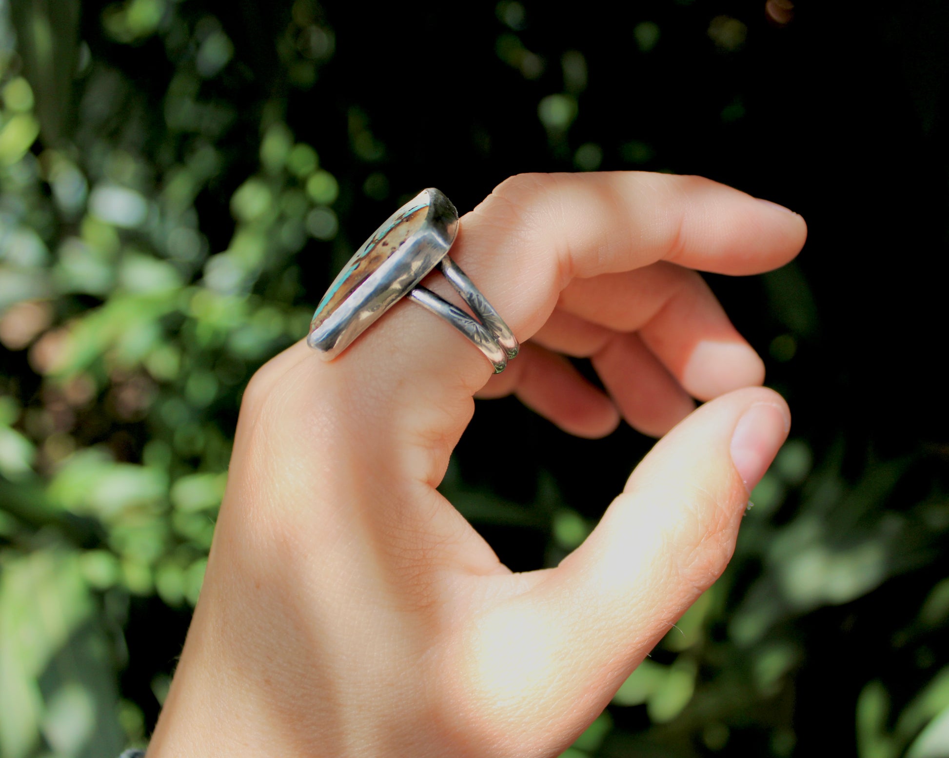 Size 9.5 -Handmade Sterling Silver statement ring with Royston Ribbon Turquoise set in a handmade Sterling Silver ring shank.