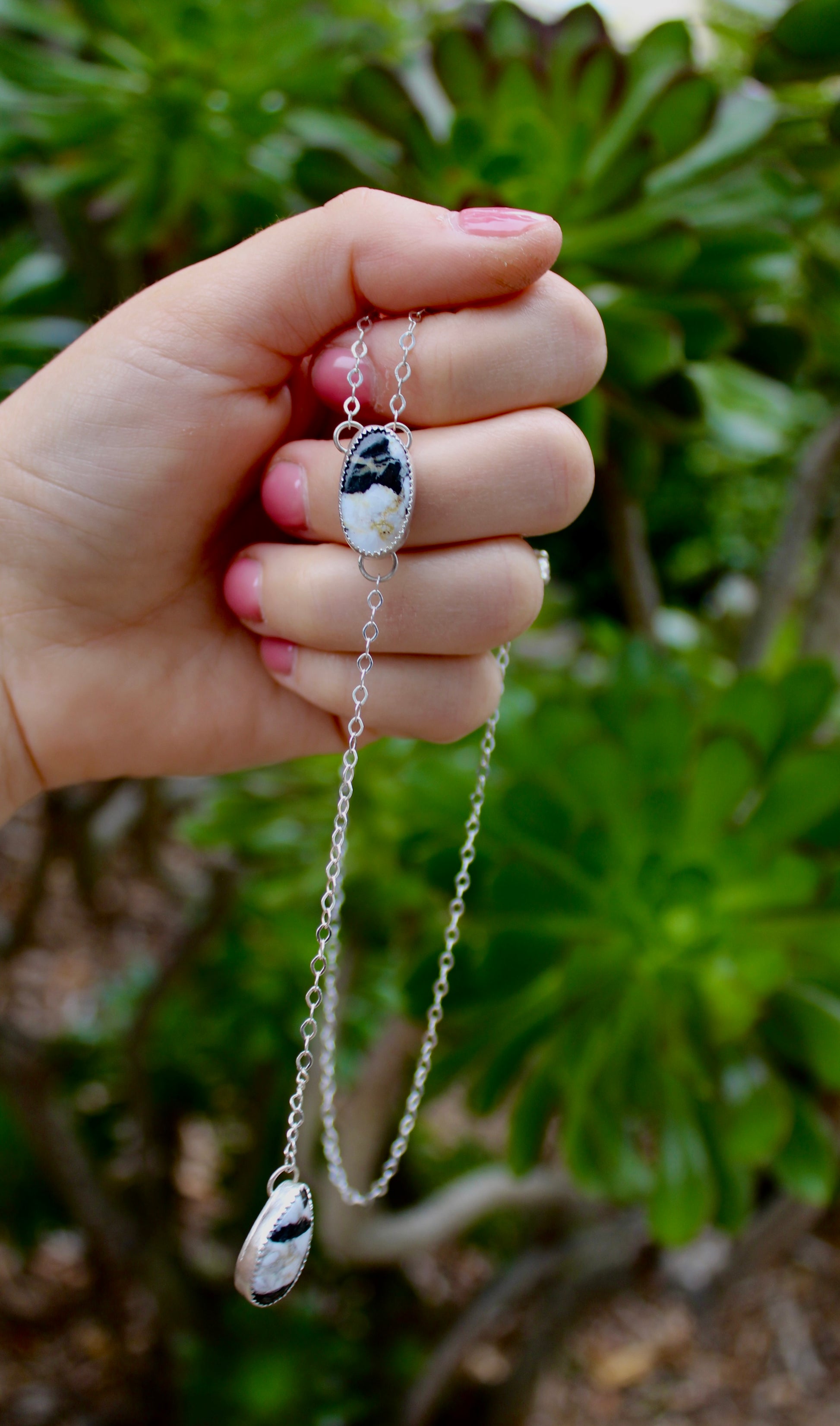White Buffalo Turquoise Lariat Necklace. Silver filled Rolo chain and lobster clasp. Chain is 18 inches and chain from top stone to bottom stone is 4 inches.