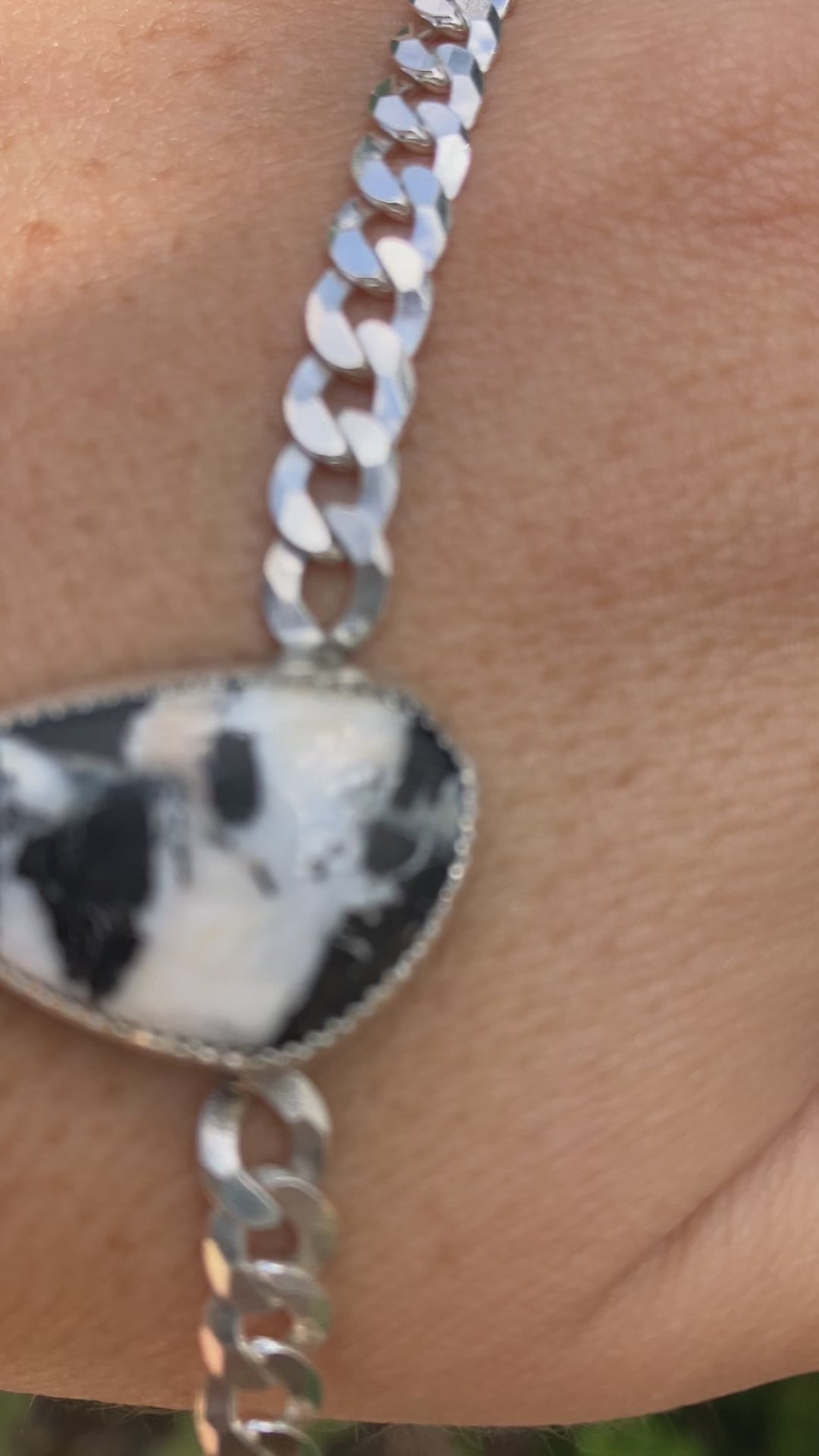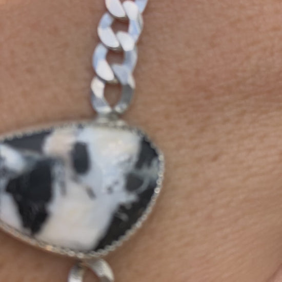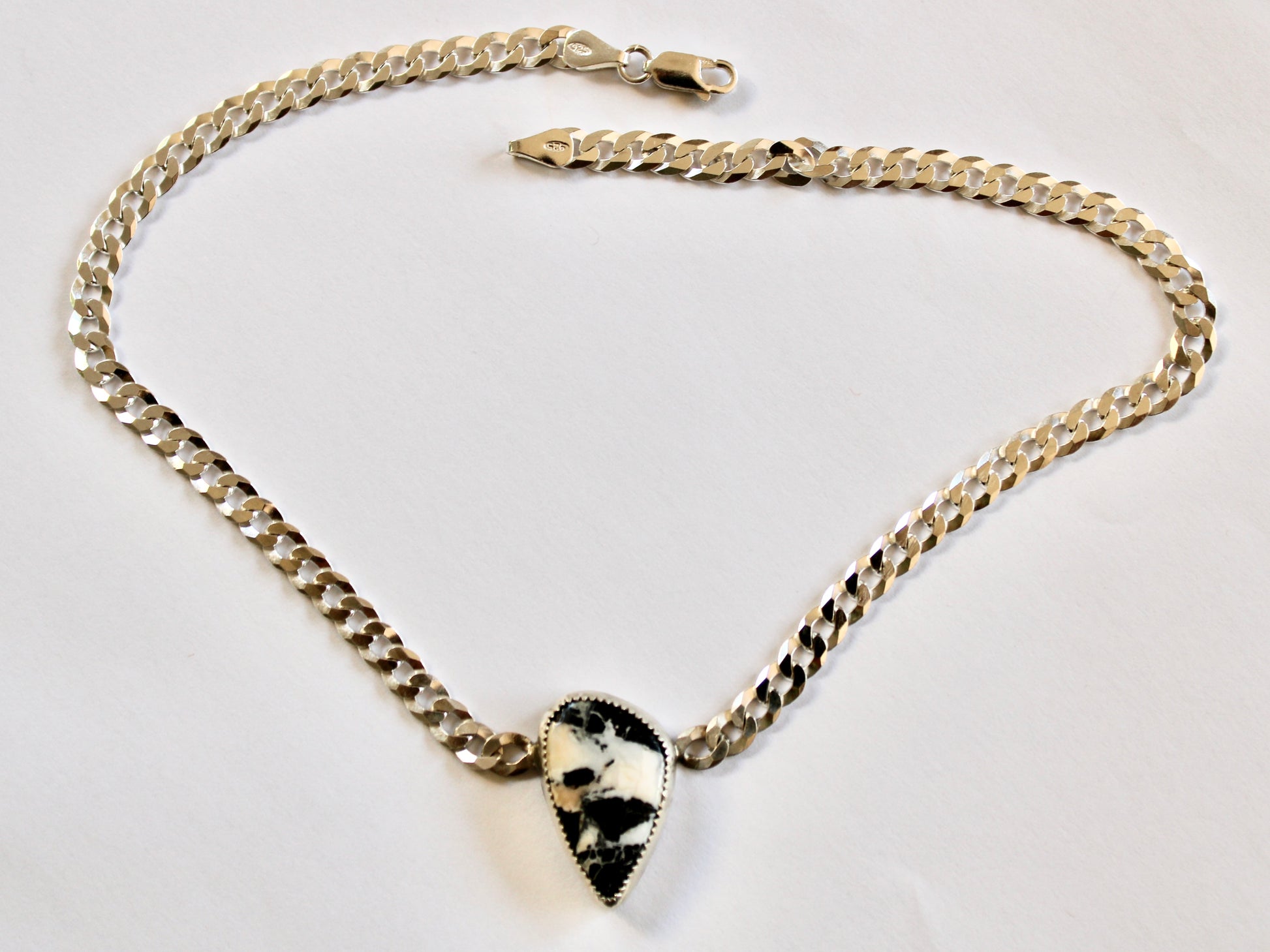 White Buffalo Turquoise choker Necklace 14 inches, not adjustable. Sterling Silver Curb Chain 5.3MM. Sterling Lobster clasp.