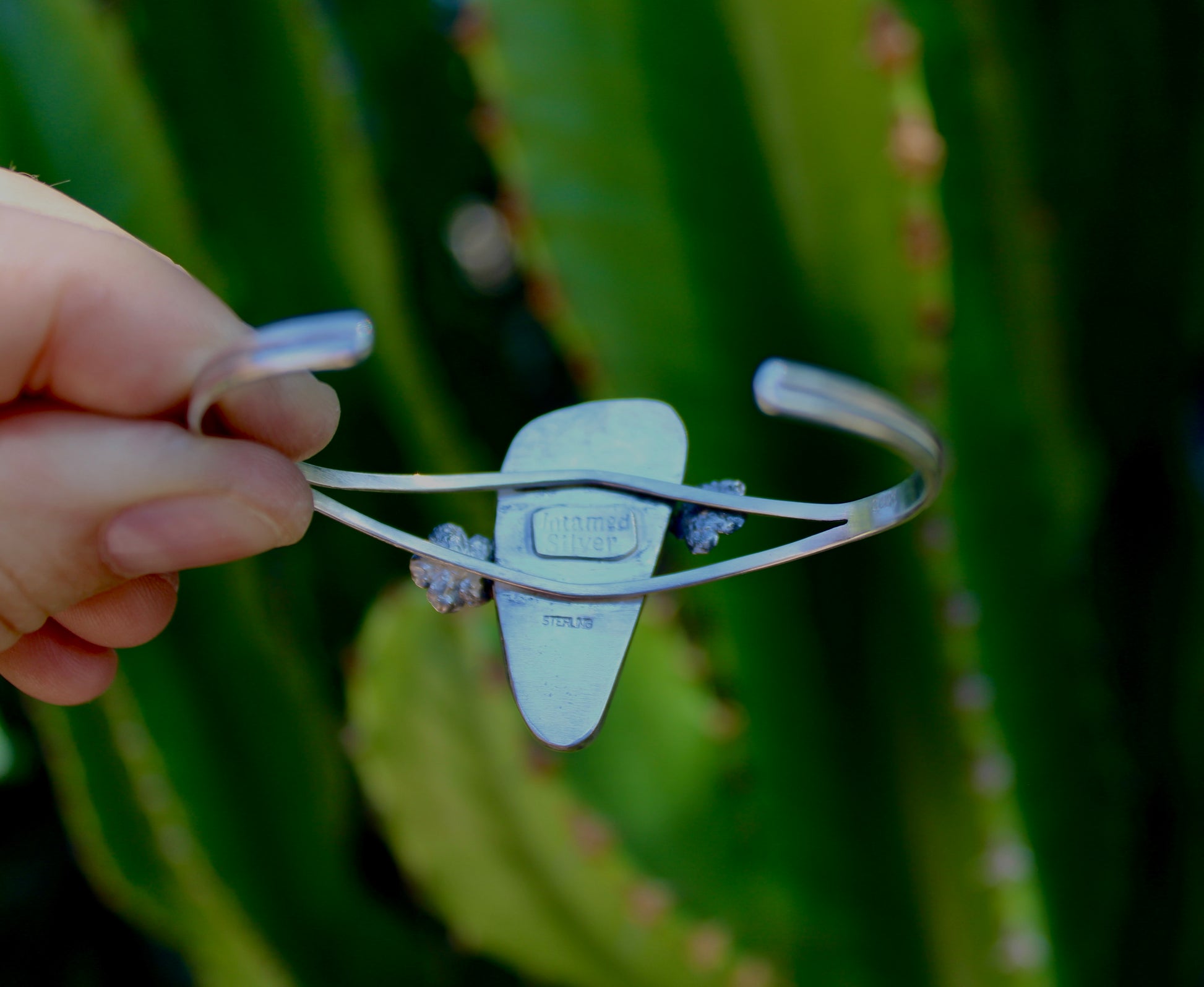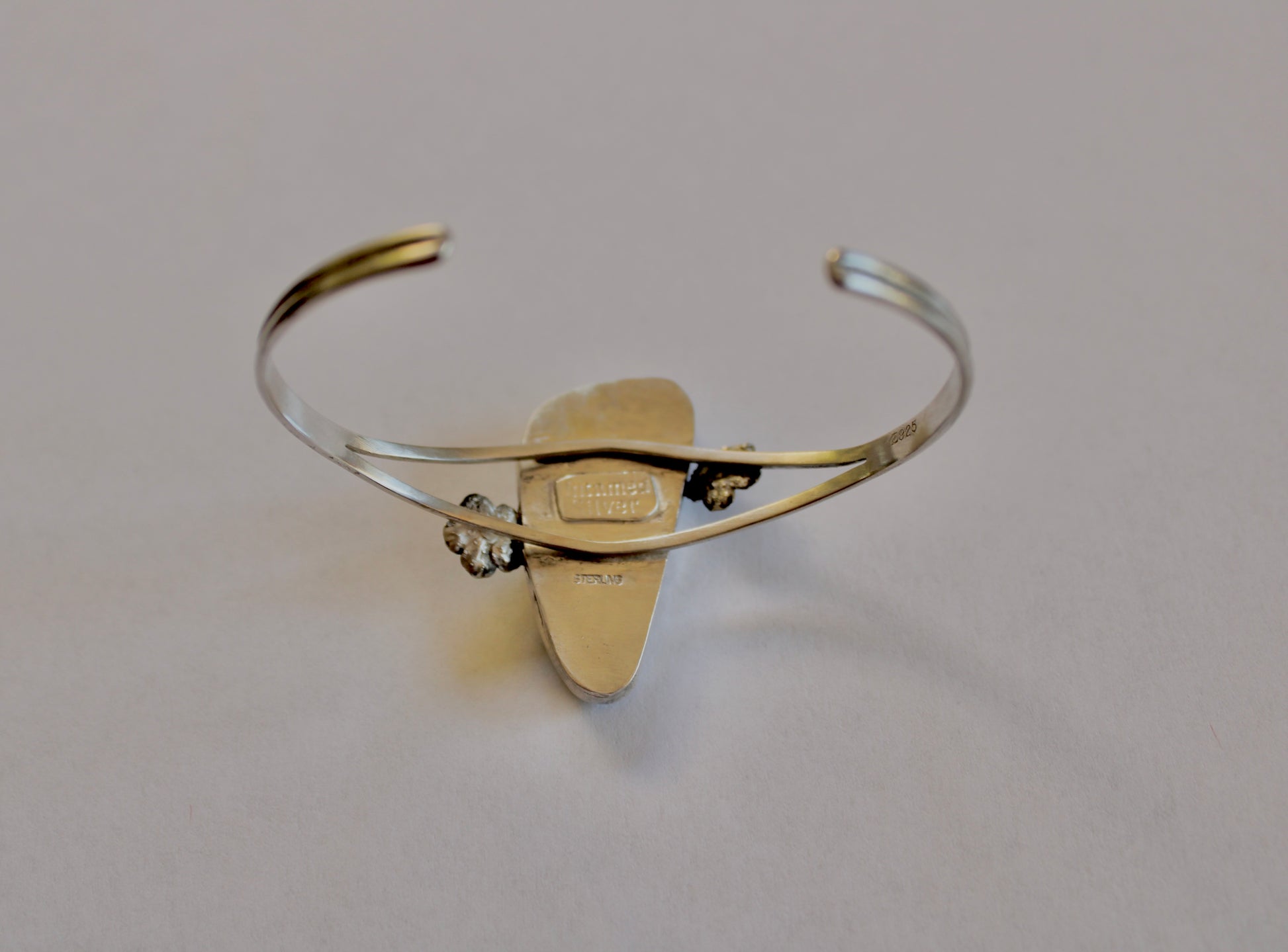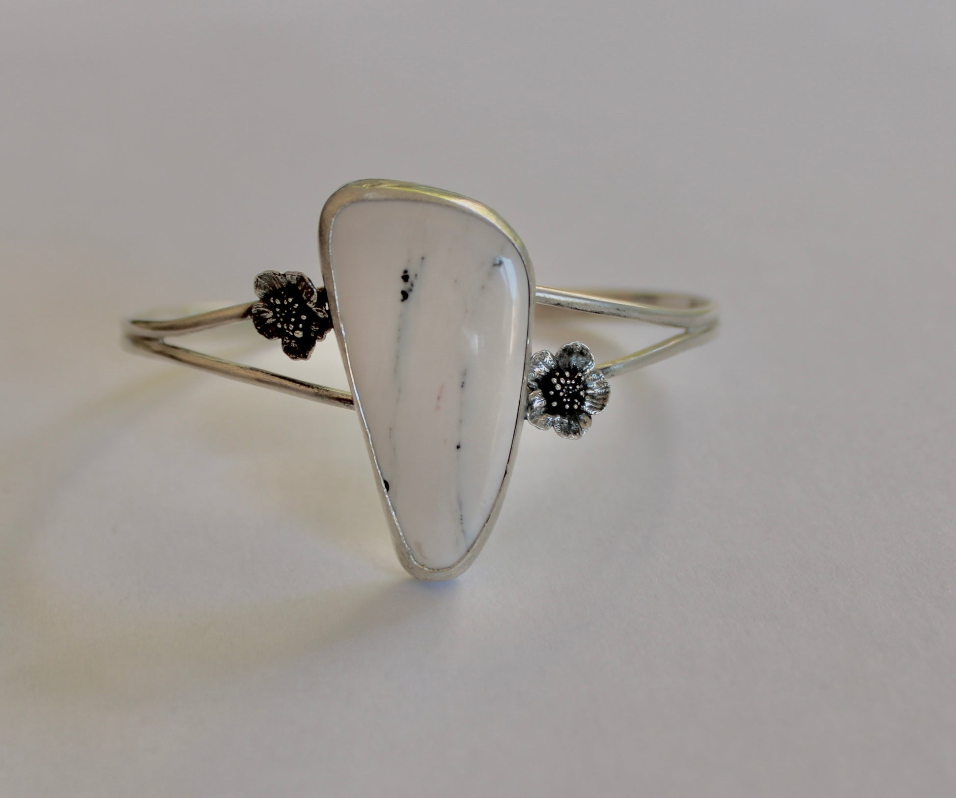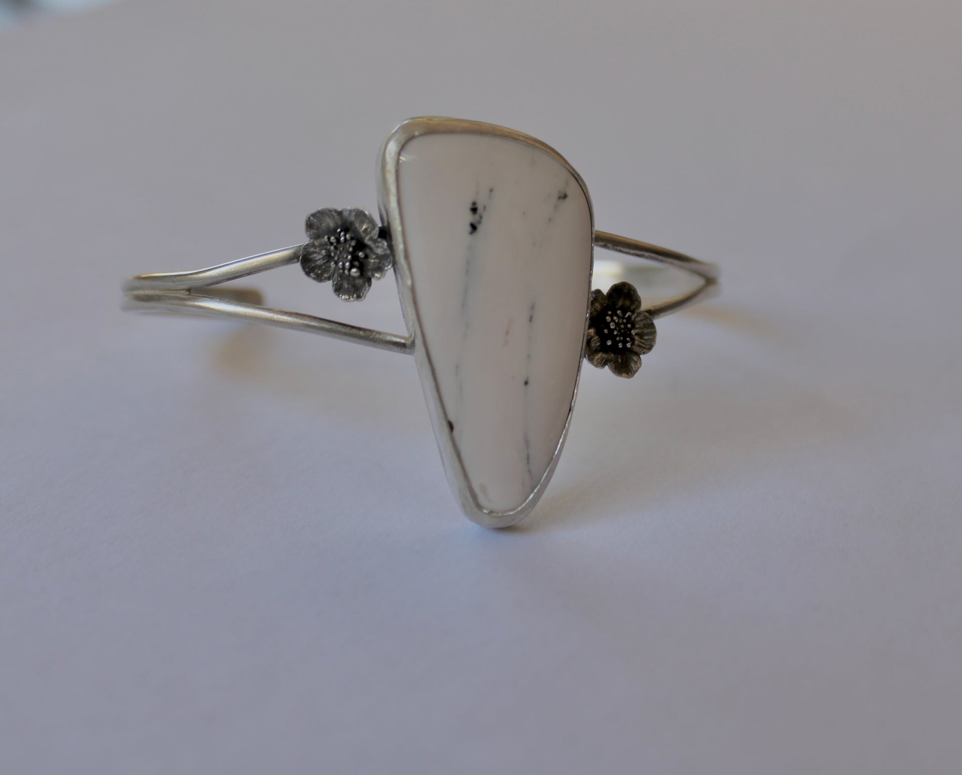 White Buffalo Turquoise Cuff set in Sterling Silver on a Sterling double cuff. Floral accents Sterling Silver.