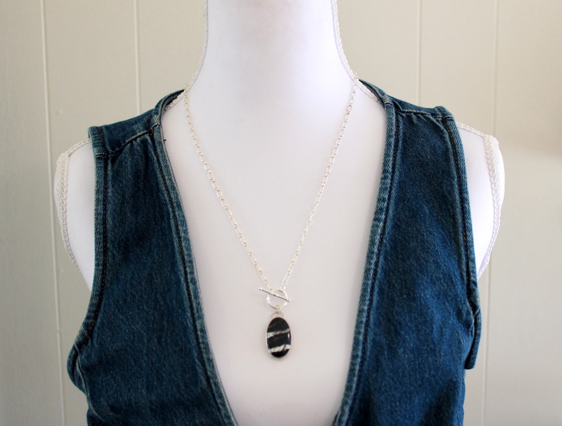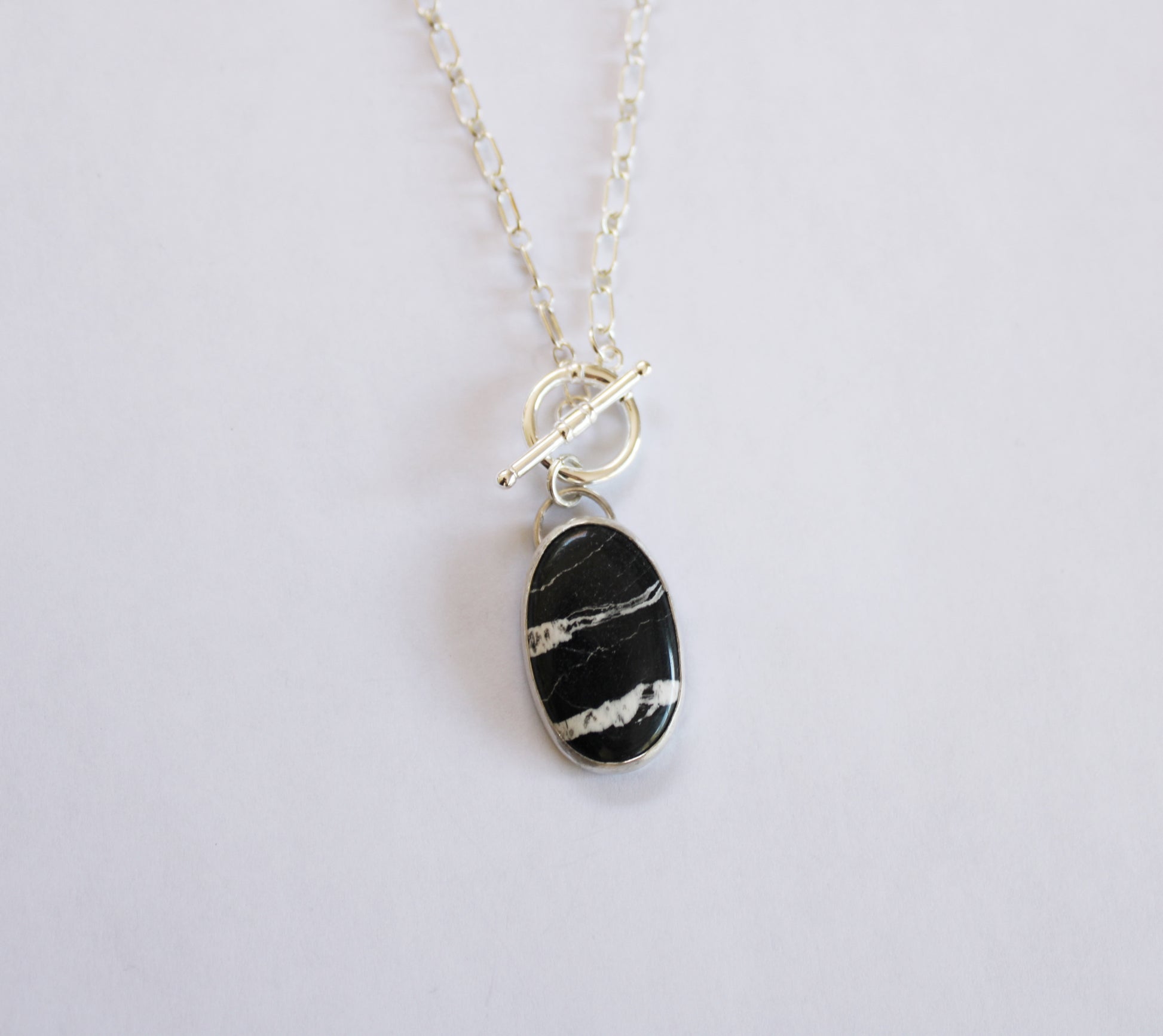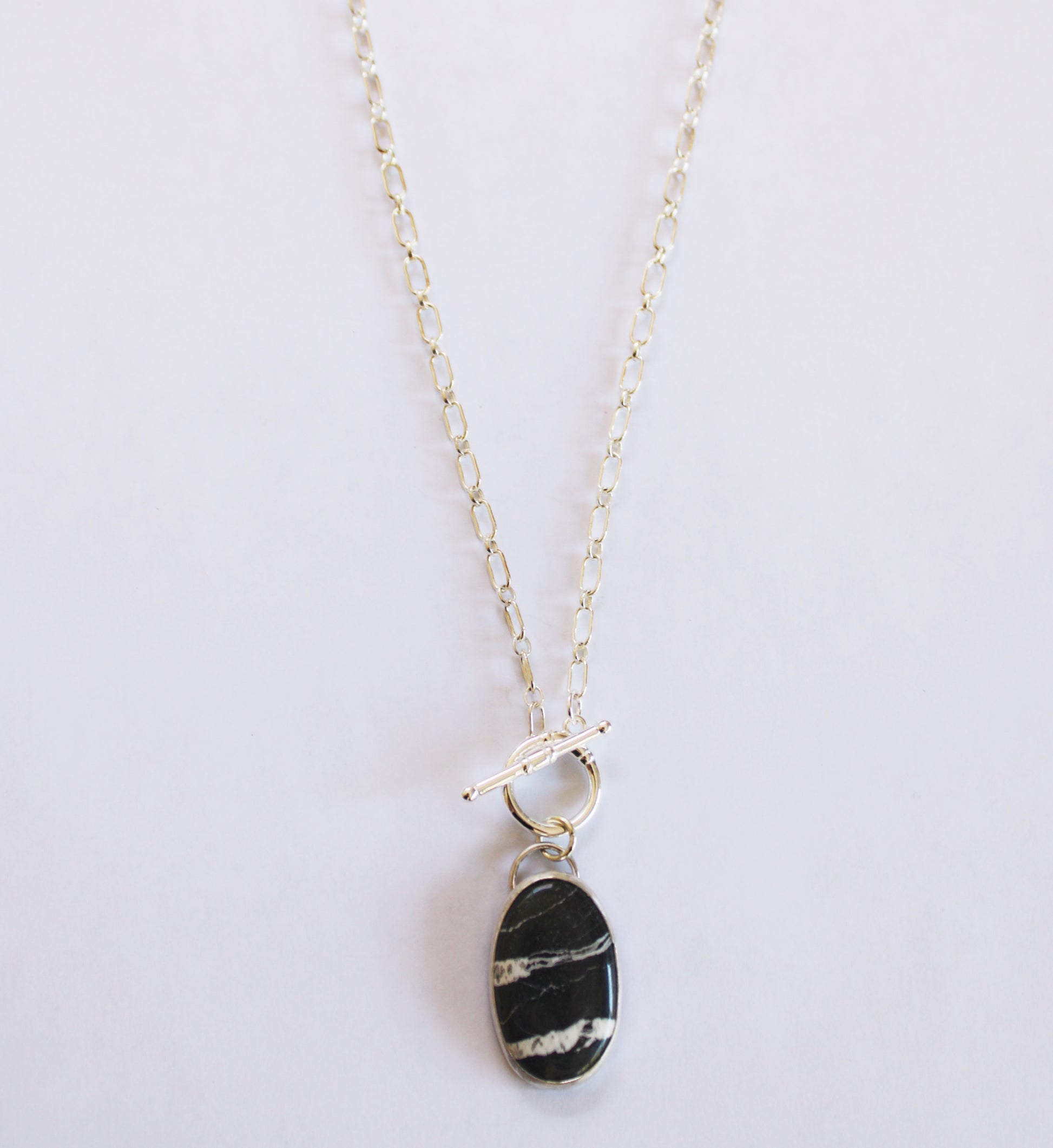 White Buffalo Turquoise Toggle Necklace. Sterling Silver cable chain and togglw clasp. Chain is 20 inches.